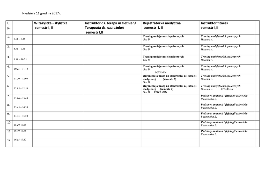 Niedziela 11 grudnia 2017r. L p. 1. 2. 3. 4. Wizażystka - stylistka semestr I, II Instruktor ds. terapii uzależnieo/ Terapeuta ds. uzależnieo semestr I,II Rejestratorka medyczna semestr I, II Instruktor fitness semestr I,II 8.00 – 8.45 Trening umiejętności społecznych Gul D. Trening umiejętności społecznych Halama A. 8.45 – 9.30 Trening umiejętności społecznych Gul D. Trening umiejętności społecznych Halama A. 9.40 – 10.25 Trening umiejętności społecznych Gul D. Trening umiejętności społecznych Halama A. 10.25 – 11.10 Trening umiejętności społecznych Gul D. Trening umiejętności społecznych Halama A. EGZAMIN 5. 6. 7. 8. 9. 10 11.20 – 12.05 12.05 – 12.50 Organizacja pracy na stanowisku rejestracji medycznej (semestr 2) Gul D. Organizacja pracy na stanowisku rejestracji medycznej (semestr 2) Gul D. EGZAMIN Trening umiejętności społecznych Halama A. Trening umiejętności społecznych Halama A. EGZAMIN 13.00 – 13.45 Podstawy anatomii i fizjologii człowieka Bachowska B. 13.45 – 14.30 Podstawy anatomii i fizjologii człowieka Bachowska B. 14.35 – 15.20 Podstawy anatomii i fizjologii człowieka Bachowska B. 15.20-16.05 Podstawy anatomii i fizjologii człowieka Bachowska B. 11 16.10-16.55 12 16.55-17.40 Podstawy anatomii i fizjologii człowieka Bachowska B. Niedziela 11 grudnia 2017r. L p. 1. 2. 3. 4. 5. 6. 7. 8. 9. 10 Specjalista ds. żywienia człowieka i dietetyki semestr I 8.00 – 8.45 8.45 – 9.30 9.40 – 10.25 10.25 – 11.10 11.20 – 12.05 12.05 – 12.50 13.00 – 13.45 13.45 – 14.30 14.35 – 15.20 15.20-16.05 11 16.10-16.55 12 16.55-17.40 Projektant grafiki komputerowej semestr I Biomasażysta - Fizjoterapia semestr I