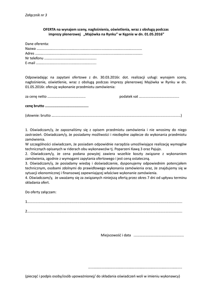 Załącznik nr 3 OFERTA na wynajem sceny, nagłośnienia, oświetlenia, wraz z obsługą podczas imprezy plenerowej „Majówka na Rynku” w Kępnie w dn. 01.05.2016” Dane oferenta: Nazwa ……………………………………………………………………………………………………… Adres ……………………………………………………………………………………………………….. Nr telefonu …………………………………………………. E-mail …………………………………………………………. Odpowiadając na zapytani ofertowe z dn. 30.03.2016r. dot. realizacji usługi: wynajem sceny, nagłośnienie, oświetlenie, wraz z obsługą podczas imprezy plenerowej Majówka w Rynku w dn. 01.05.2016r. oferuję wykonanie przedmiotu zamówienia: za cenę netto ….................................... podatek vat …...................................... cenę brutto …....................................... (słownie: brutto …................................................................................................................................) 1. Oświadczam/y, że zapoznaliśmy się z opisem przedmiotu zamówienia i nie wnosimy do niego zastrzeżeń. Oświadczam/y, że posiadamy możliwości i niezbędne zaplecze do wykonania przedmiotu zamówienia. W szczególności oświadczam, że posiadam odpowidnie narzędzia umożliwiające realizację wymogów technicznych opisanych w riderach obu wykonawców tj. Poparzeni Kawą 3 oraz Pajujo. 2. Oświadczam/y, że cena podana powyżej zawiera wszelkie koszty związane z wykonaniem zamówienia, zgodnie z wymogami zapytania ofertowego i jest ceną ostateczną. 3. Oświadczam/y, że posiadamy wiedzę i doświadczenie, dysponujemy odpowiednim potencjałem technicznym, osobami zdolnymi do prawidłowego wykonania zamówienia oraz, że znajdujemy się w sytuacji ekonomicznej i finansowej zapewniającej właściwe wykonanie zamówienia. 4. Oświadczam/y, że uważamy się za związanych niniejszą ofertą przez okres 7 dni od upływu terminu składania ofert. Do oferty załączam: 1............................................................................................................................................................. 2............................................................................................................................................................. Miejscowość i data ................................................... ………………………………………………………………………………………….. (pieczęć i podpis osoby/osób upoważnionej/ do składania oświadczeń woli w imieniu wykonawcy)