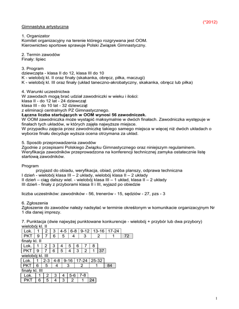 (*2012) Gimnastyka artystyczna 1. Organizator Komitet organizacyjny na terenie którego rozgrywana jest OOM. Kierownictwo sportowe sprawuje Polski Związek Gimnastyczny. 2. Termin zawodów Finały: lipiec 3. Program dziewczęta - klasa II do 12, klasa III do 10 K - wielobój kl. II oraz finały (skakanka, obręcz, piłka, maczugi) K - wielobój kl. III oraz finały (układ taneczno-akrobatyczny, skakanka, obręcz lub piłka) 4. Warunki uczestnictwa W zawodach mogą brać udział zawodniczki w wieku i ilości: klasa II - do 12 lat - 24 dziewcząt klasa III - do 10 lat - 32 dziewcząt z eliminacji centralnych PZ Gimnastycznego. Łączna liczba startujących w OOM wynosi 56 zawodniczek. W OOM zawodniczka może wystąpić maksymalnie w dwóch finałach. Zawodniczka występuje w finałach tych układów, w których zajęła najwyższe miejsce. W przypadku zajęcia przez zawodniczkę takiego samego miejsca w więcej niż dwóch układach o wyborze finału decyduje wyższa ocena otrzymana za układ. 5. Sposób przeprowadzenia zawodów Zgodnie z przepisami Polskiego Związku Gimnastycznego oraz niniejszym regulaminem. Weryfikacja zawodników przeprowadzona na konferencji technicznej zamyka ostatecznie listę startową zawodników. Program przyjazd do obiadu, weryfikacja, obiad, próba planszy, odprawa techniczna I dzień - wielobój klasa III – 2 układy, wielobój klasa II – 2 układy II dzień – ciąg dalszy wiel. - wielobój klasa III – 1 układ, klasa II – 2 układy III dzień - finały z przyborami klasa II i III, wyjazd po obiedzie liczba uczestników: zawodników - 56, trenerów - 15, sędziów - 27, pzs - 3 6. Zgłoszenia Zgłoszenie do zawodów należy nadsyłać w terminie określonym w komunikacie organizacyjnym Nr 1 dla danej imprezy. 7. Punktacja (dwie najwyżej punktowane konkurencje - wielobój + przybór lub dwa przybory) wielobój kl. II Lok. 1 2 3 4-5 6-8 9-12 13-16 17-24 PKT 9 7 6 5 4 3 2 1 72 finały kl. II Lok. 1 2 3 4 5 6 7 8 PKT 9 7 6 5 4 3 2 1 37 wielobój kl. III Lok. 1 2-3 4-8 9-16 17-24 25-32 PKT 6 5 4 3 2 1 84 finały kl. III Lok. 1 2 3 4 5-6 7-8 PKT 6 5 4 3 2 1 24 1 D. System ocen Gimnastyka artystyczna I. Młodzieżowe Mistrzostwa Polski K - do 18 lat 1. Program K - wielobój kl. mistrzowska 2. Punktacja Lok. 1 2 3 4 5 6 7 8 9-12 PKT 25 21 18 16 14 12 11 10 8 159 II. Mistrzostwa Polski Juniorów K - do 15 lat 1. Program K - wielobój kl. I oraz finały (skakanka, obręcz, piłka, wstążka), układy zbiorowe 2. Punktacja (trzy najwyżej punktowane konkurencje - wielobój + dwa przybory lub trzy przybory) wielobój Lok. 1 2 3 4 5 6 7 8 9 10-11 12-13 14-16 PKT 15 12 10 9 8 7 6 5 4 3 2 1 89 finały, układy zbiorowe Lok. 1 2 3 4 5 6 7 8 PKT 15 12 10 8 6 4 3 2 60 III. Olimpiada Młodzieży - Mistrzostwa Polski Juniorów młodszych Klasa II - K – do 12 lat, Klasa III K – do 10 lat 1. Program K - wielobój kl. II oraz finały (skakanka, obręcz, piłka, maczugi) K - wielobój kl. III oraz finały (układ taneczno-akrobatyczny, skakanka, obręcz lub piłka) 2. Punktacja (dwie najwyżej punktowane konkurencje - wielobój + przybór lub dwa przybory) wielobój kl. II Lok. 1 2 3 4-5 6-8 9-12 13-16 17-24 PKT 9 7 6 5 4 3 2 1 72 finały kl. II Lok. 1 2 3 4 5 6 7 8 PKT 9 7 6 5 4 3 2 1 37 wielobój kl. III Lok. 1 2-3 4-8 9-16 17-24 25-32 PKT 6 5 4 3 2 1 84 finały kl. III Lok. 1 2 3 4 5-6 7-8 PKT 6 5 4 3 2 1 24 Eliminacje do OOM – eliminacje centralne III. Mistrzostwa Polski Juniorów młodszych Klasa II - K – do 12 lat Klasa III K – do 10 lat 1. Program K – układy zbiorowe klasa II, III 2. Punktacja układy zbiorowe klasa II Lok. 1 2 3 4 5 6 7 8 PKT 9 7 6 5 4 3 2 1 37 układy zbiorowe kl. III 3 4 Lok. 1 2 PKT 6 5 4 3 5-6 2 7-8 1 24 2 IV. Międzywojewódzkie Mistrzostwa Młodzików klasa młodzieżowa K - do 9 lat 1. Program K - wielobój kl. Młodzieżowa oraz finały (układ taneczno-akrobatyczny, skakanka, obręcz) 2. Punktacja - (dwie najwyżej punktowane konkurencje - wielobój + przybór lub dwa przybory) wielobój Lok. 1 2-3 4-12 PKT 3 2 1 16 finały Lok. 1 2 3-4 PKT 3 2 1 7 Strefy A – POM, KPM, WM, ZPM B – DŚL, LBU, WLP, OPO C – LUB, ŁDZ, MAZ, PDL D – MŁP, PKR, ŚL, ŚWI 2011 POM WLP MAZ MŁP 2012 ZPM DŚL ŁDZ ŚL 2013 2014 E. Roczniki młodzieżowcy juniorzy juniorzy młodsi młodzicy do 18 lat (w 2012 roku urodzeni 01.01.1994 i młodsi) klasa M do 15 lat (w 2012 roku urodzeni 01.01.1997 i młodsi) klasa I do 12 lat (w 2012 roku urodzeni 01.01.2000 i młodsi) klasa II do 10 lat (w 2012 roku urodzeni 01.01.2002 i młodsi) klasa III do 9 lat (w 2012 roku urodzeni 01.01.2003 i młodsi) klasa młodzieżowa Przypominamy: - w zawodach uczestniczą kluby posiadające licencję wydaną przez właściwy polski związek, - zawodnicy muszą posiadać licencję wydaną przez właściwy związek, - w przypadku braku licencji klubowej – punkty naliczane będą dla gminy, - komunikat z zawodów powinien zawierać rok urodzenia zawodnika, numer licencji zawodnika oraz pełną nazwę klubu, wykaz członków komisji sędziowskiej wraz z ich nr licencji i być podpisany przez sędziego głównego z podaniem jego nr licencji - komunikat z zawodów należy przesłać na adres Polskiej Federacji Sportu Młodzieżowego w ciągu 14 dni po zawodach, - prosimy o zapoznanie się z częścią ogólną regulaminu współzawodnictwa, gdzie podane są zasady uczestnictwa i oceny wyników we wszystkich dyscyplinach systemu, - na stronie internetowej PFSM (www.sportmlodziezowy.pl) umieszczane są średnio co dwa tygodnie wyniki współzawodnictwa, - od 2010 roku w Młodzieżowych Mistrzostwach Polski w konkurencjach indywidualnych, gdzie liczba ostatecznie sklasyfikowanych zawodników jest mniejsza niż 8, zawodnicy będą otrzymywać połowę punktów. 3