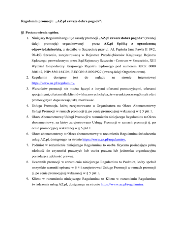 Regulamin promocji: „AZ.pl zawsze dobra pogoda”. §1 Postanowienia ogólne. 1. Niniejszy Regulamin reguluje zasady promocji „AZ.pl zawsze dobra pogoda” (zwanej dalej: promocją) organizowanej przez AZ.pl Spółkę z ograniczoną odpowiedzialnością, z siedzibą w Szczecinie przy ul. Al. Papieża Jana Pawła II 19/2, 70-453 Szczecin, zarejestrowaną w Rejestrze Przedsiębiorców Krajowego Rejestru Sądowego, prowadzonym przez Sąd Rejonowy Szczecin - Centrum w Szczecinie, XIII Wydział Gospodarczy Krajowego Rejestru Sądowego pod numerem KRS: 0000 360147, NIP: 8561164306, REGON: 810903927 (zwaną dalej: Organizatorem). 2. Regulamin dostępny jest do wglądu na stronie internetowej https://www.az.pl/regulaminy. 3. Warunków promocji nie można łączyć z innymi ofertami promocyjnymi, ofertami specjalnymi, ofertami dla klientów kluczowych chyba, że warunki poszczególnych ofert promocyjnych dopuszczają taką możliwość. 4. Usługa Promocja, którą zarejestrowano u Organizatora na Okres Abonamentowy Usługi Promocji w ramach promocji tj. po cenie promocyjnej wskazanej w § 5 pkt 1. 5. Okres Abonamentowy Usługi Promocji w rozumieniu niniejszego Regulaminu to Okres abonamentowy, na który zarejestrowano Usługę Promocji w ramach promocji tj. po cenie promocyjnej wskazanej w § 5 pkt 1. 6. Okres abonamentowy to Okres abonamentowy w rozumieniu Regulaminu świadczenia usług AZ.pl, dostępnego na stronie https://www.az.pl/regulaminy. 7. Podmiot w rozumieniu niniejszego Regulaminu to osoba fizyczna posiadająca pełną zdolność do czynności prawnych lub osoba prawna lub jednostka organizacyjna posiadająca zdolność prawną. 8. Uczestnik promocji w rozumieniu niniejszego Regulaminu to Podmiot, który spełnił wszystkie warunki opisane w § 4 i zarejestrował Usługę Promocji w ramach promocji tj. po cenie promocyjnej wskazanej w § 5 pkt 1. 9. Klient w rozumieniu niniejszego Regulaminu to Klient w rozumieniu Regulaminu świadczenia usług AZ.pl, dostępnego na stronie https://www.az.pl/regulaminy. §2 Zmiana zasad promocji. 1. Zasady promocji mogą ulec zmianie w czasie jej trwania, z tym zastrzeżeniem, że nie dotyczy to umów zawartych przed dokonaną zmianą. 2. Organizator poinformuje o zakresie zmiany na stronach internetowych, na których umieszcza informację o promocji. §3 Czas trwania promocji. 1. Promocja trwa od dnia 13.06.2016 roku do dnia 30.06.2016 roku. 2. Organizator może odwołać przed upływem terminu wskazanego w pkt 1 powyżej, promocję bez podania przyczyny. Informacja o odwołaniu promocji zostanie zamieszczona na stronach internetowych, na których umieszczono informację o promocji. 3. Organizator może przedłużyć termin trwania promocji wskazany w pkt 1 powyżej. Informacja o przedłużeniu terminu trwania promocji zostanie zamieszczona na stronach internetowych, na których umieszczono informację o promocji. §4 Uczestnicy promocji. 1. Promocja skierowana jest do osób fizycznych posiadających pełną zdolność do czynności prawnych lub osób prawnych lub jednostek organizacyjnych posiadających zdolność prawną, które w trakcie trwania promocji: a. dokonają do rejestracji za pomocą systemu Organizatora Usługę Promocji, oraz b. zaakceptują niniejszy Regulamin, oraz c. zaakceptują Regulamin świadczenia usług AZ.pl, dostępny na stronie https://www.az.pl/regulaminy, d. spełnią pozostałe warunki określone niniejszym Regulaminem i Regulaminem świadczenia usług AZ.pl , dostępny na stronie https://www.az.pl/regulaminy, oraz e. uiściły opłaty należne z tytułu usługi opisanej w lit. a powyżej 2. Z warunków promocji nie mogą korzystać Podmioty, które nie dokonały płatności za Usługi AZ.pl lub opóźniły się z płatnością za Usługi AZ.pl, albo dotychczas zawarte z Organizatorem umowy wykonywały w sposób nienależyty chyba, że Organizator postanowi inaczej. §5 Opis promocji 1. Podmioty, które spełniły warunki określone w § 4 mogą zarejestrować Usługę Promocji wskazaną w tabeli poniżej za cenę promocyjną w kwocie wskazanej w tabeli poniżej na Okres Abonamentowy Usługi Promocji wskazany w tabeli poniżej. Usługa Promocji Okres Abonamentowy Cena promocyjna Usługi Promocji webMaker Start 1 rok 50,00 zł Domena.EU 1 rok 0,00 zł Domena.EU 1 rok 0,00 zł 2. Każdy Uczestnik promocji uprawniony jest do rejestracji na warunkach promocji opisanych w pkt 1 powyżej, wyłącznie jednej Usługi Promocji. 3. Świadczenie otrzymane przez Uczestnika promocji w ramach promocji nie podlega wymianie na ekwiwalent pieniężny, inne usługi, inne Usługi AZ.pl bądź świadczenia. 4. Korzystanie z Usługi Promocji podlega ogólnym zasadom opisanym w Regulaminie świadczenia usług AZ.pl oraz Usługi Promocji, dostępnych na stronie https://www.az.pl/regulaminy. § 6 Rozwiązanie umowy o świadczenie Usługi Promocji. 1. Umowa o świadczenie Usługi Promocji zawierana jest pomiędzy Organizatorem a Uczestnikiem promocji na czas oznaczony obejmujący Okres Abonamentowy Usługi Promocji. 2. Umowa o świadczenie Usługi Promocji może być rozwiązana przed upływem Okresu Abonamentowego Usługi Promocji przez Uczestnika promocji lub jego następców prawnych, którzy stali się stroną umowy o świadczenie Usługi Promocji w ramach sukcesji uniwersalnej lub singularnej, jedynie z przyczyn zależnych wyłącznie od Organizatora, w szczególności w przypadku niewykonania lub nienależytego wykonania Usługi Promocji. Rozwiązanie umowy o świadczenie Usługi Promocji, o którym mowa w zdaniu poprzednim, następuje na zasadach określonych w Regulaminie świadczenia usług AZ.pl, dostępnym na stronie https://www.az.pl/regulaminy. 3. Do rozwiązania umowy o świadczenie Usługi Promocji przez Uczestnika promocji lub jego następców prawnych, którzy stali się stroną umowy o świadczenie Usługi Promocji w ramach sukcesji uniwersalnej lub singularnej nie znajdują zastosowania zapisy Regulaminu świadczenia usł