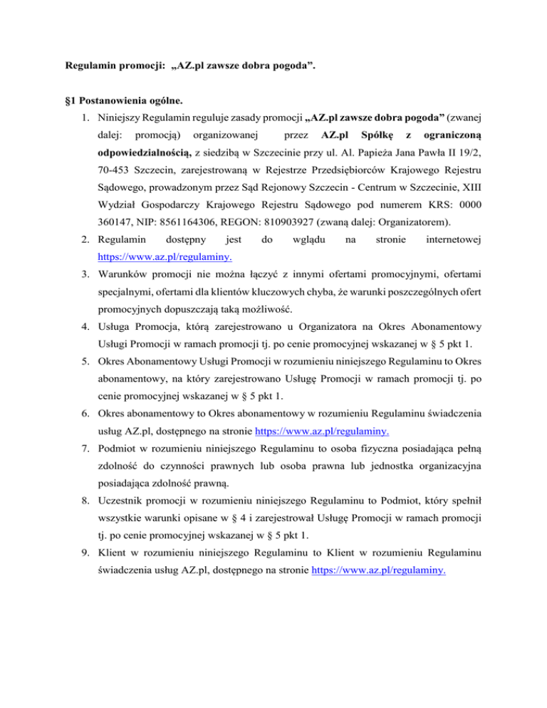 Regulamin promocji: „AZ.pl zawsze dobra pogoda”. §1