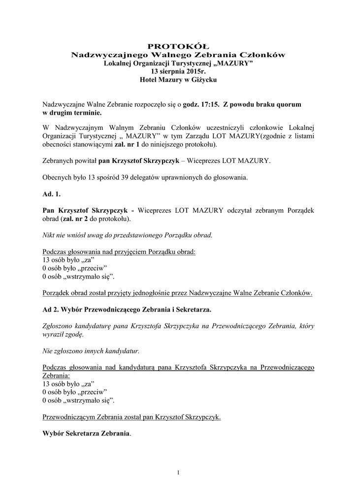 PROTOKÓŁ Nadzwyczajnego Walnego Zebrania Członków Lokalnej Organizacji Turystycznej „MAZURY” 13 sierpnia 2015r. Hotel Mazury w Giżycku Nadzwyczajne Walne Zebranie rozpoczęło się o godz. 17:15. Z powodu braku quorum w drugim terminie. W Nadzwyczajnym Walnym Zebraniu Członków uczestniczyli członkowie Lokalnej Organizacji Turystycznej „ MAZURY” w tym Zarządu LOT MAZURY(zgodnie z listami obecności stanowiącymi zał. nr 1 do niniejszego protokołu). Zebranych powitał pan Krzysztof Skrzypczyk – Wiceprezes LOT MAZURY. Obecnych było 13 spośród 39 delegatów uprawnionych do głosowania. Ad. 1. Pan Krzysztof Skrzypczyk - Wiceprezes LOT MAZURY odczytał zebranym Porządek obrad (zał. nr 2 do protokołu). Nikt nie wniósł uwag do przedstawionego Porządku obrad. Podczas głosowania nad przyjęciem Porządku obrad: 13 osób było „za” 0 osób było „przeciw” 0 osób „wstrzymało się”. Porządek obrad został przyjęty jednogłośnie przez Nadzwyczajne Walne Zebranie Członków. Ad 2. Wybór Przewodniczącego Zebrania i Sekretarza. Zgłoszono kandydaturę pana Krzysztofa Skrzypczyka na Przewodniczącego Zebrania, który wyraził zgodę. Nie zgłoszono innych kandydatur. Podczas głosowania nad kandydaturą pana Krzysztofa Skrzypczyka na Przewodniczącego Zebrania: 13 osób było „za” 0 osób było „przeciw” 0 osób „wstrzymało się”. Przewodniczącym Zebrania został pan Krzysztof Skrzypczyk. Wybór Sekretarza Zebrania. 1 Pan Krzysztof Skrzypczyk zgłosił kandydaturę pani Agnieszki Buszyło- pracownika biura LOT MAZURY na Sekretarza Zebrania- wyraziła zgodę. Podczas głosowania nad kandydaturą pani Agnieszki Buszyło na Sekretarza zebrania: 13 osób było „za: 0 osób było „przeciw” 0 osób „wstrzymało się”. Sekretarzem Zebrania została pani Agnieszka Buszyło. Ad 3. Przyjęcie protokołu WZC, które odbyło się 16 czerwca 2015r. Przewodniczący zebrania wyjaśnił, że protokół z ostatniego WZC został zamieszczony na stronie internetowej tak jak inne dokumenty związane z zebraniem. Nie zgłoszono uwag do w/w protokołu. Podczas głosowania nad przyjęciem protokołu z WZC, które odbyło się 16 czerwca 2015r.: 11 osób było „za” 0 osób było „przeciw” 2 osoby „wstrzymały się”. W głosowaniu jawnym przyjęty został protokół WZC, które odbyło się 16 czerwca 2015r. Ad 4. Podjecie uchwały w sprawie wpisu LOT MAZURY do Rejestru Przedsiębiorców. Przewodniczący NWZC poinformował, że LOT MAZURY w ramach działalności gospodarczej na początek zajmie się opracowaniem materiałów informacyjnych, promocyjnych, folderów także na stronę internetową, promocją, reklamą. W ramach przyszłych perspektyw finansowania z RPO W i M 2014-2020 oraz środków z działalności gospodarczej możliwa będzie realizacja celów statutowych stowarzyszenia. Dodał, że wpis będzie kosztował stowarzyszenie 600zł. Podczas głosowania nad podjęciem uchwały w sprawie rozpoczęcia wykonywania działalności gospodarczej przez LOT MAZURY: 13 osób było „za” 0 osób było „przeciw” 0 osób „wstrzymało się” W głosowaniu jawnym członkowie NWZC podjęli uchwałę nr 13/2015, która stanowi zał. nr 3 do Protokołu. Ad. 5 Podjęcie uchwały w sprawie ustalenia wysokości składki członkowskiej dla Samorządów. Pan Marek Szmit- Prezes LOT MAZURY powiedział, że były prowadzone rozmowy z Radnymi Miasta Giżycka oraz przedstawicielami Samorządów członkowskich (Miłki, 2 Kruklanki, Gmina Wiejska Giżycko) w sprawie pomysłu przekazywania części opłaty miejscowej, jako składki członkowskiej dla LOT MAZURY. Dodał, że wiadomym jest, iż sami mamy największy wpływ na pobieranie opłaty miejscowej, sposób jej pobierania i informowania turystów, na co jest przekazywana ta opłata i jak zostanie zagospodarowana. Stwierdził, że członkom LOTu zależy na tym, aby poprzez zbieranie opłaty miejscowej w obiektach zwiększać też wpływy do budżetów Samorządów i odciążyć je od tego obowiązku. Stwierdził, że zasadność i cel zbierania tej opłaty jest przez wielu podważana i tym samym zaniechana, poprzez działania LOTu można stopniowo zmieniać ten stan i niwelować i zapobiegać konfliktom, które mogą wystąpić pomiędzy władzą, a przedsiębiorcami z branży turystycznej na tym polu. Pan Przewodniczący NWZC dodał, że Lot jest świadomy tego, że należy współpracować ze wszystkimi Samorządami i prowadzić nieustająco rozmowy z ich przedstawicielami. Podczas głosowania nad podjęciem uchwały w sprawie określenia wysokości składki członkowskiej stowarzyszenia LOT MAZURY dla Samorządów Gminnych: 13 osób było „za” 0 osób było „przeciw” 0 osób „wstrzymało się” W głosowaniu jawnym członkowie NWZC podjęli uchwałę nr 14/2015, która stanowi zał. nr 4 do Protokołu. Pan Roman Łożyński- Wiceburmistrz Miasta Giżycka powiedział, że ma nadzieję, że Radni Miasta na najbliższej sesji podejmą uchwałę, która pozwoli przekazywać część wpływu z opłaty miejscowej dla LOTu, jako składkę członkowską Miasta Giżycka. Jednak w zamian oczekuje się, że dzięki temu w przyszłych latach te wpływy do budżetu wzrosną. Dodał, że rozumie starania LOTu, ale będzie namawiał do nieustającej aktywności i działalności. Ad. 6 Zamkniecie obrad. Przewodniczący Walnego Zebrania Członków pan Krzysztof Skrzypczyk podziękował wszystkim za przybycie i zamknął obrady WZC. Obrady zakończono o 17:35. Na tym protokół zakończono. Sporządziła: Agnieszka Buszyło– Sekretarz Walnego Zebrania Zatwierdził: Krzysztof Skrzypczyk – Przewodniczący Walnego Zebrania Członków 3