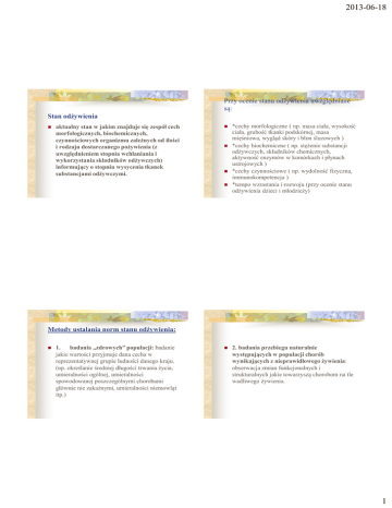 2013-06-18 Przy ocenie stanu odżywienia uwzględniane są: Stan odżywienia aktualny stan w jakim znajduje się zespół cech morfologicznych, biochemicznych, czynnościowych organizmu zależnych od ilości i rodzaju dostarczanego pożywienia (z uwzględnieniem stopnia wchłaniania i wykorzystania składników odżywczych) informujący o stopniu wysycenia tkanek substancjami odżywczymi. *cechy morfologiczne ( np. masa ciała, wysokość ciała, grubość tkanki podskórnej, masa mięśniowa, wygląd skóry i błon śluzowych ) *cechy biochemiczne ( np. stężenie substancji odżywczych, składników chemicznych, aktywność enzymów w komórkach i płynach ustrojowych ) *cechy czynnościowe ( np. wydolność fizyczna, immunokompetencja ) *tempo wzrastania i rozwoju (przy ocenie stanu odżywienia dzieci i młodzieży) Metody ustalania norm stanu odżywienia: 1. badania „zdrowych” populacji: badanie jakie wartości przyjmuje dana cecha w reprezentatywnej grupie ludności danego kraju. (np. określanie średniej długości trwania życia, umieralności ogólnej, umieralności spowodowanej poszczególnymi chorobami głównie nie zakaźnymi, umieralności niemowląt itp.) 2. badania przebiegu naturalnie występujących w populacji chorób wynikających z nieprawidłowego żywienia: obserwacja zmian funkcjonalnych i strukturalnych jakie towarzyszą chorobom na tle wadliwego żywienia. 1 2013-06-18 Czynniki predysponujące do wystąpienia zaburzeń stanu odżywienia : 3. badania z wykorzystaniem zwierząt doświadczalnych: obserwacja zmian jakie pojawiają się z powodu braku lub nadmiaru określonej substancji odżywczej 1. specyficzne zapotrzebowanie na składniki odżywcze ( w porównaniu z osobami w tym samym wieku i tej samej płci, o zbliżonej masie ciała ) będące skutkiem zwiększonego lub obniżonego tempa przemiany materii 2. nieodpowiednia podaż pokarmu - podaż pokarmu niezgodna z zapotrzebowaniem organizmu co do ilości dostarczanej energii jak i składników odżywczych 3. leki Nieodpowiednia podaż składników odżywczych dotyczyć może: Błędy żywieniowe - najczęstsze przyczyny: populacji: wojna klęski żywiołowe jednostki: błędy żywieniowe stany chorobowe ubóstwo (względy ekonomiczne) - nieprawidłowe nawyki żywieniowe - nieprawidłowy tryb żywienia - nieprawidłowe proporcje między poszczególnymi składnikami odżywczymi - brak wystarczającej wiedzy na temat znaczenia racjonalnego żywienia 2 2013-06-18 Cechy racjonalnego żywienia (zakres akceptowanego rozdziału) Geneva 2003 Energia Białko Węglowodany Tłuszcze Cholesterol Błonnik pokarmowy Sól kuchenna Owoce i warzywa wg.ind.zapotrzebowania 10-16% 45-60% (<10% cukry proste) 25-30% (8-10% NKT, 1:1 PUFA : MUFA) izomery trans < 1%energii ≤300 mg/dobę 20 –40 g / dobę 0-5 g / dobę > 400g / dobę Błędy żywieniowe - najczęstsze przyczyny: stosowanie drastycznych diet odchudzających bez kontroli specjalisty (lekarza, dietetyka) - względy religijne - względy kulturowe - względy ideowe - utrudnienia w nabyciu pożywienia lub przygotowaniu posiłków z uwagi na kalectwo lub wiek - narkomania - alkoholizm Stany chorobowe: zaburzenia w Stany chorobowe: zaburzenia w procesie przyjmowaniu składników odżywczych: trawienia i wchłaniania skł. odżywczych: utrudnienia w dostarczaniu pożywienia (drżenie, amputacja kończyn górnych, pląsawica) utrudnienia w procesie żucia pokarmu ( np. schorzenia jamy ustnej, braki w uzębieniu ) zaburzenia w połykaniu pokarmu ( choroby neurologiczne) nieprawidłowa drożność przełyku (np. w przypadku nowotworów przełyku ) odmawianie przyjmowania pokarmu wynikające z chorób psychicznych (np. w schizofrenii) zaburzenia odżywiania o podłożu psycho-somatycznym (anorexia nervosa, bulimia nervosa, pica ) niedostateczną podaż soków trawiennych (mniejsze wydzielanie lub trudności w ich dopływie) nieprawidłową aktywność enzymów (zbyt niska aktywność lub stężenie enzymów spowodowane najczęściej stanami chorobowymi żołądka, trzustki, wątroby, dróg żółciowych) 3 2013-06-18 Zaburzenia w procesie trawienia i wchłaniania skł. odżywczych cd.: przyśpieszony pasaż jelitowy, nadmierna perystaltyka jelit -choroby zapalne jelit (np. choroba Crohna) zespół jelita krótkiego zespoły złego wchłaniania obecność pasożytów w przewodzie pokarmowym fizjologicznie obniżoną wydolność przewodu pokarmowego występującą u niemowląt i ludzi w podeszłym wieku. Stany chorobowe: Upośledzony metabolizm składników odżywczych: Stany chorobowe: Nadmierna utrata składników odżywczych: z moczem (zespół nerczycowy) z kałem (biegunki) ze zwracaną treścią pokarmową (w trakcie wymiotów, poprzez odsysanie treści żołądkowej) w stresie katabolicznym, czyli przy utracie własnych tkanek i płynów ustrojowych (krwotok, wysięk zapalny, procesy ropne, oparzenia, urazy, zabiegi chirurgiczne, rozpad guza nowotworowego) przy hemodializie w chorobach: nerek, wątroby, trzustki przy przewlekłej niewydolności układu krążenia i /lub układu oddechowego w alkoholizmie (zaburzenia metabolizmu komórkowego) w przypadku wrodzonych enzymopatii (fenyloketonuria, choroba syropu klonowego) u dzieci z nietolerancją glutenu, laktozy w wyniku urazów, infekcji, poparzeń Charakter zaburzeń stanu odżywienia: Niedożywienie: 1. Ilościowe: energetyczno-białkowe (marasmus) białkowo-energetyczne (kwashiorkor) 2. Jakościowe: specyficzny niedobór pokarmowy (np. niedokrwistość z braku Fe, vit.B12, kw. foliowego) Nadmierne odżywienie: 1. Ilościowe:nadmiary energetyczne gromadzone jako TG w tk. podsk.lub okołonarz. 2. Jakościowe: specyficzny nadmiar pokarmowy (np. / płynów – obrzęki; /soli kuch.nadciśnienie tętnicze; /.K-arytmia; / D3 lub Ca kamica moczowa 4 2013-06-18 Fazy wyczerpywania się zapasów ustrojowych: I faza: niedobór potencjalny (ruszenie rezerw ustrojowych) -spadek stężenia konkretnych składników odżywczych w tka