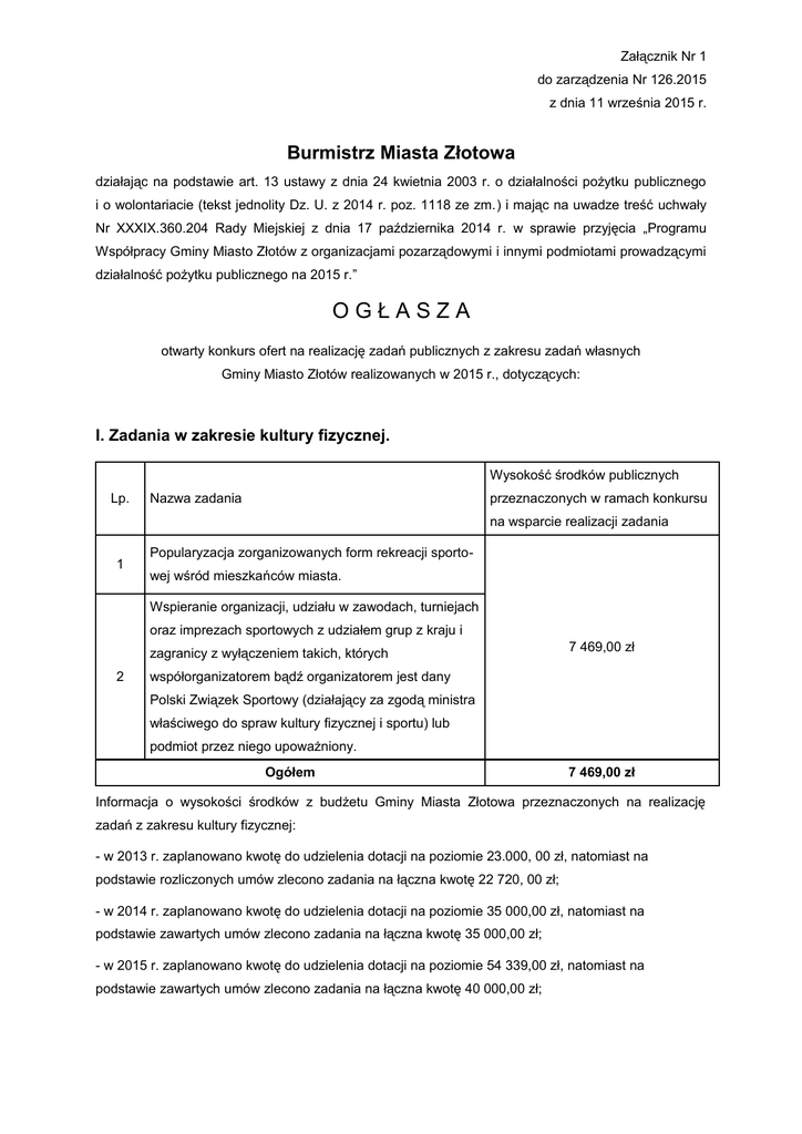 Załącznik Nr 1 do zarządzenia Nr 126.2015 z dnia 11 września 2015 r. Burmistrz Miasta Złotowa działając na podstawie art. 13 ustawy z dnia 24 kwietnia 2003 r. o działalności pożytku publicznego i o wolontariacie (tekst jednolity Dz. U. z 2014 r. poz. 1118 ze zm.) i mając na uwadze treść uchwały Nr XXXIX.360.204 Rady Miejskiej z dnia 17 października 2014 r. w sprawie przyjęcia „Programu Współpracy Gminy Miasto Złotów z organizacjami pozarządowymi i innymi podmiotami prowadzącymi działalność pożytku publicznego na 2015 r.” OGŁASZA otwarty konkurs ofert na realizację zadań publicznych z zakresu zadań własnych Gminy Miasto Złotów realizowanych w 2015 r., dotyczących: I. Zadania w zakresie kultury fizycznej. Wysokość środków publicznych Lp. Nazwa zadania przeznaczonych w ramach konkursu na wsparcie realizacji zadania 1 Popularyzacja zorganizowanych form rekreacji sportowej wśród mieszkańców miasta. Wspieranie organizacji, udziału w zawodach, turniejach oraz imprezach sportowych z udziałem grup z kraju i zagranicy z wyłączeniem takich, których 2 7 469,00 zł współorganizatorem bądź organizatorem jest dany Polski Związek Sportowy (działający za zgodą ministra właściwego do spraw kultury fizycznej i sportu) lub podmiot przez niego upoważniony. Ogółem 7 469,00 zł Informacja o wysokości środków z budżetu Gminy Miasta Złotowa przeznaczonych na realizację zadań z zakresu kultury fizycznej: - w 2013 r. zaplanowano kwotę do udzielenia dotacji na poziomie 23.000, 00 zł, natomiast na podstawie rozliczonych umów zlecono zadania na łączna kwotę 22 720, 00 zł; - w 2014 r. zaplanowano kwotę do udzielenia dotacji na poziomie 35 000,00 zł, natomiast na podstawie zawartych umów zlecono zadania na łączna kwotę 35 000,00 zł; - w 2015 r. zaplanowano kwotę do udzielenia dotacji na poziomie 54 339,00 zł, natomiast na podstawie zawartych umów zlecono zadania na łączna kwotę 40 000,00 zł; II. Zadania w zakresie integracji pomiędzy regionami partnerskimi współpracującymi z Gminą Miasto Złotów: Wysokość środków publicznych Lp. Nazwa zadania przeznaczonych w ramach konkursu na wsparcie realizacji zadania Upowszechnianie idei rozwoju współpracy międzyregionalnej poprzez realizację wspólnych projektów mię1 dzynarodowej wymiany dzieci, młodzieży i dorosłych, 10 000,00 zł pomiędzy regionami partnerskimi współpracującymi z Gminą Miasto Złotów (miasta GOOLE, NIEŚWIEŻ, LA FLÈCHE, RATHENOW, EGGESIN) Ogółem 10 000,00 zł Informacja o wysokości środków z budżetu Gminy Miasta Złotowa przeznaczonych na realizację zadań z zakresu integracji pomiędzy regionami partnerskimi współpracującymi z Gminą Miasto Złotów: - w 2012 r. zaplanowano kwotę do udzielenia dotacji na poziomie 20.000,00 zł, natomiast na podstawie zawartych umów zlecono zadania na łączna kwotę 8 910,00 zł; - w 2013 r. zaplanowano kwotę do udzielenia dotacji na poziomie 20.000,00 zł, natomiast na podstawie zawartych umów zlecono zadania na łączna kwotę 0,00 zł; - w 2014 r. zaplanowano kwotę do udzielenia dotacji na poziomie 20.000,00 zł, natomiast na podstawie zawartych umów zlecono zadania na łączna kwotę 0,00 zł; - w 2015 r. zaplanowano kwotę do udzielenia dotacji na poziomie 13 661,00 zł, natomiast na podstawie zawartych umów zlecono zadania na łączna kwotę 3 661,00 zł; III. Zadania w zakresie ekologii i ochrony środowiska: Wysokość środków publicznych Lp. Nazwa zadania przeznaczonych w ramach konkursu na wsparcie realizacji zadania 1 Wspieranie realizacji interaktywnych programów edukacji ekologicznej. Ogółem 4 000,00 zł 4 000,00 zł Informacja o wysokości środków z budżetu Gminy Miasta Złotowa przeznaczonych na realizację zadań z zakresu ekologii i ochrony środowiska: - w 2013 r. zaplanowano kwotę do udzielenia dotacji na poziomie 10.000,00 zł, natomiast na podstawie zawartych umów zlecono zadania na łączna kwotę 7 500,00 zł; - w 2014 r. zaplanowano kwotę do udzielenia dotacji na poziomie 10.000,00 zł, natomiast na podstawie zawartych umów zlecono zadania na łączna kwotę 10 000,00 zł; - w 2015 r. zaplanowano kwotę do udzielenia dotacji na poziomie 15 00,00 zł, natomiast na podstawie zawartych umów zlecono zadania na łączna kwotę 11 000,00 zł; IV. Zadania w zakresie turystyki i krajoznawstwa: Wysokość środków publicznych Lp. Nazwa zadania przeznaczonych w ramach konkursu na wsparcie realizacji zadania Wspieranie organizacji przedsięwzięć związanych z 1 popularyzacją istotnych zagadnień związanych z uprawianiem turystyki; Wspieranie organizacji przedsięwzięć promocji atrakcji 2 8 000,00 zł turystycznych miasta Złotowa w formie publikacji (albumy, foldery, kartki pocztowe, gry, mapy, katalogi, filmy, prezentacje elektroniczne, itp.). Ogółem 8 000,00 zł Informacja o wysokości środków z budżetu Gminy Miasta Złotowa przeznaczonych na realizację zadań z zakresu turystyki i krajoznawstwa: - w 2012 r. zaplanowano kwotę do udzielenia dotacji na poziomie 13.000,00 zł, natomiast na podstawie rozliczonych umów zlecono zadania na łączna kwotę 13 000, 00 zł; - w 2013 r. zaplanowano kwotę do udzielenia dotacji na poziomie 10.000,00 zł, natomiast na podstawie rozliczonych umów zlecono zadania na łączna kwotę 1 000, 00 zł; - w 2014 r. nie planowano wsparcia na realizację zadań z zakresu turystyki i krajoznawstwa; - w 2015 r. zaplanowano kwotę do udzielenia dotacji na poziomie 8 000,00 zł, natomiast na podstawie zawartych umów zlecono zadania na łączna kwotę 0,00 zł.