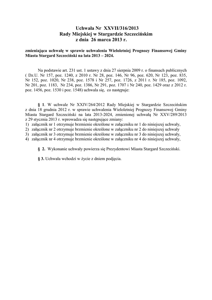 Uchwała Nr XXVII/316/2013 Rady Miejskiej w Stargardzie Szczecińskim z dnia 26 marca 2013 r. zmieniająca uchwałę w sprawie uchwalenia Wieloletniej Prognozy Finansowej Gminy Miasta Stargard Szczeciński na lata 2013 – 2024. Na podstawie art. 231 ust. 1 ustawy z dnia 27 sierpnia 2009 r. o finansach publicznych ( Dz.U. Nr 157, poz. 1240, z 2010 r. Nr 28, poz. 146, Nr 96, poz. 620, Nr 123, poz. 835, Nr 152, poz. 1020, Nr 238, poz. 1578 i Nr 257, poz. 1726, z 2011 r. Nr 185, poz. 1092, Nr 201, poz. 1183, Nr 234, poz. 1386, Nr 291, poz. 1707 i Nr 240, poz. 1429 oraz z 2012 r. poz. 1456, poz. 1530 i poz. 1548) uchwala się, co następuje: § 1. W uchwale Nr XXIV/264/2012 Rady Miejskiej w Stargardzie Szczecińskim z dnia 18 grudnia 2012 r. w sprawie uchwalenia Wieloletniej Prognozy Finansowej Gminy Miasta Stargard Szczeciński na lata 2013-2024, zmienionej uchwałą Nr XXV/289/2013 z 29 stycznia 2013 r. wprowadza się następujące zmiany: 1) załącznik nr 1 otrzymuje brzmienie określone w załączniku nr 1 do niniejszej uchwały, 2) załącznik nr 2 otrzymuje brzmienie określone w załączniku nr 2 do niniejszej uchwały 3) załącznik nr 3 otrzymuje brzmienie określone w załączniku nr 3 do niniejszej uchwały, 4) załącznik nr 4 otrzymuje brzmienie określone w załączniku nr 4 do niniejszej uchwały, § 2. Wykonanie uchwały powierza się Prezydentowi Miasta Stargard Szczeciński. § 3. Uchwała wchodzi w życie z dniem podjęcia. UZASADNIENIE Zgodnie z art. 231 ust.1 ustawy z dnia 27 sierpnia 2009 r. o finansach publicznych zmiana kwot wydatków na realizację przedsięwzięć może nastąpić w wyniku podjęcia uchwały organu stanowiącego jednostki samorządu terytorialnego, zmieniającej zakres wykonywania lub wstrzymującej wykonywanie przedsięwzięcia. Ponadto, wprowadzone zmiany w przedmiotowej uchwale są konieczne z uwagi na obowiązek wynikający z art. 229 ustawy o finansach publicznych, zgodnie z którym wartości przyjęte w wieloletniej prognozie finansowej i budżecie jednostki samorządu terytorialnego powinny być zgodne co najmniej w zakresie wyniku budżetu i związanych z nim kwot przychodów i rozchodów oraz długu jednostki samorządu terytorialnego. Proponowane zmiany w przedmiotowej uchwale wynikają ze zmian dokonanych w budżecie miasta na 2013 r. i dotyczą limitów wydatków i zobowiązań na 2013 r. n/w przedsięwzięć: - „Bramy, które łączą – renowacja Bramy Wałowej w Stargardzie Szczecińskim oraz odbudowa Bramy Młyńskiej w Bernau (etap I) /Remont Bramy Wałowej”, - „ Stargard Klejnot Pomorza – rewitalizacja Ratusza Miejskiego w Stargardzie”, - „Dwa miejsca z historią – przebudowa, remont i rozbudowa obiektu Bastei w Stargardzie Szczecińskim oraz tworzenie funkcji muzealnych w Klasztorze Franciszkanów (840m2) w Neubrandenburgu oraz Bastei (360m2) w Stargardzie Szczecińskim”, - „Pilotażowe wdrożenie standardów usług w zakresie bezdomności i przetestowania Modelu Gminnego Standardu Wychodzenia z Bezdomności”, - „Indywidualizacja nauczania i wychowania w klasach I-III szkół podstawowych w Stargardzie Szczecińskim”, oraz wprowadzeniu nowych przedsięwzięć pn.: - „Trójka szkołą równych szans”, - „Integracja społeczna w powiecie stargardzkim”, - „Udział Miasta w budowie instalacji mechaniczno – biologicznego unieszkodliwiania odpadów (MBUO) na składowisku odpadów w Łęczycy realizowanej przez Zakład Zagospodarowania Odpadów Sp. z o.o.”. Ponadto uwzględniono: a) zmiany w ogólnych kwotach dochodów i wydatków związanych ze zmianą budżetu wprowadzone zarządzeniami Prezydenta Miasta, b) konieczność dostosowania przez jednostki samorządu terytorialnego (do 31 marca 2013 r.) uchwały w sprawie WPF do wymogów wynikających ze znowelizowanej ustawy o finansach publicznych ( zmiany wprowadzone ustawą z dnia 7 grudnia 2012 r. o zmianie niektórych ustaw w związku z realizacją ustawy budżetowej). Zmiany dotyczą: dostosowania załączników składających się na WPF do nowych wzorów załączników określonych Rozporządzeniem Ministra Finansów z dnia 10 stycznia 2013 r. w sprawie wieloletniej prognozy finansowej jednostki samorządu terytorialnego oraz wyłączenia z przedsięwzięć umów, których realizacja w roku budżetowym i w latach następnych jest niezbędna dla zapewnienia ciągłości działania jednostki i których płatności przypadają w okresie dłuższym niż rok. W związku z tym, umowy te nie będą ujmowane w Przedsięwzięciach Gminy Miasta Stargard Szczeciński w latach 2013 – 2016. Z uwagi na powyższe wnosi się o podjęcie niniejszej uchwały.