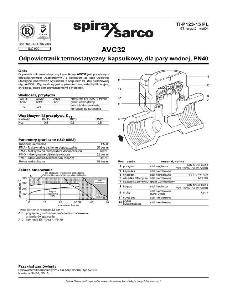 TI-P123-15 PL ST Issue 2 maj04 Cert. No. LRQ 0963008 AVC32 ISO 9001 Odpowietrznik termostatyczny, kapsu!kowy, dla pary wodnej, PN40 Opis Odpowietrznik termostatyczny kapsu!kowy AVC32 jest popularnym odpowietrznikiem „rozbieralnym”, z korpusem ze stali w"glowej (dost"pne jest równie# wykonanie z korpusem ze stali nierdzewnej - typ AVS32). Wyposa#ony jest w pier$cieniow% wk!adk" <racyjn%, chroni%c% przed zanieczyszczeniami z instalacji. 1 9 2 17 Wielko#ci, przy!%cza DN15 R1/2” DN20 R3/4” DN25 R1” 1/2” 3/4” 1” ko!nierze EN 1092-1 PN40 gwint wewn"trzny gniazda do spawania, ko+cówki do spawania Wspó!czynniki przep!ywu Kvs wielko$' Kvs DN15 0,8 DN20 0,8 DN25 0,8 3 7 18 5 8 Parametry graniczne (ISO 6552) Ci$nienie nominalne PMA - Maksymalne ci$nienie dopuszczalne TMA - Maksymalna temperatura dopuszczalna PMO - Maksymalne ci$nienie robocze TMO - Maksymalna temperatura robocza Próba hydrauliczna PN40 50 bar m 400°C 32 bar m 300°C 75 bar m Zakres stosowania temperatura °C nie stosowa' - mo#liwo$' uszkodzenia elementów wewn"trznych odpowietrznika nie stosowa' krzywa nasycenia pary ci$nienie bar m Poz. cz"#$ materia!, norma 1 pokrywa stal w"glowa 2 3 5 7 stal nierdzewna stal nierdzewna stal nierdzewna gra&t wzmocniony kapsu!ka gniazdo wk!adka <racyjna uszczelka pokrywy 8 korpus stal w"glowa 9 $ruby stal nierdzewna (M10 x 30) stal nierdzewna 17 spr"#yna 18 p!ytka dystansuj%ca stal nierdzewna * max ci$nienie robocze 32 bar m A-B przy!%cza gwintowane, ko+cówki do spawania, gniazda do spawania A-C ko!nierze EN 1092-1, PN40 Przyk!ad zamówienia Odpowietrznik termostatyczny dla pary wodnej, typ AVC32, ko!nierze PN40, DN15 Spirax Sarco zastrzega sobie prawo do zmiany konstrukcji i danych technicznych DIN 17243 C22.8 (W/S 1.0460) ASTM A105N BS 970 431 S29 AISI 304 DIN 17243 C22.8 (W/S 1.0460) ASTM A105N A2-70 Wielko#ci, wymiary [mm], masy [kg] A A1 B DN15 95 150 94 DN20 95 150 94 DN25 95 160 94 C 64 64 64 D 17 19 23 E 37 37 37 masa gwint/gn. do spaw. ko!n. 1,4 2,9 1,4 3,5 1,5 4,1 E odst"p dla demonta#u B C D Normy, certy&katy Urz%dzenie spe!nia wymogi dyrektywy 97/23/WE Parlamentu Europejskiego, dotycz%cej urz%dze+ ci$nieniowych. Urz%dzenie mo#e by' dostarczone z certyfikatem zgodnym z EN 10204 3.1 B. A A1 Wymagania odno$nie certy&katów nale#y podawa' w zamówieniu. Cz"#ci zamienne Dost"pne cz"$ci zamienne pokazano ci%g!% lini% na rysunku obok. Dost"pne cz"#ci zamienne kapsu!ka i zespó! gniazda wk!adka <racyjna (pakowana po 3 szt.) uszczelka pokrywy (pakowana po 3 szt.) 9 (nie dostarczane jako cz"$' zamienna) 2, 3, 17, 18 5 7 Przy zamawianiu cz"$ci prosimy u#ywa' okre$le+ podanych wy#ej, a tak#e poda' typ i wielko$' odwadniacza. Przyk!ad: Kapsu!ka i zespó! gniazda do odpowietrznika AVC32, DN25. Instalacja, konserwacja 17 Odpowietrzniki nale#y instalowa' w poziomym ruroci%gu, z pokryw% do góry. Odpowietrzniki powinny by' instalowane w tych miejscach instalacji, w których gromadzi si" powietrze (np. ko+cówki ruroci%gów). Wylot z odpowietrznika nale#y odprowadzi' w bezpieczne miejsce. Prosimy pami"ta$, 'e w pewnych sytuacjach (podczas rozruchu, przy niew!a#ciwym odwodnieniu instalacji itp.) odpowietrznik mo'e upuszcza$ kondensat* Dla u!atwienia konserwacji zalecamy zainstalowanie zaworu odcinaj%cego przed odpowietrznikiem. Nie wolno izolowa$ odpowietrznika* Momenty si!y zalecane przy skr"caniu lub 2 18 3 7 Nm 5 mm 3 9 gniazdo $ruby 24 A /F 17 A /F M10 x 30 115 - 125 23 - 27 AVC32 Odpowietrznik termostatyczny, kapsu!kowy, dla pary wodnej, PN40 TI-P123-15 PL ST Issue 2 maj04