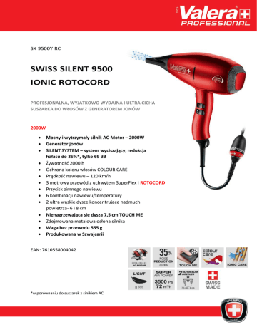 SX 9500Y RC SWISS SILENT 9500 IONIC ROTOCORD PROFESJONALNA, WYJATKOWO WYDAJNA I ULTRA CICHA SUSZARKA DO WŁOSÓW Z GENERATOREM JONÓW 2000W ROTOCORD Mocny i wytrzymały silnik AC-Motor – 2000W Generator jonów SILENT SYSTEM – system wyciszający, redukcja hałasu do 35%*, tylko 69 dB Żywotność 2000 h Ochrona koloru włosów COLOUR CARE Prędkość nawiewu – 120 km/h 3 metrowy przewód z uchwytem SuperFlex i ROTOCORD Przycisk zimnego nawiewu 6 kombinacji nawiewu/temperatury 2 ultra wąskie dysze koncentrujące nadmuch powietrza- 6 i 8 cm Nienagrzewająca się dysza 7,5 cm TOUCH ME Zdejmowana metalowa osłona silnika Waga bez przewodu 555 g Produkowana w Szwajcarii EAN: 7610558004042 *w porównaniu do suszarek z sinikiem AC