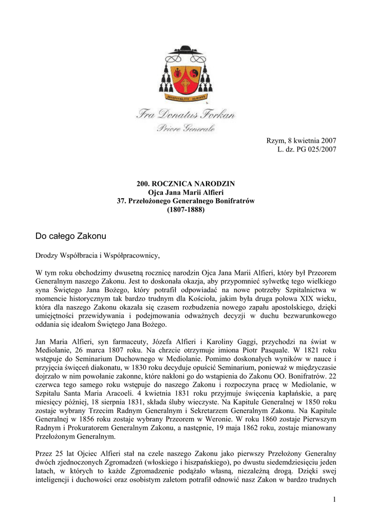 Rzym, 8 kwietnia 2007 L. dz. PG 025/2007 200. ROCZNICA NARODZIN Ojca Jana Marii Alfieri 37. Przełożonego Generalnego Bonifratrów (1807-1888) Do całego Zakonu Drodzy Współbracia i Współpracownicy, W tym roku obchodzimy dwusetną rocznicę narodzin Ojca Jana Marii Alfieri, który był Przeorem Generalnym naszego Zakonu. Jest to doskonała okazja, aby przypomnieć sylwetkę tego wielkiego syna Świętego Jana Bożego, który potrafił odpowiadać na nowe potrzeby Szpitalnictwa w momencie historycznym tak bardzo trudnym dla Kościoła, jakim była druga połowa XIX wieku, która dla naszego Zakonu okazała się czasem rozbudzenia nowego zapału apostolskiego, dzięki umiejętności przewidywania i podejmowania odważnych decyzji w duchu bezwarunkowego oddania się ideałom Świętego Jana Bożego. Jan Maria Alfieri, syn farmaceuty, Józefa Alfieri i Karoliny Gaggi, przychodzi na świat w Mediolanie, 26 marca 1807 roku. Na chrzcie otrzymuje imiona Piotr Pasquale. W 1821 roku wstępuje do Seminarium Duchownego w Mediolanie. Pomimo doskonałych wyników w nauce i przyjęcia święceń diakonatu, w 1830 roku decyduje opuścić Seminarium, ponieważ w międzyczasie dojrzało w nim powołanie zakonne, które nakłoni go do wstąpienia do Zakonu OO. Bonifratrów. 22 czerwca tego samego roku wstępuje do naszego Zakonu i rozpoczyna pracę w Mediolanie, w Szpitalu Santa Maria Aracoeli. 4 kwietnia 1831 roku przyjmuje święcenia kapłańskie, a parę miesięcy później, 18 sierpnia 1831, składa śluby wieczyste. Na Kapitule Generalnej w 1850 roku zostaje wybrany Trzecim Radnym Generalnym i Sekretarzem Generalnym Zakonu. Na Kapitule Generalnej w 1856 roku zostaje wybrany Przeorem w Weronie. W roku 1860 zostaje Pierwszym Radnym i Prokuratorem Generalnym Zakonu, a następnie, 19 maja 1862 roku, zostaje mianowany Przełożonym Generalnym. Przez 25 lat Ojciec Alfieri stał na czele naszego Zakonu jako pierwszy Przełożony Generalny dwóch zjednoczonych Zgromadzeń (włoskiego i hiszpańskiego), po dwustu siedemdziesięciu jeden latach, w których to każde Zgromadzenie podążało własną, niezależną drogą. Dzięki swej inteligencji i duchowości oraz osobistym zaletom potrafił odnowić nasz Zakon w bardzo trudnych 1 czasach, kiedy to liczne wspólnoty ulegały kasacji. Pomimo że były to czasy pełne sprzeczności, Ojciec Alfieri starał się uczyć Współbraci silnej, zdecydowanej i wielkodusznej postawy. Całe jego życie stało się dla nas przykładem, który wzbogacił historię naszego Zakonu. Było to życie zakonnika o głębokiej wierze, która pobudzała w nim wielką miłość i stałą gotowość poświęcania się chorym, ubogim i wszystkim, których Pan Bóg stawiał na jego drodze, oddając się im bez reszty. Jego ludzkie przeżycia są wyrazem pełnego przyjęcia Słowa Bożego. Swój stosunek do Chrystusa Ojciec Alfieri w pełni przeżywał właśnie w Szpitalnictwie. Jego życie jest prawdziwą szkołą Szpitalnictwa. Zdolny przeżywać doświadczenia Świętego Jana Bożego, z wielką rozwagą porafił poświęcać wszystko służbie drugiemu człowiekowi. W służbie cierpiącym żył Bogiem i dla Boga z nadzwyczajną prostotą, cierpliwością i łagodnością ducha. Dzięki temu potrafił uratować Zakon od upadku. Działając rozważnie i podejmując trafne decyzje zdołał uchronić duchowe dziedzictwo Bonifratrów dochowując wiary duchowi Założyciela. Nieodżałowany Ojciec Marchesi wspominał go tymi słowami: “Dał szczególne świadectwo brata szpitalnego, zaangażowanego w odbudowę Zakonu Bonifratrów, nigdy nie oderwanego od tej konkretnej wizji rzeczywistości, która pozwalała mu realizować nowe projekty, dawać przestrogi, wskazywać rozwiązania dla życia Zakonu i misji szpitalnej”. Niestrudzony wizytator domów rozproszonych po całej Europie, stały punkt odniesienia dla całego Zakonu, Ojciec Alfieri posiadał chrześcijański zmysł historyczny. Dar przewidywania sprawił, że postanowił powierzyć Świętemu Benedyktowi Menni, innemu synowi Prowincji Lombardzko-Weneckiej, trudne zadanie odnowienia Zakonu w Hiszpanii, kierując z miłością ojcowską jego działaniami i biorąc na siebie tę wielką odpowiedzialność. Jego życie było dla nas darem Opatrzności, skarbem, którego należy strzec w dalszym ciągu, dlatego że jeszcze dzisiaj może pomagać nam rozpoznawać wolę Bożą wobec naszego Zakonu i jego misji. Ojciec Alfieri potrafił odpowiadać na wyzwania swojej epoki, rozwijać wzorowe Szpitalnictwo, ożywiane miłością Chrystusa, aktualizując charyzmat Świętego Jana Bożego. Wspominając Ojca Alfieri pragnę zachęcić Was do odkrycia tej postaci, kamienia milowego w historii Zakonu. Z braterskim pozdrowieniem w Świętym Janie Bożym. Brat Donatus Forkan Przeor Generalny 2