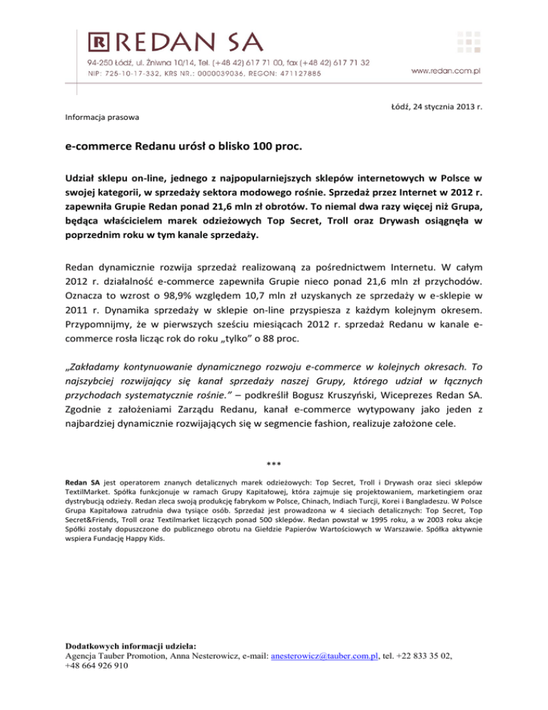 Łódź, 24 stycznia 2013 r. Informacja prasowa e-commerce Redanu urósł o blisko 100 proc. Udział sklepu on-line, jednego z najpopularniejszych sklepów internetowych w Polsce w swojej kategorii, w sprzedaży sektora modowego rośnie. Sprzedaż przez Internet w 2012 r. zapewniła Grupie Redan ponad 21,6 mln zł obrotów. To niemal dwa razy więcej niż Grupa, będąca właścicielem marek odzieżowych Top Secret, Troll oraz Drywash osiągnęła w poprzednim roku w tym kanale sprzedaży. Redan dynamicznie rozwija sprzedaż realizowaną za pośrednictwem Internetu. W całym 2012 r. działalność e-commerce zapewniła Grupie nieco ponad 21,6 mln zł przychodów. Oznacza to wzrost o 98,9% względem 10,7 mln zł uzyskanych ze sprzedaży w e-sklepie w 2011 r. Dynamika sprzedaży w sklepie on-line przyspiesza z każdym kolejnym okresem. Przypomnijmy, że w pierwszych sześciu miesiącach 2012 r. sprzedaż Redanu w kanale ecommerce rosła licząc rok do roku „tylko” o 88 proc. „Zakładamy kontynuowanie dynamicznego rozwoju e-commerce w kolejnych okresach. To najszybciej rozwijający się kanał sprzedaży naszej Grupy, którego udział w łącznych przychodach systematycznie rośnie.” – podkreślił Bogusz Kruszyński, Wiceprezes Redan SA. Zgodnie z założeniami Zarządu Redanu, kanał e-commerce wytypowany jako jeden z najbardziej dynamicznie rozwijających się w segmencie fashion, realizuje założone cele. *** Redan SA jest operatorem znanych detalicznych marek odzieżowych: Top Secret, Troll i Drywash oraz sieci sklepów TextilMarket. Spółka funkcjonuje w ramach Grupy Kapitałowej, która zajmuje się projektowaniem, marketingiem oraz dystrybucją odzieży. Redan zleca swoją produkcję fabrykom w Polsce, Chinach, Indiach Turcji, Korei i Bangladeszu. W Polsce Grupa Kapitałowa zatrudnia dwa tysiące osób. Sprzedaż jest prowadzona w 4 sieciach detalicznych: Top Secret, Top Secret&Friends, Troll oraz Textilmarket liczących ponad 500 sklepów. Redan powstał w 1995 roku, a w 2003 roku akcje Spółki zostały dopuszczone do publicznego obrotu na Giełdzie Papierów Wartościowych w Warszawie. Spółka aktywnie wspiera Fundację Happy Kids. Dodatkowych informacji udziela: Agencja Tauber Promotion, Anna Nesterowicz, e-mail: [email protected], tel. +22 833 35 02, +48 664 926 910