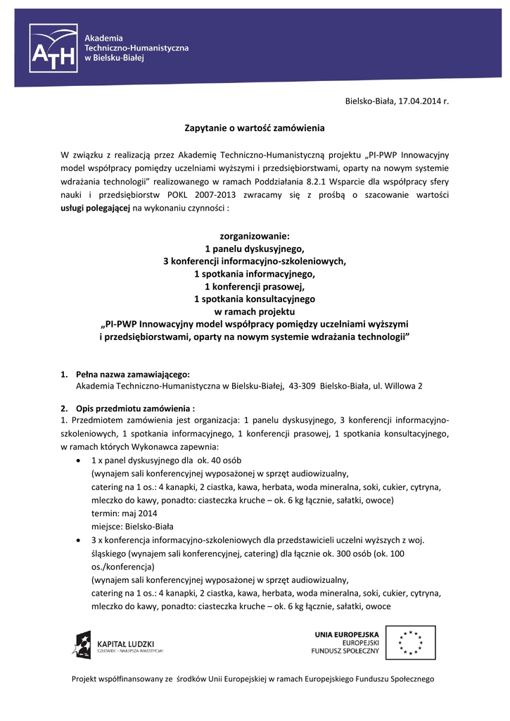 Bielsko-Biała, 17.04.2014 r. Zapytanie o wartość zamówienia W związku z realizacją przez Akademię Techniczno-Humanistyczną projektu „PI-PWP Innowacyjny model współpracy pomiędzy uczelniami wyższymi i przedsiębiorstwami, oparty na nowym systemie wdrażania technologii” realizowanego w ramach Poddziałania 8.2.1 Wsparcie dla współpracy sfery nauki i przedsiębiorstw POKL 2007-2013 zwracamy się z prośbą o szacowanie wartości usługi polegającej na wykonaniu czynności : zorganizowanie: 1 panelu dyskusyjnego, 3 konferencji informacyjno-szkoleniowych, 1 spotkania informacyjnego, 1 konferencji prasowej, 1 spotkania konsultacyjnego w ramach projektu „PI-PWP Innowacyjny model współpracy pomiędzy uczelniami wyższymi i przedsiębiorstwami, oparty na nowym systemie wdrażania technologii” 1. Pełna nazwa zamawiającego: Akademia Techniczno-Humanistyczna w Bielsku-Białej, 43-309 Bielsko-Biała, ul. Willowa 2 2. Opis przedmiotu zamówienia : 1. Przedmiotem zamówienia jest organizacja: 1 panelu dyskusyjnego, 3 konferencji informacyjnoszkoleniowych, 1 spotkania informacyjnego, 1 konferencji prasowej, 1 spotkania konsultacyjnego, w ramach których Wykonawca zapewnia: 1 x panel dyskusyjnego dla ok. 40 osób (wynajem sali konferencyjnej wyposażonej w sprzęt audiowizualny, catering na 1 os.: 4 kanapki, 2 ciastka, kawa, herbata, woda mineralna, soki, cukier, cytryna, mleczko do kawy, ponadto: ciasteczka kruche – ok. 6 kg łącznie, sałatki, owoce) termin: maj 2014 miejsce: Bielsko-Biała 3 x konferencja informacyjno-szkoleniowych dla przedstawicieli uczelni wyższych z woj. śląskiego (wynajem sali konferencyjnej, catering) dla łącznie ok. 300 osób (ok. 100 os./konferencja) (wynajem sali konferencyjnej wyposażonej w sprzęt audiowizualny, catering na 1 os.: 4 kanapki, 2 ciastka, kawa, herbata, woda mineralna, soki, cukier, cytryna, mleczko do kawy, ponadto: ciasteczka kruche – ok. 6 kg łącznie, sałatki, owoce Projekt współfinansowany ze środków Unii Europejskiej w ramach Europejskiego Funduszu Społecznego + jedno ciepłe danie) termin: czerwiec 2014 (Bielsko-Biała), październik 2014 (Katowice lub okolice, Częstochowa) miejsce: Bielsko-Biała, Katowice (lub okolice), Częstochowa 1 x spotkanie informacyjne dot. szans kobiet i mężczyzn (wynajem sali konferencyjnej, catering) dla ok. 100 osób catering na 1 os.: 4 kanapki, 2 ciastka, kawa, herbata, woda mineralna, soki, cukier, cytryna, mleczko do kawy, ponadto: ciasteczka kruche – ok. 6 kg łącznie, sałatki, owoce + jedno ciepłe danie) termin: październik 2014 miejsce: Bielsko-Biała 1 x konferencji prasowej podsumowującej powstały produkt (wynajem sali konferencyjnej, catering) dla ok. 100 osób catering na 1 os.: 4 kanapki, 2 ciastka, kawa, herbata, woda mineralna, soki, cukier, cytryna, mleczko do kawy, ponadto: ciasteczka kruche – ok. 6 kg łącznie, sałatki, owoce) termin: listopad 2014 miejsce: Bielsko-Biała 1 x spotkania konsultacyjnego ekspertów liderów, partnerów projektu oraz grupy odbiorców i użytkowników ) dla ok. 40 osób catering na 1 os.: 4 kanapki, 2 ciastka, kawa, herbata, woda mineralna, soki, cukier, cytryna, mleczko do kawy, ponadto: ciasteczka kruche – ok. 6 kg łącznie, sałatki, owoce) 12 noclegów w pokojach 1 os. x 1 noc termin: maj/czerwiec 2014 miejsce: Bielsko-Biała 2. Termin realizacji przedmiotu zamówienia : maj – listopad 2014 (dokładne daty zostaną ustalona w trakcie realizacji zamówienia). 3. Wymogi związane z przesłaną ofertą: 1. Oferta powinna zawierać cenę brutto. 4. Miejsce i termin składania ofert: Ofertę w ramach rozpoznania cenowego można złożyć w nieprzekraczalnym terminie do dnia 24.04.2014 r. do godz. 12.00 w wersji elektronicznej na e-mail: [email protected]. Informacje dotyczące w/w zamówienia udziela p. Maria Kamińska tel. 33 82 79 445 od poniedziałku do piątku w godzinach 8.00 – 15.00 lub pod adresem e-mail: [email protected]. Informacje dodatkowe: Forma zatrudnienia – umowa zlecenie. Zaznaczam, że niniejsze zapytanie nie stanowi zapytania ofertowego w myśl przepisów ustawy Prawo zamówień publicznych i służy wyłącznie rozpoznaniu rynku. Udział w rozeznaniu rynku nie dotyczy wykonywania czynności związanych z udziałem w postępowaniu o udzielenie zamówienia publicznego. Projekt współfinansowany ze środków Unii Europejskiej w ramach Europejskiego Funduszu Społecznego OFERTA złożona w ramach szacowanie wartości zamówienia usługi polegającej na wykonaniu czynności: zorganizowanie: 1 panelu dyskusyjnego, 3 konferencji informacyjno-szkoleniowych, 1 spotkania informacyjnego, 1 konferencji prasowej, 1 spotkania konsultacyjnego w ramach projektu „PI-PWP Innowacyjny model współpracy pomiędzy uczelniami wyższymi i przedsiębiorstwami, oparty na nowym systemie wdrażania technologii” POKL.08.02.01-24-009/11 realizowanego w ramach Poddziałania 8.2.1 Wsparcie dla współpracy sfery nauki i przedsiębiorstw PO KL Zamawiający: Akademia Techniczno-Humanistyczna w Bielsku-Białej, 43-309 Bielsko-Biała, ul. Willowa 2 Nazwa/Imię nazwisko oraz adres Wykonawcy: ……………………………………………………………………….………..….. NIP:……………………..…………… REGON: …………………………….. Oferujemy za wykonanie całości przedmiotu zamówienia cenę brutto ………………. zł. Oświadczam, iż zapoznałem się z opisem przedmiotu zamówienia i wymogami Zamawiającego i nie wnoszę do nich żadnych zastrzeżeń. .................................., dnia ............................, 20….. roku. ............................................................................. (pieczęć i podpis osoby uprawnionej do składania oświadczeń woli w imieniu Wykonawcy) Projekt współfinansowany ze środków Unii Europejskiej w ramach Europejskiego Funduszu Społecznego