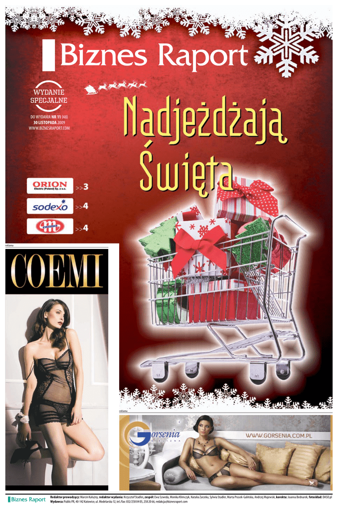 do wydania nr 11 (48) 30 listopada 2009 www.biznesraport.com reklama reklama Redaktor prowadzący: Marcin Kałużny, redaktor wydania: Krzysztof Stadler, zespół: Ewa Szweda, Monika Klimczyk, Natalia Zarzeka, Sylwia Stadler, Marta Prusek-Galińska, Andrzej Majewski, korekta: Joanna Bednarek, fotoskład: DASO.pl Wydawca: Public PR, 40-142 Katowice, ul. Modelarska 12, tel./fax: 032/258 04 05, 258 20 66, [email protected] Biznes Raport F | poniedziałek 30 listopada 2009 | nr 11 (48) KOSMETYKI | KOLAGEN AKTIV PROF. PRZYBYLSKIEGO NATURALNIE SPRAWDZONY Dodatek Informacyjno-Promocyjny www.biznesraport.com reklama Prezent na zdrowie! Rozmowa z Anną Pikura, właścicielką firmy AP BOSS Sp.k. Kolagen Aktiv Prof. Przybylskiego znakomicie uzupełnia niedobory kolagenu w organizmie, omijając przy tym układ pokarmowy. Technologię pozyskiwania preparatu chronią patenty – polski i amerykański. Do kogo skierowany jest ten kosmeceutyk? - W zasadzie dla każdego – młodego i dojrzałego. Badania dowodzą, że braki kolagenu w organizmie człowieka pojawiają się już po 25. roku życia. A czasem nawet wcześniej, w wyniku chorób i stresu. Wszystkie dostępne obecnie na rynku kosmetyki działają jedynie na powierzchni naskórka. Jak Pan zauważył, nasz Kolagen ma zdolność przenikania przez pory w skórze, dostaje się do przestrzeni wewnątrzkomórkowej, krąży z płynem wewnątrzkomórkowym i wbudowuje się tam, gdzie brak kolagenu. Dzięki temu daje znakomite efekty. No właśnie – jakie? - Wpływa zarówno na urodę, jak i sprzyja zdrowiu. Kolagen Aktiv występuje w kilku odmianach zależnych od tego, na jaką partię ciała chcemy go aplikować. Znakomicie sprawdza się jako preparat ekspresowo wygładzający zmarszczki i bruzdy, ale i do pielęgnacji włosów i paznokci, do higieny intymnej dla pań i panów reklama w każdym wieku oraz w kosmetyce całego ciała. Wspomaga bowiem zwalczanie cellulitu i rozstępów, jego stosowanie jest również wskazane, gdy pojawiają się żylaki oraz bóle stawów. Ten bardzo uniwersalny preparat zyskał wielu zwolenników, ale także uznanie rynku. - Zgadza się. Tylko w ostatnich kilku miesiącach Kolagen otrzymał dwie prestiżowe nagrody. Gazeta Warszawska przyznała nam nagrodę „Najlepszy Kosmetyk z Kolagenem”. Drugie wyróżnienie – Qltowy Koncept – pochodzi od redakcji czasopisma branżowego Kosmetyki. Z niecierpliwością czekamy także na rozstrzygnięcie organizowanego przez Państwa Redakcję konkursu JAKOŚĆ ROKU 2009. Zatem zapewne znakomicie się sprzedaje? - Rzeczywiście, zwiększyliśmy sprzedaż do hurtowni farmaceutycznych oraz aptek. Nasze produkty można także nabyć w salonach firmowych AP BOSS ANNA PIKURA w Gdyni, Warszawie, Krakowie oraz we Wrocławiu. Ponadto również nasza strona internetowa służy jako nowoczesny i bardzo wygodny kanał dystrybucji. Sprzedaż, o której mówimy, będzie stale rosła ponieważ sukcesywnie poszerzamy naszą ofertę. Oprócz znanego i popularnego już Kolagenu Białego, Szarego, Grafitowego i Intymnego wprowadzimy na rynek całą gamę produktów komplementarnych, uzupełniających kurację kolagenową. Warto zatem śledzić Państwa nowości. Dziękuję za rozmowę. Krzysztof Stadler Więcej na www.apboss.pl BRANŻA DZIEWIARSKA | WOLA NOMINOWANA DO TYTUŁU JAKOŚĆ ROKU 2009 Stopy wolą Wolę Rodzina jest dla nas filarem szczęścia i poczucia bezpieczeństwa. Chcemy dla niej jak najlepiej i dlatego staramy się zadbać o każdy element jej życia. Nawet z pozoru tak prozaiczne rzeczy jak skarpetki czy rajstopy stanowią w rzeczywistości bardzo ważną część naszej codzienności. Gwarantują nam ciepło w chłodne dni i komfort, kiedy nosimy zimowe obuwie. Ale co wybrać, by było nie tylko wygodnie, ale też dobrej jakości? M arki Wola nie trzeba nikomu przedstawiać. Produkty sygnowane logiem łabędzia znane są całym pokoleniom od ponad pięćdziesięciu lat. Cieszą się zaufaniem rodziców i dziadków. Skarpetki i rajstopki ze Zduńskiej Woli to synonim najwyższej jakości, trwałości i wygody noszenia. - Zwracamy szczególną uwagę na przędzę, którą później wykorzystujemy w produkcji. Poszukujemy wyłącznie renomowanych dostawców bawełny, którzy posiadają europejskie certyfikaty, a ich produkty spełniają najsurowsze normy jakościowe. Wszystkie surowce poddajemy dokładnym badaniom, prowadzonym w naszym własnym laboratorium. Każdy parametr jest ważny. Sprawdzamy grubość i wytrzymałość przędzy, a po farbowaniu jej odporność. Drobiazgowo monitorujemy każdy etap produkcji. Dzięki temu nasze wyroby końcowe uzyskały szereg certyfikatów – austriacki Öko-tex Standard 100, czy przyznawane przez Instytut Włókiennictwa w Łodzi – Bezpieczny dla niemowląt i Bezpieczny dla dziecka. Umieszczamy te znaki na opakowaniach naszych produktów jako dodatkową gwarancję najwyższej jakości dla klienta. Nasze skarpetki i inne produkty mają być przede wszystkim bezpieczne dla dziecka – podkreśla Jacek Skórzyński, specjalista ds. kontroli jakości Wola Sp. z o.o. Wola bezapelacyjnie stawia na jakość. Ale jest to także firma, która chce być blisko swojego klienta. Jednym z jej naczelnych celów jest budowanie trwałych relacji opartych na wzajemnym zaufaniu. Klienci wielokrotnie udowodnili, jak bardzo cenią wyroby Woli, dwukrotnie przyznając jej Złoty Laur Klienta. - Cieszy nas fakt, że klienci doceniają wysiłek, który wkładamy w naszą pracę. Jednocześnie czujemy się wobec nich zobowiązani. Chcemy budować stabilną i nowoczesną firmę. Innowacyjne rozwiązania w zakresie technologii i wzornictwa umożliwiają nam tworzenie produktów, których oczekują nasi klienci. A zadowolenie z ich strony jest dla nas powodem do dumy - mówi Agnieszka Dembska, specjalista ds. marketingu Wola Sp. z o.o. Zaangażowanie firmy w tworzenie wyjątkowych pod względem jakości wyrobów doceniają także niezależne gremia. Nominacja d