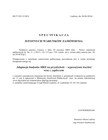 Lędziny, dn. 04.06.2014r. BI.271.02.12.2014 S P E C YF I K A C J A ISTOTNYCH WARUNKÓW ZAMÓWIENIA Podstawa prawna: Ustawa z dnia 29 stycznia 2004 roku – Prawo zamówień publicznych (tj. Dz. U. z 2013 r. Nr 113 poz. 759 z późn. zm.), zwana dalej ustawą (art. 10; art.39-46 Pzp.). Postępowanie o udzielenie zamówienia publicznego prowadzone jest w trybie przetargu nieograniczonego na: Adaptacja budynku MKS na przedszkole – wyposażenie kuchni wraz z zapleczem o wartości szacunkowej mniejszej niż kwoty określone w przepisach wydanych na podstawie art. 11 ust. 8 ogłoszone w Biuletynie Zamówień Publicznych oraz na stronie internetowej www.bip.ledzin.pl./content/show.php?pg=przetargi w siedzibie zamawiającego Urząd Miasta Lędziny, ul. Lędzińska 55, 43-143 Lędziny ZATWIERDZAM: Burmistrz Miasta Lędziny mgr Wiesław Stambrowski §1 Nazwa oraz adres Zamawiającego (art. 36 ust. 1 pkt. 1); Gmina Lędziny ul. Lędzińska 55, 43-143 Lędziny NIP – 646-10-30-597 telefon: 32/2166511, fax: 32/2166508 strona internetowa: www.ledziny.pl www.bip.ledzin.pl./content/show.php?pg=przetargi §2 Tryb udzielenia zamówienia (art. 10. ust. 1; art. 36-46 ; art. 36 ust. 1 pkt 2.) PRZETARG NIEOGRANICZONY o wartości szacunkowej mniejszej niż kwoty określone w przepisach wydanych na podstawie art. 11 ust.8. §3 Opis przedmiotu zamówienia (art. 29 i 30; art.36 ust. 1 pkt.3) 1. Przedmiot zamówienia posiada kody CPV : 39 14 10 00 39 14 14 00 39 14 11 00 -2 -6 -3 meble i wyposażenie kuchni kuchnie do zabudowy regały Przedmiot zamówienia: Przedmiotem zamówienia jest wyposażenie kuchni z zapleczem oraz wydawalni i zmywalni na I oraz II piętrze Miejskiego Przedszkola Nr 1 w Lędzinach w siedzibie przy ulicy Stadionowej zgodnie z załączonym wykazem (załącznik nr 1a do oferty), rysunkiem lokalizacji wyposażenia, załączoną dokumentacją projektową budowlaną i wykonawczą oraz ustaleniami z Zamawiającym. Asortyment będący przedmiotem zamówienia musi być fabrycznie nowy, nieużywany. 1. Wymagania szczegółowe do przedmiotu zamówienia: 1.1 W przypadku bloków wielostanowiskowych, wymagane jest takie dobranie poszczególnych urządzeń, aby zachowana została jedna linia ustawienia wyposażenia. 1.2 Wykonawca dostarczy na własny koszt i własne ryzyko oraz zamontuje fabrycznie nowe profesjonalne urządzenia kuchenne o wysokiej jakości i trwałości o klasie energetycznej AA, rok produkcji nie wcześniej niż 2013 rok, o parametrach materiałowych i użytkowych wymaganych przez Zamawiającego, wskazanych w załączniku Nr 1a do SIWZ. Tabela wyposażenia kuchni i kalkulacja ceny ofertowej. 1.3 Wykonawca winien skalkulować ewentualną konieczność przystosowania już istniejących instalacji do wymogów wyposażenia zgodnie z technologią oraz dostarczyć elementy konieczne do funkcjonowania dostarczonych urządzeń, takie jak: króćce przyłączeniowe, syfony, złączki, przewody o wymaganych parametrach materiałowych, użytkowych i technologicznych. 1.4 Przed przystąpieniem do realizacji zamówienia wskazane jest, by Wykonawca przeprowadził wizję lokalną oraz dokonał niezbędnych pomiarów na budowie w celu dostosowania wymiarów wyposażenia do wymiarów pomieszczeń i uzyskania informacji koniecznych do prawidłowej realizacji zadania pod względem technicznym. Wszystkie koszty związane z jej przeprowadzeniem ponosi Wykonawca. 1.5. Wykonawca zobowiązany jest do przeprowadzenia prób zainstalowanego wyposażenia kuchni na własny koszt. 1.6 Wszystkie szkody spowodowane przez Wykonawcę i powstałe w trakcie realizacji przedmiotu zamówienia Wykonawca zobowiązuje się usunąć na własny koszt. 1.7 Zamawiający wymaga udzielenia przez Wykonawcę gwarancji na dostarczone urządzenia oraz wykonane prace instalacyjne na okres 24 miesięcy, jeżeli gwarancja producenta urządzenia jest dłuższa obowiązuje gwarancja producenta. 1.8 Serwis gwarancyjny wynosi: 1.8.1 maksymalny czas liczony od chwili zgłoszenia awarii do chwili przybycia serwisanta – 24 godziny, do chwili usunięcia awarii – 7 dni, w przypadku naprawy przekraczającej 7 dni kalendarzowych, Wykonawca zapewni urządzenie zastępcze na czas naprawy o parametrach nie gorszych niż urządzenie naprawiane. 1.8.2 Wykonawca wykona naprawę w pierwszej kolejności u Zamawiającego, a jeżeli nie jest to możliwe to w autoryzowanym serwisie. 1.8.3. Wykonawca przeprowadzi bezpłatny przegląd w okresie gwarancji min. 1 raz w roku, czyli min. 2 razy w okresie trwania gwarancji. 1.8.4 Wykonawca w okresie gwarancyjnym, tj. 24 miesięcy zobowiązany będzie do bezpłatnego przeszkolenia personelu kuchni w zakresie obsługi dostarczonych urządzeń. 1.8.5 W całym okresie udzielonej gwarancji Wykonawca zapewni przyjmowanie zgłoszeń telefonicznie lub faksem w dni robocze w godz.: 8:00 - 16:00. 1.9. Wykonawca jest zobowiązany do dostarczenia kart gwarancyjnych dostarczonego sprzętu, instrukcję obsługi w języku polskim i certyfikatów CE. 1.10.Wyspecyfikowanie w załączniku Nr 1a- Tabela wyposażenia kuchni z zapleczem oraz wydawalni i zmywalni na I oraz II piętrze i kalkulacja ceny ofertowej urządzenia Zamawiający traktuje w sposób określony w art. 29 ust. 3 ustawy Pzp. Dopuszcza złożenie oferty na dostawę urządzeń, które są równoważne pod względem technicznym. Przez urządzenie równoważne uważa się urządzenie nie pochodzące od wskazanego w opisie producenta (pochodzące np. z produkcji licencyjnej oraz od innych wytwórców), spełniające wszystkie wymogi, normy i parametry techniczne, o wydajności odpowiadającej wskazanemu urządzeniu oraz wykonane w całości z nowych elementów. 1.11. Meble ze stali nierdzewnej muszą być spawane, zlewy wyposażone w syfony. 1.12. Wszelakie wątpliwości powstałe w trakcie zamówienia winny być konsultowane i uzgadniane z Zamawiającym. 1.13. Wykonawca powinien przedłożyć odpowiednie certyfikaty lub atesty, o których mowa w rozporządzeniu Mini