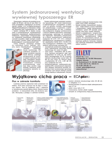 System jednorurowej wentylacji wywiewnej typoszeregu ER Opracowany i wdrożony do produkcji na początku lat 90-tych, stał się od razu hitem na rynku europejskim, nagradzanym za innowacyjność i „design”, m.in. na Międzynarodowych Targach Przemysłowych w Hanowerze. W Polsce stosowany jest z powodzeniem od 1998 r. System wentylacji ER to idealne rozwiązanie w nowobudowanych, wysokościowych budynkach mieszkalnych, apartamentowych, hotelowych, zapewniające energooszczędną i długoletnią bezawaryjną eksploatację, a przede wszystkim, dzięki usunięciu zużytego powietrza, komfort i dobre samopoczucie przebywających w pomieszczeniach ludzi. Cechy systemu: wentylacja wywiewna z domowych kuchni, łazienek i WC, przy użyciu indywidualnych wentylatorów i jednego wspólnego kanału wywiewnego. Dla uniknięcia przepływu zużytego powietrza poprzez kanał zbiorczy z jednego pomieszczenia do innych, w tulejach wylotowych każdego wentylatora zainstalowana jest klapa zwrotna. W obudowach z ochroną przeciwpożarową metalowe klapy zwrotne mają blokadę zwalnianą przez przepalenie elementu topikowego. System jednorurowej wentylacji wywiewnej typoszeregu ER został dopracowany w najdrobniejszych szczegółach w zależności od sposobu montażu natynkowego lub podtynkowego; w wykonaniu z ochroną przeciwpożarową lub bez; z możliwością podłączenia drugiego pomieszczenia; z różnymi układami sterowania: czasowego, przerywanego, zależnego od oświetlenia lub wilgotności. Wentylatory produkowane są w dwóch podstawowych wielkościach wydajności 62 m3/h i 101 m3/h z silnikami jednobiegowymi, dwubiegowymi o wydajności odpowiednio 62/35 m3/h i 101/35 m3/h oraz trzybiegowymi 100/60/40 m3/h. Zalety systemu jednorurowej wentylacji ER: – oszczędność powierzchni użytkowej - poprzez zastosowanie zbiorczego kanału wywiewnego dla nawet 20 pięter, – cicha praca – wentylatory ER są aktualnie najciszej pracującymi tego typu urządzeniami na rynku np. dla wentylatora dwubiegowego ER 60 G poziom ciśnienia akustycznego wynosi tylko 26 dB (A) przy pracy na niższym biegu z wydajnością 35 m3/h, a 36 dB (A) przy wydajności 62 m3/h, – energooszczędność - zastosowanie wentylatorów ER z wbudowanymi odpowiednimi układami sterowania pozwala zredukować ilość wywiewanego ogrzanego powietrza i tym samym obniżyć zużycie energii cieplnej w mieszkaniach. Na pod- kreślenie zasługuje również bardzo mały pobór mocy przez wentylator, – łatwość montażu, niezawodność i skuteczność – dzięki niskiemu zużyciu materiałów i komponentów, a także uproszczonemu montażowi, system ER pozwala zaoszczędzić czas pracy i koszty robocizny, – łatwość w projektowaniu - program komputerowy MAICO pozwala na szybkie i bezbłędne zaprojektowanie całego systemu. Po wprowadzeniu danych, automatycznie wymiaruje średnice pionów, wykonuje graficzne schematy instalacji oraz wykonuje zestawienie materiałowe całości systemu. Elvent Sp. z o.o. ul.Puławska 61, 02-595 Warszawa Oddział Gdańsk: ul. Budowlanych 31, 80-298 Gdańsk tel. 0-58/ 345-14-76, 346-03-13 fax 0-58/ 345-26-1 6 e-mail: [email protected] www.elvent.pl Wyjątkowo cicha praca – Plus w zakresie komfortu Łazienka powinna zapewniać dość przestrzeni do relaksu. ECA piano przyczyni się do tego w znacznym stopniu. Jest on wyjątkowo cichy i zapewnia w nienatarczywy sposób lepszy klimat. Zawsze świeże powietrze - w rzeczywiście cichy, ale skuteczny sposób. Skorzystaj z postępu w zakresie komfortu. • poziom ciśnienia akustycznego tylko 26 dB (A) w odległości 3 m • bezpieczeństwo w łazience dzięki zabezpieczeniu typu IP X4 • pobór mocy tylko 8 W • nowoczesny, bardzo płaski wygląd • komplet ze zintegrowaną klapą przeciwzwrotną I N S TA L A C J E – D O D AT E K 11