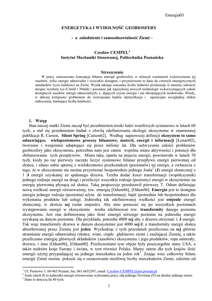 Emergia03 ENERGETYKA I WYDOLNOŚĆ GEOBIOSFERY - a zaludnienie i samoodnawialność Ziemi – Czesław CEMPEL1 Instytut Mechaniki Stosowanej, Politechnika Poznańska Streszczenie W pracy zastosowano koncepcję bilansu emergii geobiosfery w różnych wariantach wykorzystania jej zasobów, tylko energie odnawialne i wszystkie dostępne, i przymierzono te dane do czterech emergetycznych standardów życia ludzkości na Ziemi. Wynik takiego szacunku liczby ludności przekonuje iż musimy odrzucić skrajne rezultaty (ca 0.3mld i 30mld) i poszukać jak najszybciej nowych technologii wykorzystujących całość dostępnych zasobów energii odnawialnych, a dających czyste energie i nie obciążających środowisko. Wtedy, w dalszej kolejności problemem do rozwiązania będzie identyfikacja i operacyjne uwzględnię efektu zatłoczenia, limitujące liczbę ludzkości. 1. Wstęp Stan naszej matki Ziemi zaczął być przedmiotem troski ludzi wrażliwych systemowo w latach 60 tych, a stał się przedmiotem badań z chwilą zdefiniowania ekologii ekosystemu w znamiennej publikacji R. Carson, Silent Spring [Carson62]. Według najnowszej definicji ekosystem to samo odnawiające, wielopoziomowe procesy bilansowe, materii, energii i informacji [Lenart02], tworzone i wzajemnie adaptujące się przez miliony lat. Dla uchwycenia całości problemów geobiosfery jako ekosystemu, potrzebna nam jest zatem wspólna miara aktywności i potencji dla zbilansowania tych przepływów. Miara taka, oparta na pojeciu energii, powstawała w latach 70 tych, kiedy po raz pierwszy zaczęto liczyć systemowe bilanse przepływu energii pierwotnej od słońca, i zdano sobie sprawę z wielokrotności przekształceń (poziomów) tej energii, a zwłaszcza z tego, że w ekosystemie nie można przyrównać bezpośrednio jednego Joula2 (J) energii słonecznej z 1 J energii uzyskanej ze spalonego drzewa. Trzeba dodać koszt transformacji (współczynnik) jednego rodzaju energii na drugi i przeliczyć wszystkie rodzaje (poziomy) energii w ekosystemie na energię pierwotną płynącą od słońca. Taką propozycje przedstawił pierwszy T. Odum definiując nową wielkość energii równoważnej, tzw. emergię [Odum86], [Odum96]. Emergia jest to dostępna energia jednego rodzaju (poziomu) użyta do transformacji, bądź (pośrednio lub bezpośrednio) dla wykonania produktu lub usługi. Jednostką tak zdefiniowanej wielkości jest emjoule energii słonecznej, w skrócie sej (solar emjoule). Aby móc poruszać się po wszystkich poziomach występowania energii w ekosystemie trzeba zdefiniować tzw. transformity danego poziomu ekosystemu. Jest ona definiowaną jako ilość emergii niższego poziomu na jednostkę energii uzyskaną na danym poziomie. Dla przykładu, potrzeba 4000 sej aby z drzewa otrzymać 1 J energii. Tak więc transformity drzewa w danym ekosystemie jest 4000 sej/J, a transformity energii słońca absorbowanej przez Ziemię jest jeden. Wychodząc z tych przesłanek przeliczono na sej główne strumienie energii odnawialnej (słońce, wiatr, ciepło głębinowe ziemi ) zasilającej Ziemię, a także przeliczono emergię głównych składników (zasobów) ekosystemu i jego produktów, ropa minerały, drzewo, i inne [Odum96], [Odum00]. Przeliczeniami tym objęte były poszczególne stany USA, a także niektóre kraje Europy i świata, w tym również Polska. Mamy zatem dla tych krajów ilość emergii użytej przypadającej na jednego mieszkańca na jeden rok3. Znając wiec całkowity bilans emergii Ziemi można pokusić się o oszacowanie możliwej liczby mieszkańców Ziemi, zależnie od 1 Ul. Piotrowo 3, 60-965 Poznań, fax; 061.6652307, email: [email protected] Joule (skrót J) to jednostka energii równoważna wykonanej pracy siłą jednego Newtona (N) na drodze jednego metra. 3 Dane te dotyczą lat 80 tych. 2 1 Emergia03 rodzaju użytkowanej emergii (odnawialna / nieodnawialna) a także zależnie od emergetycznego standardu życia jej mieszkańców, np. standard Indii czy też Europy Zachodniej. Taki jest bezpośredni cel niniejszych rozważań i kalkulacji, a dalszy cel to dać zatroskanej eko-społeczności Ziemi dodatkową zagregowaną informacje i wiedzę, w którą stronę zmierzamy jako ludzkość (świadomie lub nie). Według wiedzy autora jest to pierwsze tego typu oszacowanie, zatem nie jest wolne od różnego typu nieścisłości, będę więc wdzięczny za informacje i dyskusję. 2. Energetyka geobiosfery System geobiosfery Ziemia taktowany jako otwarty otrzymuje trzy zewnętrzne zasilania w energię; jest to pochłonięte promieniowanie słoneczne, ciepło głębinowych warstw ziemi, oraz energia przypływów powodowana wpływem księżyca i słońca. Ciepło absorbowanych promieni słonecznych ogrzewa główne elementy składowe systemu; atmosferę, powierzchnię ziemi i oceany (rys. 1). Do tego powierzchnia ziemi ogrzewana jest także przez ciepło warstw głębinowych i ciepło z naturalnego rozpadu promieniotwórczego. Te wszystkie zasoby energii płynące do powierzchni ziemi na której rozwija się cywilizacja nazywamy zasobami odnawialnymi, a to z uwagi na bardzo długi czas ich prawie niezmienionego działania, w porównaniu z czasem występowania cywilizacji jaką znamy. Do tego cywilizacja ludzka nauczyła się wykorzystywać zasoby energii i materiałów możliwych do uzyskania w górnych warstwach płaszcza ziemi, takich jak rudy, minerały, ropa, mające jednoznaczny charakter zasobów nieodnawialnych. Każde przekształcenie energii pierwotnej słońca na inne formy energii, mierzone już w emergii, powiązane jest zawsze ze stratami, które stanowią nieraz znaczną cześć energii pierwotnej. Straty te wchodzą również w zdefiniowany wcześniej współczynnik miedzy -poziomowego przekształcenia _transformity. Ponadto podsystem cywilizacja daje zwrotnie swój wpływ, na ogół destrukcyjny, do każdego innego podsystemu geobiosfery. Całość omówionego systemu zasilania i interakcji eme