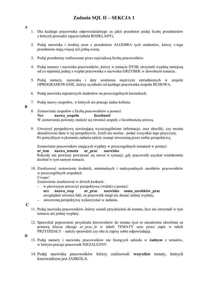 Zadania SQL II – SEKCJA 1 A 1. Dla każdego pracownika odpowiedzialnego za jakiś przedmiot podaj liczbę przedmiotów z których prowadzi zajęcia (tabela ROZKLADY). 2. Podaj nazwiska i średnią ocen z przedmiotu ALGEBRA tych studentów, którzy z tego przedmiotu mają więcej niż jedną ocenę. 3. Podaj przedmioty realizowane przez największą liczbę pracowników. 4. Podaj numery i nazwiska pracowników, którzy w temacie DYSK otrzymali wypłatę mniejszą od co najmniej jednej z wypłat pracownika o nazwisku GRZYBEK w dowolnym temacie. 5. Podaj numery, nazwiska i daty urodzenia mężczyzn zatrudnionych w zespole OPROGRAMOWANIE, którzy są młodsi od każdego pracownika zespołu BUDOWA. 6. Podaj nazwiska najstarszych studentów na poszczególnych kierunkach. 7. Podaj nazwy zespołów, w których nie pracuje żadna kobieta. B 8. Zestawienie zespołów z liczbą pracowników o postaci: Nrz nazwa_zespołu liczebność W zestawieniu powinny znaleźć się również zespoły z liczebnością zerową. 9. Utworzyć perspektywę zawierającą wyszczególnione informacje, oraz określić, czy można aktualizować dane w tej perspektywie. Jeżeli nie można - podać wszystkie tego przyczyny. Po pomyślnym wykonaniu zadania należy usunąć utworzoną przez siebie perspektywę. Zestawienie pracowników mających wypłaty w poszczególnych tematach w postaci: nr_tem nazwa_tematu nr_prac nazwisko Rekordy nie powinny powtarzać się nawet w sytuacji, gdy pracownik uzyskał wielokrotnie dochód w tym samym temacie. 10. Zrealizować zestawienie średnich, minimalnych i maksymalnych zarobków pracowników w poszczególnych zespołach. Uwaga! Zestawienie zrealizować w dwóch krokach: w pierwszym utworzyć perspektywę (widok) o postaci: nrz nazwa_zesp nr_prac nazwisko suma_zarobków_prac uwzględnić również fakt, że pracownik mógł nie dostać żadnej wypłaty, utworzoną perspektywę wykorzystać w zadaniu. C 11. Podaj nazwiska pracowników, którzy zostali przydzieleni do tematu, lecz nie otrzymali w tym temacie ani jednej wypłaty. 12. Sprawdzić poprawność przydziału kierowników do tematu (jest to niezależnie określone za pomocą klucza obcego nr_prac_kt w tabeli TEMATY oraz przez zapis w tabeli PRZYDZIAŁY – należy sprawdzić czy oba te zapisy sobie odpowiadają). D 13. Podaj numery i nazwiska pracowników nie biorących udziału w żadnym z tematów, w którym pracuje pracownik NIEZALEZNY. 14. Podaj nazwiska pracowników którzy realizowali wszystkie tematy, których kierownikiem jest JASKOLA.