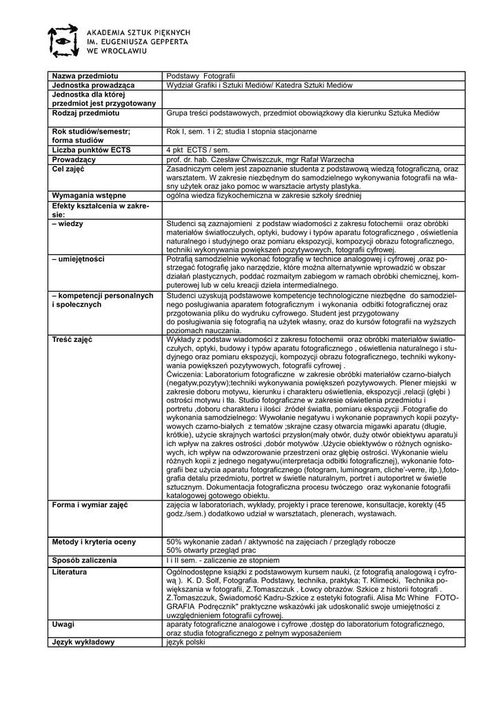Nazwa przedmiotu Jednostka prowadząca Jednostka dla której przedmiot jest przygotowany Rodzaj przedmiotu Podstawy Fotografii Wydział Grafiki i Sztuki Mediów/ Katedra Sztuki Mediów Rok studiów/semestr; forma studiów Liczba punktów ECTS Prowadzący Cel zajęć Rok I, sem. 1 i 2; studia I stopnia stacjonarne Wymagania wstępne Efekty kształcenia w zakresie: – wiedzy – umiejętności – kompetencji personalnych i społecznych Treść zajęć Forma i wymiar zajęć Metody i kryteria oceny Sposób zaliczenia Literatura Uwagi Język wykładowy Grupa treści podstawowych, przedmiot obowiązkowy dla kierunku Sztuka Mediów 4 pkt ECTS / sem. prof. dr. hab. Czesław Chwiszczuk, mgr Rafał Warzecha Zasadniczym celem jest zapoznanie studenta z podstawową wiedzą fotograficzną, oraz warsztatem. W zakresie niezbędnym do samodzielnego wykonywania fotografii na własny użytek oraz jako pomoc w warsztacie artysty plastyka. ogólna wiedza fizykochemiczna w zakresie szkoły średniej Studenci są zaznajomieni z podstaw wiadomości z zakresu fotochemii oraz obróbki materiałów światłoczułych, optyki, budowy i typów aparatu fotograficznego , oświetlenia naturalnego i studyjnego oraz pomiaru ekspozycji, kompozycji obrazu fotograficznego, techniki wykonywania powiększeń pozytywowych, fotografii cyfrowej. Potrafią samodzielnie wykonać fotografię w technice analogowej i cyfrowej ,oraz postrzegać fotografię jako narzędzie, które można alternatywnie wprowadzić w obszar działań plastycznych, poddać rozmaitym zabiegom w ramach obróbki chemicznej, komputerowej lub w celu kreacji dzieła intermedialnego. Studenci uzyskują podstawowe kompetencje technologiczne niezbędne do samodzielnego posługiwania aparatem fotograficznym i wykonania odbitki fotograficznej oraz przgotowania pliku do wydruku cyfrowego. Student jest przygotowany do posługiwania się fotografią na użytek własny, oraz do kursów fotografii na wyższych poziomach nauczania. Wykłady z podstaw wiadomości z zakresu fotochemii oraz obróbki materiałów światłoczułych, optyki, budowy i typów aparatu fotograficznego , oświetlenia naturalnego i studyjnego oraz pomiaru ekspozycji, kompozycji obrazu fotograficznego, techniki wykonywania powiększeń pozytywowych, fotografii cyfrowej . Ćwiczenia: Laboratorium fotograficzne w zakresie obróbki materiałów czarno-białych (negatyw,pozytyw);techniki wykonywania powiększeń pozytywowych. Plener miejski w zakresie doboru motywu, kierunku i charakteru oświetlenia, ekspozycji ,relacji (głębi ) ostrości motywu i tła. Studio fotograficzne w zakresie oświetlenia przedmiotu i portretu ,doboru charakteru i ilości źródeł światła, pomiaru ekspozycji .Fotografie do wykonania samodzielnego: Wywołanie negatywu i wykonanie poprawnych kopii pozytywowych czarno-białych z tematów ;skrajne czasy otwarcia migawki aparatu (długie, krótkie), użycie skrajnych wartości przysłon(mały otwór, duży otwór obiektywu aparatu)i ich wpływ na zakres ostrości ,dobór motywów .Użycie obiektywów o różnych ogniskowych, ich wpływ na odwzorowanie przestrzeni oraz głębię ostrości. Wykonanie wielu różnych kopii z jednego negatywu(interpretacja odbitki fotograficznej), wykonanie fotografii bez użycia aparatu fotograficznego (fotogram, luminogram, cliche’-verre, itp.),fotografia detalu przedmiotu, portret w świetle naturalnym, portret i autoportret w świetle sztucznym. Dokumentacja fotograficzna procesu twóczego oraz wykonanie fotografii katalogowej gotowego obiektu. zajęcia w laboratoriach, wykłady, projekty i prace terenowe, konsultacje, korekty (45 godz./sem.) dodatkowo udział w warsztatach, plenerach, wystawach. 50% wykonanie zadań / aktywność na zajęciach / przeglądy robocze 50% otwarty przegląd prac I i II sem. - zaliczenie ze stopniem Ogólnodostępne książki z podstawowym kursem nauki, (z fotografią analogową i cyfrową ). K. D. Solf, Fotografia. Podstawy, technika, praktyka; T. Klimecki, Technika powiększania w fotografii, Z.Tomaszczuk , Łowcy obrazów. Szkice z historii fotografi . Z.Tomaszczuk, Świadomość Kadru-Szkice z estetyki fotografii. Alisa Mc Whine FOTOGRAFIA Podręcznik" praktyczne wskazówki jak udoskonalić swoje umiejętności z uwzględnieniem fotografii cyfrowej. aparaty fotograficzne analogowe i cyfrowe ,dostęp do laboratorium fotograficznego, oraz studia fotograficznego z pełnym wyposażeniem język polski