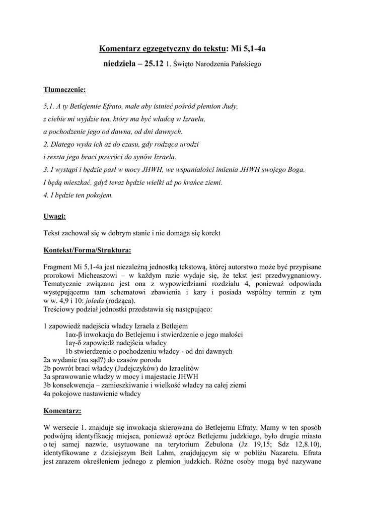 Komentarz egzegetyczny do tekstu: Mi 5,1-4a niedziela – 25.12 1. Święto Narodzenia Pańskiego Tłumaczenie: 5,1. A ty Betlejemie Efrato, małe aby istnieć pośród plemion Judy, z ciebie mi wyjdzie ten, który ma być władcą w Izraelu, a pochodzenie jego od dawna, od dni dawnych. 2. Dlatego wyda ich aż do czasu, gdy rodząca urodzi i reszta jego braci powróci do synów Izraela. 3. I wystąpi i będzie pasł w mocy JHWH, we wspaniałości imienia JHWH swojego Boga. I będą mieszkać, gdyż teraz będzie wielki aż po krańce ziemi. 4. I będzie ten pokojem. Uwagi: Tekst zachował się w dobrym stanie i nie domaga się korekt Kontekst/Forma/Struktura: Fragment Mi 5,1-4a jest niezależną jednostką tekstową, której autorstwo może być przypisane prorokowi Micheaszowi – w każdym razie wydaje się, że tekst jest przedwygnaniowy. Tematycznie związana jest ona z wypowiedziami rozdziału 4, ponieważ odpowiada występującemu tam schematowi zbawienia i kary i posiada wspólny termin z tym w w. 4,9 i 10: joleda (rodząca). Treściowy podział jednostki przedstawia się następująco: 1 zapowiedź nadejścia władcy Izraela z Betlejem 1aα-β inwokacja do Betlejemu i stwierdzenie o jego małości 1aγ-δ zapowiedź nadejścia władcy 1b stwierdzenie o pochodzeniu władcy - od dni dawnych 2a wydanie (na sąd?) do czasów porodu 2b powrót braci władcy (Judejczyków) do Izraelitów 3a sprawowanie władzy w mocy i majestacie JHWH 3b konsekwencja – zamieszkiwanie i wielkość władcy na całej ziemi 4a pokojowe nastawienie władcy Komentarz: W wersecie 1. znajduje się inwokacja skierowana do Betlejemu Efraty. Mamy w ten sposób podwójną identyfikację miejsca, ponieważ oprócz Betlejemu judzkiego, było drugie miasto o tej samej nazwie, usytuowane na terytorium Zebulona (Jz 19,15; Sdz 12,8.10), identyfikowane z dzisiejszym Beit Lahm, znajdującym się w pobliżu Nazaretu. Efrata jest zarazem określeniem jednego z plemion judzkich. Różne osoby mogą być nazywane efratejczykami (Rt 1,2; 1 Sm 17,12). Wskazanie na Betlejem jako miejsce pochodzenia władcy to posłużenie się typologią Dawida – władca mający nadejść będzie „taki jak Dawid”. W wersecie 1b znajduje się nota lamed z sufiksem 1 os. („mi”). Jest to zapewne nawiązanie do historii namaszczenia Dawida w 16,1, gdzie znajduje się identyczna forma. W końcówce wersetu 1 znajduje się stwierdzenie o pochodzeniu władcy „od dawna, od dni zamierzchłych”. W ST nie jest to stwierdzenie dotyczące preegzystencji władcy, ale odniesienie do idealizowanej, dawnej przeszłości, także do czasów Dawida (Ne 12,46; Am 9,11). Sformułowanie wzmacnia więc typologię Dawidową, obecną w wersecie 1. Władca, który ma nadejść, jest typem Dawida, jednak niekoniecznie jego potomkiem. Zauważyć trzeba, że nie mówi się tutaj o Jerozolimie ani o Syjonie, nawet nie o powrocie na Syjon, lecz o Betlejem. Biorąc pod uwagę pozostałe wypowiedzi Księgi Micheasza, dotyczące Syjonu, któremu zapowiada się sąd i zniszczenie (np, 4,9.11.14, por. 3,12), widzimy, że zapowiedź wersetu 1. staje się krytyką dynastii Dawidowej, a nawet wpisuje się w wypowiedzi przeciwko Jerozolimie, monarchia należała bowiem do ważnych elementów teologii Syjonu. W wersecie 2 następuje zmiana podmiotu. Werset ten mówi o karze i jej końcu. W Biblii „wydanie” dotyczy sądu, a wydającym na sąd jest Bóg (zob. Nu 21,3; 1 Krl 13,26; 14,16; Iż 34,2; Jr 15,9; 25,31; Ez 16,27; 23,46; Ps 27,12; 41,3; 118,18). Stwierdzenie „ich” („wyda ich”) odnosi się do ludu – Izraela, o którym mowa była wcześniej, w w. 1. Poród jest w ST często obrazem sądu i kary (np. Mi 4.9; Jr 22,23). W kontekście 4 rozdziału Księgi Micheasza (4,9.10) w obrazie rodzącej kobiety należy widzieć „córkę syjońską” czyli Jerozolimę. Tak więc w. 2 przedstawia następującą myśl: Bóg wydaje Izraelitów (czyli mieszkańców północnego królestwa) na sąd, rodząca (Jerozolima) także jest karana. Kiedy sąd się kończy, czyli rodząca urodzi, to resztka braci władcy (Judejczycy) przyłączają się do Izraelitów (mieszkańców części północnej kraju) tak, że zarówno północna jak i południowa część kraju są zjednoczone (jak za panowania Dawida). Trudno powiedzieć na czym będzie polegać kara dla części południowej, ale biorąc pod uwagę fakt, że bracia władcy, czyli Judejczycy będą wracać, to możliwe, że Micheasz przepowiada tu wygnanie z kraju. Mowa o „resztce” (hebr. jeter) wskazuje na efektywność kary. W ST „resztka”, z której powstaje nowy Izrael, to „szeerit”, pojęcie które nie występuje w tekście Micheasza. Wyrocznia pozostaje więc w zgodzie z klasycznymi prorockimi zapowiedziami sądu. Aby zapowiedź w. 1 mogła się urzeczywistnić, musi nastąpić zniwelowanie stanu obecnego – poprzez realizację sądu. Po dokonanym sądzie i zjednoczeniu kraju może nadejść zapowiadany władca. W wersetach 3-4a znajduje się opis panowania króla. Czasownik „stać”, „wystąpić” z w. 3 posiada dwa znaczenia. Po pierwsze może oznaczać wystąpienie władcy w sensie jego pojawienia się (zgodnie ze znaczeniem słowa w Ex 33,9), a po drugie jego „stanie” w znaczeniu stabilnego sprawowania urzędu. Biorąc pod uwagę kontekst wydaje się, że chodzi o pierwsze znaczenie. Następnie rządy władcy zostały określone jako pasterzowanie. Nazwanie króla pasterzem jest typowe dla Starego Testamentu (2 Sm 5,2; Jr 23,1-8)1. Zawiera ono ideę prowadzenia, ochrony i zaopatrywania. W przypadku wypowiedzi Micheasza możemy mieć wciąż do czynienia z aluzją do Dawida, który przed sprawowaniem władzy królewskiej był pasterzem. Werset wyjaśnia następnie, że władza króla będzie zależna od Boga. Powiedziane jest, że władca pasie w „mocy JHWH”. W przypadku wypowiedzi o mocy JHWH w rachubę wchodzą dwa aspekty. Po pierwsze może chodzić o jego majestat i wspaniało