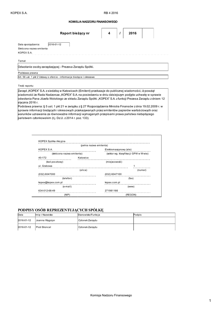 KOPEX S.A. RB 4 2016 KOMISJA NADZORU FINANSOWEGO Raport bieżący nr 4 / 2016 2016-01-12 Data sporządzenia: Skróc ona nazwa emitenta KOPEX S.A. Temat Odwołanie osoby zarządzającej - Prezesa Zarządu Spółki. Podstawa prawna Art. 56 ust. 1 pkt 2 Ustawy o oferc ie - informac je bieżąc e i okresowe Treść raportu: Zarząd „KOPEX” S.A. z siedzibą w Katowicach (Emitent) przekazuje do publicznej wiadomości, iż powziął wiadomość że Rada Nadzorcza „KOPEX” S.A. na posiedzeniu w dniu dzisiejszym podjęła uchwałę w sprawie odwołania Pana Józefa Wolskiego ze składu Zarządu Spółki „KOPEX” S.A. z funkcji Prezesa Zarządu z dniem 12 stycznia 2016 r. Podstawa prawna: § 5 ust. 1 pkt 21 w związku z § 27 Rozporządzenia Ministra Finansów z dnia 19.02.2009 r. w sprawie informacji bieżących i okresowych przekazywanych przez emitentów papierów wartościowych oraz warunków uznawania za równoważne informacji wymaganych przepisami prawa państwa niebędącego państwem członkowskim (t.j. Dz.U. z 2014 r. poz. 133). KOPEX Spółka Akc yjna (pełna nazwa emitenta) Elektromaszynowy (ele) KOPEX S.A. (skróc ona nazwa emitenta) 40-172 (sektor wg. klasyfikac ji GPW w W-wie) Katowice (kod poc ztowy) (miejscowość) ul. Grabowa 1 (ulica) (numer) (032) 6047000 (032) 6047100 (telefon) (fax) [email protected] kopex.com.pl (e-mail) (www) 634-012-68-49 271981166 (NIP) (REGON) PODPISY OSÓB REPREZENTUJĄCYCH SPÓŁKĘ Data Imię i Nazwisko Stanowisko/Funkc ja 2016-01-12 Joanna Węgrzyn Członek Zarządu 2016-01-12 Piotr Broncel Członek Zarządu Podpis Komisja Nadzoru Finansowego 1