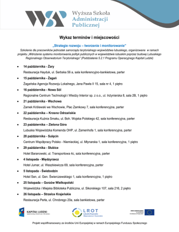 Wykaz terminów i miejscowości „Strategie rozwoju – tworzenie i monitorowanie” Szkolenie dla pracowników jednostek samorządu terytorialnego województwa lubuskiego, organizowane w ramach projektu „Wdrożenie systemu monitorowania polityk publicznych w województwie lubuskim poprzez budowę Lubuskiego Regionalnego Obserwatorium Terytorialnego” (Poddziałanie 5.2.1 Programu Operacyjnego Kapitał Ludzki) 14 października - Żary Restauracja Hayduk, ul. Serbska 56 a, sala konferencyjno-bankietowa, parter 15 października - Żagań Żagańska Agencja Rozwoju Lokalnego, Jana Pawła II 15, sala nr 4, 1 piętro 16 października - Nowa Sól Regionalne Centrum Technologii i Wiedzy Interior sp. z o.o., ul. Inżynierska 8, sala 2B, 1 piętro 21 października - Wschowa Zamek Królewski we Wschowie, Plac Zamkowy 7, sala konferencyjna, parter 22 października – Krosno Odrzańskie Restauracja Kuźnia Smaku, ul. Boh. Wojska Polskiego 42, sala konferencyjna, parter 23 października – Zielona Góra Lubuska Wojewódzka Komenda OHP, ul. Zamenhofa 1, sala konferencyjna, parter 28 października - Sulęcin Centrum Współpracy Polsko - Niemieckiej, ul. Młynarska 1, sala konferencyjna, 1 piętro 29 października - Słubice Hotel Baranowski, ul. Transportowa 4c, sala konferencyjna, parter 4 listopada - Międzyrzecz Hotel Jumar, ul. Waszkiewicza 69, sala konferencyjna, parter 5 listopada - Świebodzin Hotel Sen, ul. Gen. Świerczewskiego 1, sala konferencyjna, 1 piętro 25 listopada – Gorzów Wielkopolski Wojewódzka i Miejska Biblioteka Publiczna, ul. Sikorskiego 107, sala 216, 2 piętro 26 listopada – Strzelce Krajeńskie Restauracja Perła, ul. Chrobrego 20a, sala bankietowa, parter Projekt współfinansowany ze środków Unii Europejskiej w ramach Europejskiego Funduszu Społecznego
