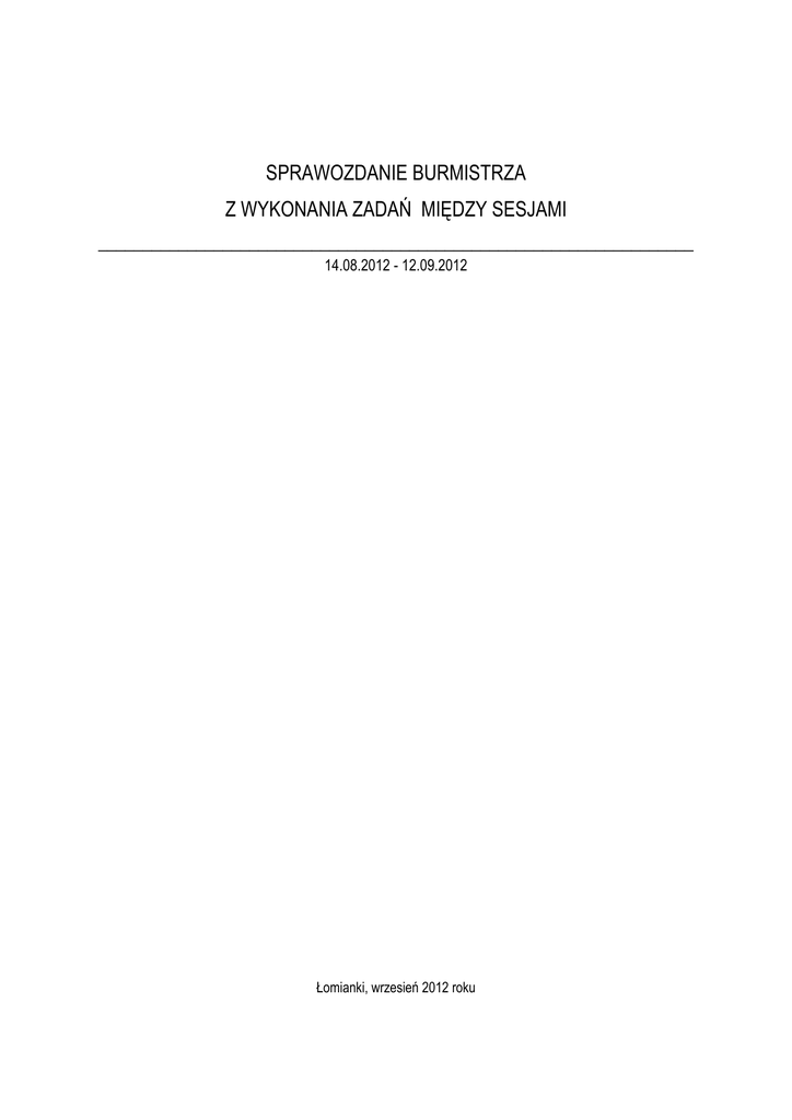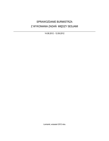 SPRAWOZDANIE BURMISTRZA Z WYKONANIA ZADAŃ MIĘDZY SESJAMI ___________________________________________________________________ 14.08.2012 - 12.09.2012 Łomianki, wrzesień 2012 roku ADMINISTRACJA W okresie sprawozdawczym od 23.05.2012 r. do 12.06.2012 r. przyjęto 878 pism, które zostały zaewidencjonowane w „Systemie Elektronicznego Monitorowania Pracy- SEMP” oraz 540 pism w systemie tradycyjnym. Zestawienie wydanych decyzji, postanowień i zaświadczeń ilustruje poniższa tabela: CZYNNOŚĆ ADMINISTRACYJNA LICZBA SPRAW Referat Ewidencji Działalności Gospodarczej Liczba wydanych zezwoleń na sprzedaż napojów alkoholowych przeznaczonych do spożycia poza miejscem sprzedaży Liczba wydanych jednorazowych zezwoleń na sprzedaż napojów alkoholowych przeznaczonych do spożycia w miejscu sprzedaży Liczba wydanych decyzji o wygaśnięciu zezwoleń na sprzedaż napojów alkoholowych Udzielanie pisemnych informacji dotyczących działalności gospodarczej Liczba wniosków przekazanych drogą elektroniczną do CEIDG, w tym: - wpis - zmiana, - zmiana z zawieszeniem, - zmiana ze wznowieniem, - zmiana z zakończeniem - zakończenie - zawieszenie - wznowienie 3 1 1 3 209 33 93 12 7 19 7 17 21 Referat Geodezji i Gospodarki Nieruchomościami podziały nieruchomości - sprawy rozpoczęte postanowieniami 10 • podziały nieruchomości - sprawy zakończone decyzjami 6 • wydawanie informacji adresowych 20 • sprawy różne 7 • korespondencja związana z nabyciem gruntu pod drogami 5 • Zarząd nieruchomościami 2 • Do Starostwa Powiatu Warszawskiego Zachodniego Złożonych zostało 3 wniosków o dokonanie zmian w ewidencji gruntów. Do Sądu Rejonowego w Warszawie X Wydział Ksiąg Wieczystych złożonych zostało 5 wniosków o wpisanie na rzecz Gminy Łomianki prawa własności do gruntów. Nabycie działki drogowej położonej w Dziekanowie Polskim – dz.883/6 o pow. 0,0522 ha – darowizna od Parafii Rzymskokatolickiej w Dziekanowie Leśnym z siedzibą w Dziekanowie Polskim. Nabycie nieruchomości gruntowej położonej w Łomiankach pomiędzy ulicami Zawilca i Krokusa - dz. 305 o pow. 0,0605 ha i dz. 298/1, 298/2, 298/3, 298/4, 298/5 i 298/8 o łącznej pow. 0,1706 ha (obręb 201) stanowiące część ulicy Irysa - darowizna od MSZBDJ Łomianki Zachodnie. Umowa zamiany - Gmina na rzecz Państwa Lisieckich dz. nr 305, 303/7 o łącznej pow. 0,0713 ha oraz prawo użytkowania wieczystego działki dz. 243/8 o pow. 0,0018 ha (obręb 201) Państwo Lisieccy na rzecz Gminy Łomianki dz. nr 299/2 o pow. 0,0696 ha i dz. 299/3 i 217 o łącznej pow. 0,0113 ha. ___________________________________________________________________________ Strona 2 z 22 Nabycie działki drogowej 300/4 o pow. 0,0913 ha – przeznaczona na połączenie dwóch części ulicy Krokusa – darowizna od Państwa Jaczewskich i Państwa Lisieckich. Referat Gospodarki Przestrzennej Zawiadomienia o wszczęciu postępowania adm. Wypisy z planu zagospodarowania + studium Zaświadczenia o przeznaczeniu terenu w planie, który 31.12.2003 r. stracił ważność Postanowienia o zawieszeniu postępowania/podjęciu postępowania i prostujące błędy pisarskie lub oczywiste omyłki Decyzje o warunkach zabudowy, zmiany i przepisania Decyzje o ustaleniu lokalizacji celu publicznego Analizy urbanistyczne Projekty decyzji 11 11 11 13 18 3 12 18 Referat Ochrony Środowiska i Rolnictwa Decyzje - zezwolenia na usunięcie drzew i krzewów Decyzje o środowiskowych uwarunkowaniach Wpisy do rejestru działalności regulowanej w zakresie odbierania odpadów komunalnych od właścicieli nieruchomości Wniosek o udostępnienie informacji publicznej 16 2 postanowienia 2 obwieszczenia 1 wniosek 2 wpisy 1 Referat Spraw Obywatelskich Liczba osób zameldowanych na pobyt stały w mieście i gminie Łomianki Zameldowanie na pobyt stały Zameldowanie na pobyt czasowy ponad 3 m-ce Zameldowanie na pobyt czasowy cudzoziemców Przemeldowanie na pobyt stały w obrębie gminy Wymeldowanie z pobytu stałego Zawiadomienia o zmianie danych do WKU Poświadczenia o zameldowaniu na pobyt stały Przepracowane akty: urodzenia, małżeństwa i zgonu Informacje adresowe dla instytucji oraz organów ścigania Wprowadzenie korekt i sprostowań do bazy komputerowej Wydane dowody osobiste Wnioski o wydanie dowodu osobistego Wystąpiono o nadanie numeru ewidencyjnego PESEL Unieważnione dowody osobiste 22.897 61 66 26 10 52 15 94 66 98 1416 215 69 33 121 Urząd Stanu Cywilnego Akty zgonu Akty małżeństwa Akty urodzenia Decyzje administracyjne Wnioski o wydanie odpisów aktów stanu cywilnego 7 13 1 7 144 ___________________________________________________________________________ Strona 3 z 22 Wydane zaświadczenia: stwierdzające brak okoliczności wyłączających zawarcie małżeństwa • w formie wyznaniowej 7 Referat Podatków i Opłat Lokalnych Decyzje dotyczące zmian w podatku od nieruchomości Decyzje dotyczące zmian w łącznym zobowiązaniu pieniężnym Decyzje dotyczące zmian w podatku rolnym Decyzje w sprawie ulg podatkowych Decyzje zwrot opłaty skarbowej Decyzje zwrot nadpłaty - osoby fizyczne Zawiadomienia osób fizycznych Postanowienia dotyczące podatku rolnego Postanowienia dotyczące zmian w łącznym zobowiązaniu pieniężnym Postanowienia dotyczące zmian w podatku od nieruchomości Postanowienie o rozksięgowaniu wpłat Zaświadczenia potwierdzające wymiar podatku oraz o nie zaleganiu w podatkach Wezwania do złożenia informacji w sprawie podatku od nieruchomości, rolnego, leśnego - osoby fizyczne Wezwania do złożenia deklaracji w sprawie podatku od nieruchomości - osoby prawne Korespondencja podatkowa oraz z Urzędem Skarbowym Upomnienia osoby fizyczne – podatek od nieruchomości Tytuły wykonawcze : Podatek od nieruchomości • Noty przeksięgowujące: osoby fizyczne • osoby prawne, środki transportu • Wpłaty bankowe i kasowe : osoby fizyczne • osoby prawne • środki transportu • Deklaracje w sprawie podatku od nieruchom