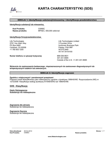 KARTA CHARAKTERYSTYKI (SDS) ________________________________________________________________________________________________________________ SEKCJA 1: Identyfikacja substancji/mieszaniny i identyfikacja przedsiebiorstwa Identyfikacja substancji lub mieszaniny Kod Produktu Nazwa produktu C0085C MPAEC, 500,000 cells/vial Identyfikacja firmy/przedsiebiorstwa Life Technologies 5791 Van Allen Way PO Box 6482 Carlsbad, CA 92008 +1 760 603 7200 Life Technologies Limited 3 Fountain Drive Inchinnan Business Park Paisley, PA4 9RF SCOTLAND 44-141 814-6100 Numer telefonu w sytuacji krytycznej 866-536-0631 301-431-8585 Outside of the U.S. +1-301-431-8585 Wylacznie do zastosowania badawczego. nieprzeznaczonych do zastosowan diagnostycznych lub terapeutycznych ludzkich lub zwierzecych. SEKCJA 2: Identyfikacja zagrozen Zgodnie z miejscowymi i panstwowymi przepisami Preparat zostal sklasyfikowany jako niebezpieczny zgodnie z dyrektywa 1999/45/WE Rozporzadzenie (WE) nr 1272/2008 Klasyfikacja wedlug dyrektywy 67/548//EWG lub 1999/45/WE GHS - Klasyfikacja Haslo Ostrzegawcze Substancja nie niebezpieczna Zagrozenia dla zdrowia Substancja nie niebezpieczna Zagrozenia fizyczne Substancja nie niebezpieczna ________________________________________________________________________________________________________________ Data aktualizacji Kod Produktu 29-Oct-2012 C0085C Strona 1 / 7 Nazwa produktu www.lifetechnologies.com zwroty wskazujace na srodki ostroznosci P262 - Nie wprowadzac do oczu, na skóre lub na odziez P264 - Umyc dokladnie rece po pracy z substancja Unia Europejska Zwroty wskazujace na szczególne zagrozenia UE Zwroty S S26 - Zanieczyszczone oczy przemyc natychmiast duza iloscia wody I zasiegnac porady lekarza S36/37 - Nosic odpowiednia odziez ochronna i odpowiednie rekawice ochronne Potencjalne skutki zdrowotne OCZY skóra wdychanie SPOZYCIE Dzialania szczególne Dzialania rakotwórcze DZIALANIA MUTAGENNE Toksycznosc rozrodcza Uczulenie Moze dzialac drazniaco na oczy u osób wrazliwych. Skladniki wyrobu moga byc wchlaniane do organizmu przez skóre. Moze dzialac drazniaco na skóre u osób wrazliwych. Moze dzialac drazniaco na drogi oddechowe. SUBSTANCJA MOZE BYC SZKODLIWA W PRZYPADKU SPOZYCIA. Nie dotyczy Nie dotyczy Nie dotyczy Nie dotyczy SEKCJA 3: Sklad/informacja o skladnikach Nazwa chemiczna dimethylsulfoxide Ammonium meta-Vanadate Tin compounds, inorganic Sodium Selenite Nr CAS 67-68-5 7803-55-6 7772-99-8 10102-18-8 Nr EINECS 200-664-3 - Procent wagowy 7-13 <0.01 <0.01 <0.00011 Contact with acids or bleach liberates toxic gases. DO NOT ADD acids or bleach to any liquid wastes containing this product. Zalecamy obslugi wszystkich chemikaliów z ostroznoscia. SEKCJA 4: Srodki pierwszej pomocy Kontakt ze skóra Kontakt z oczyma SPOZYCIE wdychanie Uwagi dla lekarza Natychmiast zmyc duza iloscia wody. Jesli objawy nie ustepuja, wezwac lekarza. Bezzwlocznie przeplukiwac duza iloscia wody przez co najmniej 15 minut, takze pod powiekami. W razie koniecznosci skonsultowac sie z lekarzem. Nigdy nie podawac niczego doustnie osobie nieprzytomnej. Jesli objawy nie ustepuja, wezwac lekarza. Nie wywolywac wymiotów bez uprzedniego zasiegniecia porady medycznej. Usunac na swieze powietrze. Jesli objawy nie ustepuja, wezwac lekarza. W przypadku braku oddychania zastosowac sztuczne oddychanie. Leczyc objawowo. SEKCJA 5: Postepowanie w przypadku pozaru ________________________________________________________________________________________________________________ Data aktualizacji Kod Produktu 29-Oct-2012 C0085C Strona 2 / 7 Nazwa produktu MPAEC, 500,000 cells/vial www.lifetechnologies.com Rozpylona woda. Dwutlenek wegla (CO2). Piana. Sucha substancja chemiczna. Stosowac niezalezny aparat oddechowy oraz odziez ochronna. Odpowiednie srodki gasnicze Specjalne wyposazenie ochronne dla strazaków SEKCJA 6: Postepowanie w przypadku niezamierzonego uwolnienia do srodowiska Indywidualne srodki ostroznosci Stosowac wyposazenie ochrony indywidualnej. Absorbowac obojetnym materialem absorbujacym. Metody usuwania Srodki ostroznosci w zakresie ochrony srodowiska O ile jest to bezpieczne, nalezy zapobiec dalszemu uwalnianiu lub wyciekaniu. Patrz: sekcja 12 po dalsze informacje. SEKCJA 7: Postepowanie z substancjami i mieszaninami oraz ich magazynowanie Unikac kontaktu ze skóra, oczami i ubraniem. Przechowywac w odpowiednio oznakowanych pojemnikach. Postepowanie Przechowywanie SEKCJA 8: Kontrola narazenia/srodki ochrony indywidualnej Wartosci graniczne narazenia Nazwa chemiczna dimethylsulfoxide 67-68-5 Ammonium meta-Vanadate 7803-55-6 Tin compounds, inorganic 7772-99-8 Sodium Selenite 10102-18-8 EU OEL (TWA) Zaden(-a,-e) EU OEL (STEL) Zaden(-a,-e) EU Skin Notation Zaden(-a,-e) Zaden(-a,-e) Zaden(-a,-e) Zaden(-a,-e) Zaden(-a,-e) Zaden(-a,-e) Zaden(-a,-e) Zaden(-a,-e) Zaden(-a,-e) Zaden(-a,-e) Nazwa chemiczna dimethylsulfoxide 67-68-5 Ammonium meta-Vanadate 7803-55-6 Tin compounds, inorganic 7772-99-8 Sodium Selenite 10102-18-8 Austria 50 ppm 160 mg/m3 Belgium (TWA) Zaden(-a,-e) Denmark (TWA) 50 ppm 160 mg/m3 Finland OEL (TWA) Zaden(-a,-e) Zaden(-a,-e) Zaden(-a,-e) Zaden(-a,-e) Zaden(-a,-e) 2 mg/m3 2 mg/m3 2 mg/m3 Zaden(-a,-e) Zaden(-a,-e) Zaden(-a,-e) Zaden(-a,-e) Zaden(-a,-e) Nazwa chemiczna dimethylsulfoxide 67-68-5 Ammonium meta-Vanadate 7803-55-6 Tin compounds, inorganic 7772-99-8 Sodium Selenite 10102-18-8 France OEL (VME) Zaden(-a,-e) Germany OEL (TWA) Zaden(-a,-e) Ireland (TWA) Zaden(-a,-e) Italy OEL (TWA) Zaden(-a,-e) Zaden(-a,-e) Zaden(-a,-e) Zaden(-a,-e) Zaden(-a,-e) Zaden(-a,-e) Zaden(-a,-e) 2 mg/m3 Zaden(-a,-e) Zaden(-a,-e) Zaden(-a,-e) Zaden(-a,-e) Zaden(-a,-e) ________________________________________________________________________________________________________________ Data aktualizacji Kod Produktu 29-Oct-2012 C0085C Strona 3 / 7 Nazwa produktu MPAEC, 500,000 cells/vial www.lifetechnologies.com Nazwa chemiczna Sweden - Occupational Netherlands OEL (MAC) Exposure Limits - TLVs (LLVs) 50 ppm LLV; 150 mg/m3 LLV Z