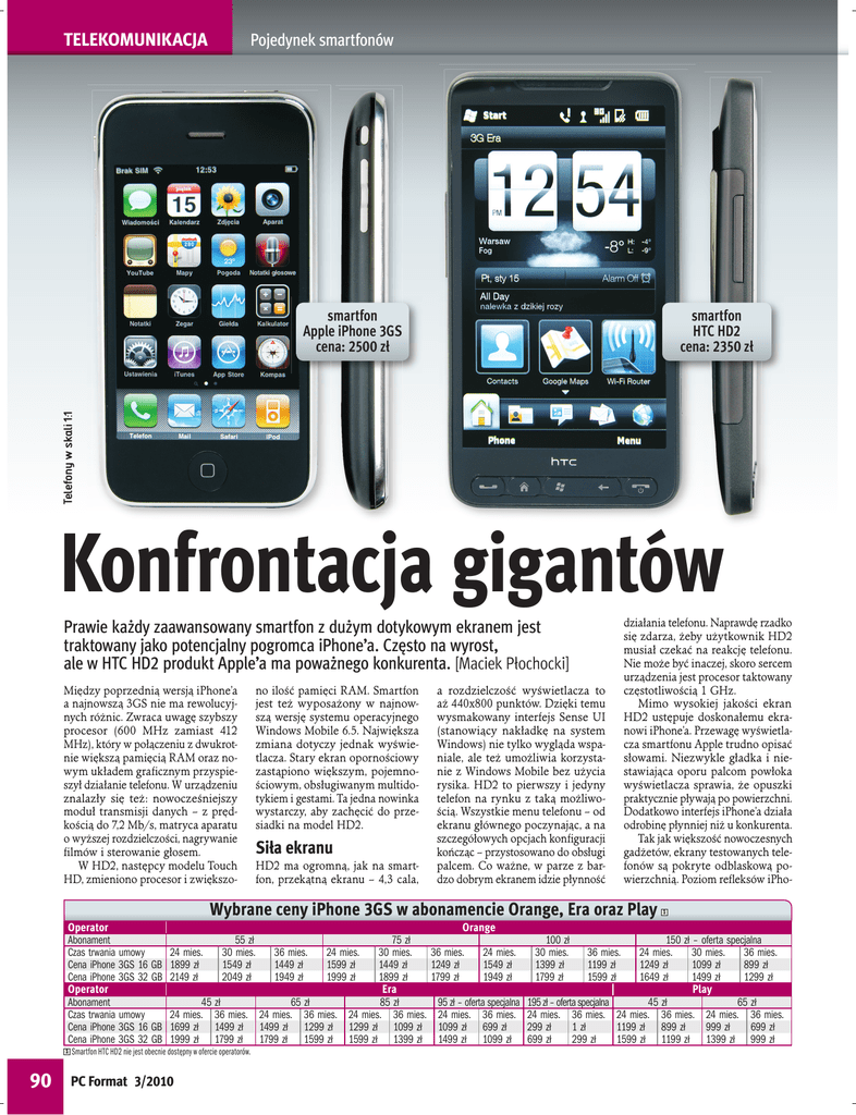 TELEKOMUNIKACJA Pojedynek smartfonów smartfon HTC HD2 cena: 2350 zł Telefony w skali 1:1 smartfon Apple iPhone 3GS cena: 2500 zł Konfrontacja gigantów Prawie każdy zaawansowany smartfon z dużym dotykowym ekranem jest traktowany jako potencjalny pogromca iPhone’a. Często na wyrost, ale w HTC HD2 produkt Apple’a ma poważnego konkurenta. [Maciek Płochocki] Między poprzednią wersją iPhone’a a najnowszą 3GS nie ma rewolucyjnych różnic. Zwraca uwagę szybszy procesor (600 MHz zamiast 412 MHz), który w połączeniu z dwukrotnie większą pamięcią RAM oraz nowym układem graficznym przyspieszył działanie telefonu. W urządzeniu znalazły się też: nowocześniejszy moduł transmisji danych – z prędkością do 7,2 Mb/s, matryca aparatu o wyższej rozdzielczości, nagrywanie fi lmów i sterowanie głosem. W HD2, następcy modelu Touch HD, zmieniono procesor i zwiększo- Operator Abonament Czas trwania umowy Cena iPhone 3GS 16 GB Cena iPhone 3GS 32 GB Operator Abonament Czas trwania umowy Cena iPhone 3GS 16 GB Cena iPhone 3GS 32 GB 1 90 no ilość pamięci RAM. Smartfon jest też wyposażony w najnowszą wersję systemu operacyjnego Windows Mobile 6.5. Największa zmiana dotyczy jednak wyświetlacza. Stary ekran opornościowy zastąpiono większym, pojemnościowym, obsługiwanym multidotykiem i gestami. Ta jedna nowinka wystarczy, aby zachęcić do przesiadki na model HD2. Siła ekranu HD2 ma ogromną, jak na smartfon, przekątną ekranu – 4,3 cala, a rozdzielczość wyświetlacza to aż 440x800 punktów. Dzięki temu wysmakowany interfejs Sense UI (stanowiący nakładkę na system Windows) nie tylko wygląda wspaniale, ale też umożliwia korzystanie z Windows Mobile bez użycia rysika. HD2 to pierwszy i jedyny telefon na rynku z taką możliwością. Wszystkie menu telefonu – od ekranu głównego poczynając, a na szczegółowych opcjach konfiguracji kończąc – przystosowano do obsługi palcem. Co ważne, w parze z bardzo dobrym ekranem idzie płynność działania telefonu. Naprawdę rzadko się zdarza, żeby użytkownik HD2 musiał czekać na reakcję telefonu. Nie może być inaczej, skoro sercem urządzenia jest procesor taktowany częstotliwością 1 GHz. Mimo wysokiej jakości ekran HD2 ustępuje doskonałemu ekranowi iPhone’a. Przewagę wyświetlacza smartfonu Apple trudno opisać słowami. Niezwykle gładka i niestawiająca oporu palcom powłoka wyświetlacza sprawia, że opuszki praktycznie pływają po powierzchni. Dodatkowo interfejs iPhone’a działa odrobinę płynniej niż u konkurenta. Tak jak większość nowoczesnych gadżetów, ekrany testowanych telefonów są pokryte odblaskową powierzchnią. Poziom refleksów iPho- Wybrane ceny iPhone 3GS w abonamencie Orange, Era oraz Play 55 zł 30 mies. 1549 zł 2049 zł 75 zł 24 mies. 36 mies. 24 mies. 30 mies. 1899 zł 1449 zł 1599 zł 1449 zł 2149 zł 1949 zł 1999 zł 1899 zł Era 45 zł 65 zł 85 zł 24 mies. 36 mies. 24 mies. 36 mies. 24 mies. 36 mies. 1699 zł 1499 zł 1499 zł 1299 zł 1299 zł 1099 zł 1999 zł 1799 zł 1799 zł 1599 zł 1599 zł 1399 zł Smartfon HTC HD2 nie jest obecnie dostępny w ofercie operatorów. PC Format 3/2010 Orange 150 zł – oferta specjalna 24 mies. 30 mies. 36 mies. 1249 zł 1099 zł 899 zł 1649 zł 1499 zł 1299 zł Play 95 zł – oferta specjalna 195 zł – oferta specjalna 45 zł 65 zł 24 mies. 36 mies. 24 mies. 36 mies. 24 mies. 36 mies. 24 mies. 36 mies. 1099 zł 699 zł 299 zł 1 zł 1199 zł 899 zł 999 zł 699 zł 1499 zł 1099 zł 699 zł 299 zł 1599 zł 1199 zł 1399 zł 999 zł 36 mies. 1249 zł 1799 zł 24 mies. 1549 zł 1949 zł 100 zł 30 mies. 1399 zł 1799 zł 1 36 mies. 1199 zł 1599 zł Pojedynek smartfonów ne’a można jeszcze zaakceptować, ale już wyłączony ekran HD2 wygląda jak lustro, w którym można się przeglądać. Z tego samego powodu na ekranie HTC bardziej widoczne są wszelkie zabrudzenia. Obudowa i przyciski Ogromny ekran HTC powoduje, że i wymiary całego telefonu są spore (większe niż niemałego przecież iPhone’a). HD2 jest też cięższy od konkurenta, ponieważ jego obudowę wykonano z aluminium (matowego!) – materiału z pewnością trwalszego niż plastik iPhone’a. Kiepskim rozwiązniem jest wystający z obudowy telefonu obiektyw aparatu fotograficznego. Krawędzie obiektywu są twarde i ostre, zdolne porysować miękkie powierzchnie, np. blat sosnowego biurka. Telefon położony płasko kiwa się na boki. W obudowie HTC znalazły się przyciski regulacji głośności i wyjście słuchawkowe. Jest też panel 5 przycisków pod ekranem. Pozwala on odbierać i wykonywać połączenia. Zawiera też klawisz Windows, Cofnij oraz Home, który wywołuje menu główne smartfonu. Niestety w modelu przysłanym do redakcji panel poruszał się pod wpływem nawet lekkiego dotyku – nie takiej jakości wykonania należy oczekiwać od smartfonu w tej cenie. Cała obudowa iPhone’a jest błyszcząca – łatwo się brudzi, a tylną część można zarysować. Oprócz przycisku regulacji głośności dostępny jest także przycisk wyłączający dźwięk oraz klawisz wyłączający ekran. Tam, gdzie HTC ma aż 5 klawiszy, na panelu przednim produktu Apple’a znajduje się tylko jeden przycisk. Po pojedynczym jego wciśnięciu wyświetla się menu główne. Podwójne wciśnięcie można dowolnie zaprogramować, a dłuższe przytrzymanie uruchamia funkcję sterowania głosem. Interfejs Urządzenia prezentują dwa różne podejścia do projektowania interfejsu użytkownika, ale wygląd obydwu zadowoli najbardziej wybrednych. Prostsze menu ma iPhone – główną część ekranu zajmują tu skróty do aplikacji w postaci ładnych ikon (niestety nie można umieścić kontaktów jako ikon). Można je gromadzić na kilku pulpitach. U dołu ekranu znajduje się konfigurowalny panel z czterema ikonami najczęściej używanych funkcji. W HD2 główne menu jest bardziej skomplikowane. Każda z głównych funkcji telefon