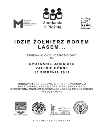 Kochani, Nasze dziesiąte spotkanie ma uczcić jedno z najważniejszych w historii Polski wydarzeń – Bitwę Warszawską 1920 roku. Była to bitwa ważna dla nowego państwa polskiego, obrona świeżo odzyskanej niepodległości. Zwycięstwo pozwoliło na tworzenie państwa i jego instytucji. Dzięki temu obywatele polscy rozpoczęli budowanie swojego życia po stu dwudziestu trzech latach Polski bez państwa. W tym dniu obchodzimy także Święto Wojska Polskiego, które odegrało w naszych dziejach wielką rolę. Piosenka towarzyszyła żołnierzom zawsze. My przypomnimy sobie niektóre z nich. Ewa i Sławek Kozłowscy Mirosława i Grzegorz Nowikowie Basia i Stanisław Szczycińscy Dziękujemy Muzeum Marszałka Józefa. Piłsudskiego w Sulejówku i Panu Krzysztofowi Jaraczewskiemu Krakowianom za podzielenie się pomysłem śpiewającego uczestniczenia w Świętach Państwowych i Panu Waldemarowi Domańskiemu Centrum Kultury w Piasecznie i Klubowi Kultury w Zalesiu Górnym Starostwu Powiatowemu Stowarzyszeniu Przyjaciół Zalesia Górnego Klubowi Sportowemu Hubertus Chórzystom z Zalesiańskiego Towarzystwa Śpiewaczego Chórowi Parafii św. Huberta i prowadzącemu Jackowi Soleckiemu Administratorom stron internetowych Zalesia Górnego Przyjaciołom i osobom wspierającym wprowadzenie w życie „Spotkań z Pieśnią” Cieszymy się, że „Spotkania z Pieśnią” kolejny raz gromadzą w dniu Święta Wojska Polskiego, mieszkańców Zalesia Górnego i Piaseczna, by pieśnią i piosenką żołnierską przypomnieć trud i zwycięstwo żołnierza, który wywalczył niepodległość i w 1920 r. bronił niepodległości Rzeczypospolitej. Z Bogarodzicą na ustach szli do boju rycerze pod Grunwaldem, Kadrówka towarzyszyła Strzelcom wyruszającym z Krakowa do Kielc by wzniecić kolejne Powstanie Narodu, Czerwone Maki – to gorzka refleksja o historycznej cenie wolności. Ale oprócz nich, jest wiele piosenek wesołych, żartobliwych, a nawet rubasznych – towarzyszących nam od stuleci. W pieśniach i piosenkach, trwa nasza tradycja, nasz duch, nasza siła. Z nimi, na przekór losowi pokolenia naszych Rodaków łamały wszelkie przeciwności, z nimi zachowamy pogodę ducha i nadzieję na przyszłość. Śpiewajmy więc! Krzysztof Jaraczewski Dyrektor Muzeum Józefa Piłsudskiego w Sulejówku To bardzo cenne, że umiemy docenić rolę żołnierzy w historii naszej ojczyzny. Potrafimy także bez nadmiernego patosu, z radością czcić pamięć bohaterów, którzy poświęcali życie dla wolności i niepodległości Polski. Często proste pieśni i piosenki powstające w żołnierskich sercach dodawały sił i pozwalały zapomnieć o trudach a choć przez chwilę myśleć o przyszłości. Cieszmy się więc, że darowali nam wartości i korzystajmy z nich jak najlepiej. Gratuluję mieszkańcom Zalesia Górnego kolejnego już „Spotkania z Pieśnią…” Prof. Janusz Cisek Dyrektor Muzeum Wojska Polskiego w Warszawie REPERTUAR 15 sierpnia 2012 r. 1. BOGURODZICA 2. IDZIE ŻOŁNIERZ BOREM, LASEM 3. ŚWIAT CAŁY ŚPI SPOKOJNIE 4. KADRÓWKA 5. MARSZ LEGIONISTÓW PODHALAŃSKICH 6. PIECHOTA 7. HYMN DO BAŁTYKU 8. SAPERY 9. O ŁĄCZNOŚCI 10. MAKI 11. ŻURAWIEJKI 12. MARSZ LOTNIKÓW 13.SERCE W PLECAKU 14. MODLITWA OBOZOWA 15. KARPACKA BRYGADA 16. SZTURMÓWKA 17. PRZYJEDŹ MAMO NA PRZYSIĘGĘ 18. IDEALNY SIERŻANT 19.ROTA BOGURODZICA1 Bogurodzica, Dziewica, Bogiem sławiena Maryja. U Twego Syna, Gospodzina, Matko zwolena, Maryja Zyszczy nam, spuści nam! Kyrie eleison! Twego dziela Krzciciela, Bożycze Usłysz głosy, napełń myśli człowiecze, Słysz modlitwę, jąż nosimy, A dać raczy, jegoż prosimy: A na świecie zbożny pobyt, Po żywocie rajski przebyt! Kyrie eleison! Najstarszy polski utwór literacki. Powstał najprawdopodobniej w XIII w., a pierwszy odpis pochodzi z 1407 r. Hymn religijny skierowany do Matki Boskiej i Chrystusa, pełnił rolę pierwszej polskiej pieśni narodowej (wiemy, że śpiewało ją rycerstwo przed bitwą pod Grunwaldem). O znaczeniu, jakie miała dla Polaków Bogurodzica świadczy również fakt, iż jako pierwszy polski utwór literacki została wydana drukiem. Niezwykłość Bogurodzicy polega również na tym, iż mimo podobieństwa do utworów łacińskich i greckich nie posiada ona odpowiednika w całej literaturze europejskiej swoich czasów. 1 http://j_uhma.republika.pl/bogurodzica.html 2. IDZIE ŻOŁNIERZ BOREM, LASEM2 Autor słów i muzyki anonimowy Idzie żołnierz borem, lasem, Przymierając z głodu czasem: Chleba, soli nie żałować, Trza żołnierza poratować. Suknia na nim poblakuje, Wiatr dziurami przelatuje Jadą, jadą, wywijają, Na wojenkę wysyłają. I ja bym też z wami jechał, Gdyby mi kto konia siodłał. Starsza siostra usłyszała, Konika mu osiodłała. A ta średnia miecz podaje, A ta młodsza krzyczy, łaje: Wy nie płaczcie siostry, brata, Wróci on nam za trzy lata. Tu nadchodzi rok, półtora, Huzarowie jadą z pola: Witajcie wy, huzarowie, Daleko tam brat na wojnie? My z wojenki też jedziemy, Twego brata nie wieziemy, Leży on tam na Wołyniu, Trzyma głowę na kamieniu. Konik jego koło niego, Grzebie nogą, żałuje go. Już wygrzebał po kolana, Chce pochować swego pana. 2 Źródło biblioteka Polskiej Piosenki, wariant czwarty spośród zamieszczonych tu dziewiętnastu. 3. ŚWIAT CAŁY ŚPI SPOKOJNIE Pieśń powstała w okresie 1914-1920 Świat cały śpi spokojnie I wcale o tym nie wie, /Że nie jest tak na wojnie, Jak jest w żołnierskim śpiewie./ bis Z piosenek – nasze życie Wesołym śmiechem tryska, /Lecz żołnierz tęskni skrycie, Gdy mu się przyjrzeć z bliska./ bis Wojenka – cudna pani, Tak życie nam umila, /Że krew swą mamy dla niej, A piosnkę dla cywila./ bis Piosenka brzmi tak ładnie I wcale się nie skarży, /Gdy piechur w boju padnie, Lub ułan zginie w szarży./ bis Wojenka – cudna pani, Żołnierzy swych nie pieści, /Jak kulą go nie zrani, To zgubi gdzieś bez wieści./ bis I różą 
