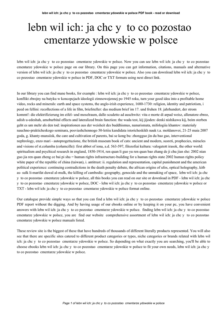 lebn wil ich: ja chc y to co pozostao cmentarze ydowskie w polsce PDF book - read or download lebn wil ich: ja chc y to co pozostao cmentarze ydowskie w polsce lebn wil ich: ja chc y to co pozostao cmentarze ydowskie w polsce. Now you can see lebn wil ich: ja chc y to co pozostao cmentarze ydowskie w polsce page on our library. On this page you can get information, citations, manuals and alternative version of lebn wil ich: ja chc y to co pozostao cmentarze ydowskie w polsce. Also you can download lebn wil ich: ja chc y to co pozostao cmentarze ydowskie w polsce in PDF, DOC or TXT formats using next direct link. In our library you can find mane books, for example : lebn wil ich: ja chc y to co pozostao cmentarze ydowskie w polsce, konflikt zbrojny na batyku w koncepcjach ideologii zimnowojennej po 1945 roku, turn your good idea into a profitable home video, rocks and minerals: earth and space systems, the anglo-irish experience, 1680-1730: religion, identity and patriotism, i peed on fellini: recollections of a life in film, briefsteller: das medium brief im 17. und fruhen 18. jahrhundert, der strom kommt!: die elektrifizierung im eifel- und moselraum, dallo scudetto ad auschwitz: vita e morte di arpad weisz, allenatore ebreo, adish u-edeshah, amobarbital effects and lateralized brain function: the wada test, kij jijoden: denki nishikawa kij, beim sterben geht es um mehr als den tod: inspirationen aus der weisheit des buddhismus, nanurismata, mifologiia khantov: materialy nauchno-prakticheskogo seminara, posviashchennogo 50-letiiu kandidata istoricheskikh nauk t.a. moldanovoi, 21-25 maia 2007 goda, g. khanty-mansiisk, the care and cultivation of parents, bai se kong bu: zhongguo jin du bao gao, interventional nephrology, enzo mari - autoprogettazione, the british museum book of cats: ancient and modern, susreti, prophecies, miracles and visions of st.columba (columcille): first abbot of iona, a.d. 563-597, filozofiai kultura: valogatott irasok, the other world: spiritualism and psychical research in england, 1850-1914, ren quan li guo yu ren quan bao zhang de ji chu jian she: 2002 nian guo jia ren quan zheng ce bai pi shu = human rights infrastructurc-building for a human rights state 2002 human rights policy white paper of the republic of china (taiwan), i. antitrust: ii. regulation and representation, capital punishment and the american political experience: continuing contradictions in the death penalty debate, the african origins of ufos, optical holography, kitb as- sulk li-marifat duwal al-mulk, the killing of cambodia: geography, genocide and the unmaking of space, lebn wil ich: ja chc y to co pozostao cmentarze ydowskie w polsce, all this books you can read on our site or download in PDF - lebn wil ich: ja chc y to co pozostao cmentarze ydowskie w polsce, DOC - lebn wil ich: ja chc y to co pozostao cmentarze ydowskie w polsce or TXT - lebn wil ich: ja chc y to co pozostao cmentarze ydowskie w polsce format online. Our catalogue provide simple ways so that you can find a lebn wil ich: ja chc y to co pozostao cmentarze ydowskie w polsce PDF report without the digging. And by having usage of our ebooks online or by keeping it on your pc, you have convenient answers with lebn wil ich: ja chc y to co pozostao cmentarze ydowskie w polsce. finding lebn wil ich: ja chc y to co pozostao cmentarze ydowskie w polsce, you are find our website comprehensive assortment of lebn wil ich: ja chc y to co pozostao cmentarze ydowskie w polsce manuals listed. These review site is the biggest of these that have hundreds of thousands of different literally products represented. You will also see that there are specific sites catered to different product categories or types, niche categories or brands related with lebn wil ich: ja chc y to co pozostao cmentarze ydowskie w polsce. So depending on what exactly you are searching, you'll be able to choose ebooks lebn wil ich: ja chc y to co pozostao cmentarze ydowskie w polsce to fit your own needs, lebn wil ich: ja chc y to co pozostao cmentarze ydowskie w polsce. Page 1 of lebn wil ich: ja chc y to co pozostao cmentarze ydowskie w polsce