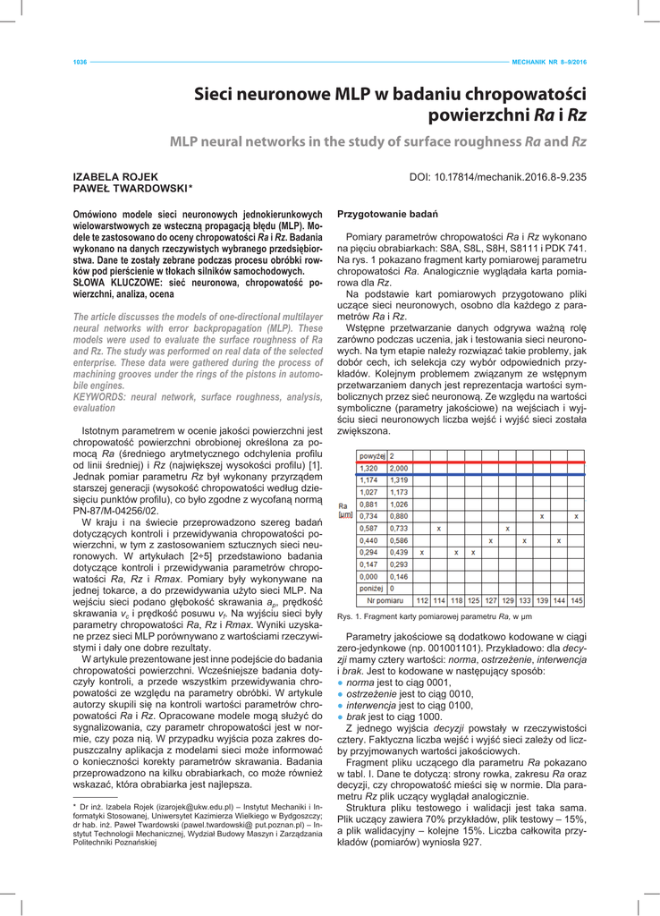 Sieci neuronowe MLP w badaniu chropowatości powierzchni Ra i Rz