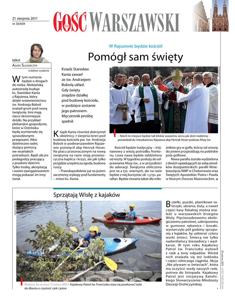 21 sierpnia 2011 nr 33/659 W Rajszewie będzie kościół Ksiadz Stanisław Kania zawarł ze św. Andrzejem Bobolą układ. Gdy święty znajdzie działkę pod budowę kościoła, w podzięce zostanie jego patronem. Męczennik prośbę spełnił. redaktor wydania W tym numerze będzie o drogach do nieba. Niebiańską autostradę buduje ks. Stanisław Kania z Rajszewa, który dzięki wstawiennictwu św. Andrzeja Boboli znalazł grunt pod nową świątynię. Inni mają nieco skromniejsze dróżki. Na przykład plebanijne gospodynie, które w Ostrówku będą wymieniały się sprawdzonymi przepisami. Albo dzielnicowi radni, służący pomocą we wszelakich potrzebach. Bądź uliczni pedagodzy pracujący z praskimi dziećmi. Tylko troską, akceptacją i swoim zaangażowaniem mogą pokazać im inny świat. Paweł Konowrocki Pomógł sam święty tekst Agata Ślusarczyk K siądz Kania również dotrzymał obietnicy. 7 sierpnia teren pod budowę kościoła pw. św. Andrzeja Boboli w podwarszawskim Rajszewie poświęcił abp Henryk Hoser. Na placu przeznaczonym na nową świątynię na razie stoją prowizoryczna kaplica i krzyż, ale jak tylko przyjdzie urzędnicza zgoda, budowa ruszy. – Prawdopodobnie już na jesieni zaczniemy wykopy pod fundamenty – mówi ks. Kania. – Niech to miejsce będzie tak bliskie waszemu sercu jak dom rodzinny – powiedział do mieszkańców Rajszewa abp Henryk Hoser podczas Mszy św. Kościół będzie tradycyjny – trójnawowy z wieżą pośrodku frontonu. Lewa nawa będzie oddzielona od reszty. W tygodniu posłuży do odprawiania Mszy św., a w przyszłości do adoracji. Świątynia obliczona jest na 4 tys. wiernych, ale na razie będzie z niej korzystać ok. 1,3 tys. parafian. Będzie otwarta także dla miło- Jakub Szymczuk Sprzątają Wisłę z kajaków B utelki, puszki, plastikowe talerzyki, ubrania, buty, a nawet części kasy fiskalnej można znaleźć u warszawskich brzegów Wisły. Pięcioosobowemu ekologicznemu patrolowi, uzbrojonemu w gumowe rękawice i bosaki, wystarczyło pół godziny sprzątania z kajaków, by uzbierać cztery worki śmieci. Śmiecą nie tylko nadwiślańscy biesiadnicy i wędkarze. W tym roku Kajakowy Patrol św. Franciszka wyłowił z rzek 4 tony odpadów. Wśród nich znalazła się też lodówka i części rolniczego ciągnika. Akcja „Nie pływam w śmieciach”, która ma oczyścić wody naszych rzek, potrwa do listopada. Kajakowy Patrol jest inicjatywą Katolickiego Stowarzyszenia Młodzieży Diecezji Drohiczyńskiej. • 21 sierpnia 2011 Gość Niedzielny Wybrzeże Szczecińskie, 11 sierpnia 2011 r. Kajakowy Patrol św. Franciszka stara się przekonać ludzi do dbania o czystość rzek i jezior śników gry w golfa, którzy od wiosny do jesieni przyjeżdżają na pobliskie pola golfowe. Nowa parafia została wydzielona z dwóch sąsiadujących ze sobą ośrodków duszpasterskich: parafii Wniebowzięcia NMP w Chotomowie oraz Świętych Apostołów Piotra i Pawła w Nowym Dworze Mazowieckim. aś gość warszawski gość warszawski Nie dostałeś się na studia? Nic straconego. Stołeczne uczelnie mają jeszcze wolne miejsca nawet na atrakcyjnych kierunkach W Szkole Głównej Handlowej pozostało ok. 350 miejsc na studiach wieczorowych i zaocznych. Szkoła Główna Gospodarstwa Wiejskiego oferuje 200 miejsc na kierunkach: budownictwo, informatyka, inżynieria środowiska, ogrodnictwo, leśnictwo. Do 5 września można zgłaszać się na wolne miejsca na Uniwersytecie Kardynała Stefana Wyszyńskiego. Na chętnych czekają m.in.: teologia, misjologia, turystyka krajów biblijnych, filozofia, ochrona środowiska, politologia, socjologia, historia, filologia polska, matematyka. jjw Będzie stary młyn, Pan Guma i dziura w płocie. Młodzi prażanie razem z pedagogami właśnie tworzą koncepcję spaceru, na który 3 września – w ramach festiwalu „Przemiany” – zaproszą warszawiaków. materiały prasowe Odlotowe lotnisko Nowoczesna kawiarnia to jedno z wielu udogodnień, jakie czekają na podróżnych stołecznego lotniska Targówek . 5 sierpnia spłonął dach kościoła Chrystusa Króla na Targówku. Teraz parafię czeka remont. – W pierwszej kolejności trzeba będzie rozebrać dach i położyć nowy. Później czeka nas malowanie – mówi wikary parafii ks. Dariusz Stefanowicz. Dokładne koszty remontu oszacują rzeczoznawcy. Tymczasem wierni sami przychodzą do kancelarii z datkami lub dzwonią z zapytaniem o numer konta. Chętni, którzy chcieliby pomóc w odbudowie spalonego kościoła – wotum za Cud nad Wisłą, mogą wpłacać ofiary na konto bankowe PKO BP nr 92 1020 1042 0000 8402 0010 6013 lub osobiście w kancelarii parafialnej, przy ul. Tykocińskiej 27/35, od poniedziałku do piątku od 10 do 12 i od 16 do 18. as Agata Ślusarczyk Podatki . Obywatelski projekt ustawy zmniejszającej janosikowe (podatku, który bogate gminy płacą na rzecz najuboższych) jest już w Sejmie. Na ręce marszałka Grzegorza Schetyny wraz ze 155 tys. podpisów poparcia złożyli go inicjatorzy akcji: prezydent Warszawy Hanna GronkiewiczWaltz i wicemarszałek Mazowsza Marcin Kierwiński. Marszałek Schetyna powiedział, że prawdopodobnie zajmą się nim posłowie nowej kadencji. Komitet Inicjatywy Ustawodawczej, który wyszedł z propozycją zmiany prawa, planuje przeprowadzenie kampanii wśród polityków, uświadamiając im, że stolica również potrzebuje dofinansowania. As Ofiara na nowy dach Krew może oddać dorosła zdrowa osoba do 65. roku życia Wak acyjne akcje . W wakacje jak zwykle stołecznym szpitalom brakuje krwi. Teraz największe niedobory dotyczą grup minusowych, tj. 0 Rh(-), A Rh(-), B Rh(-) i AB Rh(-). Regionalne Centrum Krwiolecznictwa i Krwiolecznictwa prosi mieszkańców Warszawy i województwa mazowieckiego o oddawanie krwi w siedzibie RCKiK (ul. Saska 53) w Warszawie oraz oddziałach terenowych lub ambulansach. 21 sierpnia ambulans do poboru krwi będzie dyżurował od 10 do 14 w Lipkowie, 24