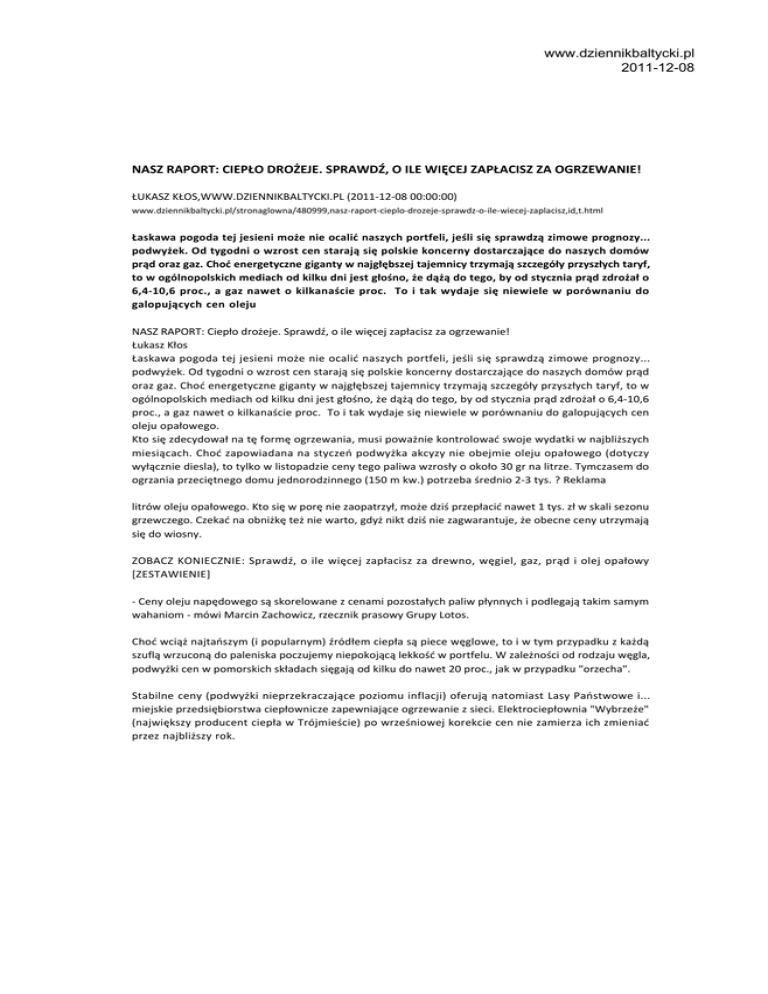 www.dziennikbaltycki.pl 2011-12-08 NASZ RAPORT: CIEPŁO DROŻEJE. SPRAWDŹ, O ILE WIĘCEJ ZAPŁACISZ ZA OGRZEWANIE! ŁUKASZ KŁOS,WWW.DZIENNIKBALTYCKI.PL (2011-12-08 00:00:00) www.dziennikbaltycki.pl/stronaglowna/480999,nasz-raport-cieplo-drozeje-sprawdz-o-ile-wiecej-zaplacisz,id,t.html Łaskawa pogoda tej jesieni może nie ocalić naszych portfeli, jeśli się sprawdzą zimowe prognozy... podwyżek. Od tygodni o wzrost cen starają się polskie koncerny dostarczające do naszych domów prąd oraz gaz. Choć energetyczne giganty w najgłębszej tajemnicy trzymają szczegóły przyszłych taryf, to w ogólnopolskich mediach od kilku dni jest głośno, że dążą do tego, by od stycznia prąd zdrożał o 6,4-10,6 proc., a gaz nawet o kilkanaście proc. To i tak wydaje się niewiele w porównaniu do galopujących cen oleju NASZ RAPORT: Ciepło drożeje. Sprawdź, o ile więcej zapłacisz za ogrzewanie! Łukasz Kłos Łaskawa pogoda tej jesieni może nie ocalić naszych portfeli, jeśli się sprawdzą zimowe prognozy... podwyżek. Od tygodni o wzrost cen starają się polskie koncerny dostarczające do naszych domów prąd oraz gaz. Choć energetyczne giganty w najgłębszej tajemnicy trzymają szczegóły przyszłych taryf, to w ogólnopolskich mediach od kilku dni jest głośno, że dążą do tego, by od stycznia prąd zdrożał o 6,4-10,6 proc., a gaz nawet o kilkanaście proc. To i tak wydaje się niewiele w porównaniu do galopujących cen oleju opałowego. Kto się zdecydował na tę formę ogrzewania, musi poważnie kontrolować swoje wydatki w najbliższych miesiącach. Choć zapowiadana na styczeń podwyżka akcyzy nie obejmie oleju opałowego (dotyczy wyłącznie diesla), to tylko w listopadzie ceny tego paliwa wzrosły o około 30 gr na litrze. Tymczasem do ogrzania przeciętnego domu jednorodzinnego (150 m kw.) potrzeba średnio 2-3 tys. ? Reklama litrów oleju opałowego. Kto się w porę nie zaopatrzył, może dziś przepłacić nawet 1 tys. zł w skali sezonu grzewczego. Czekać na obniżkę też nie warto, gdyż nikt dziś nie zagwarantuje, że obecne ceny utrzymają się do wiosny. ZOBACZ KONIECZNIE: Sprawdź, o ile więcej zapłacisz za drewno, węgiel, gaz, prąd i olej opałowy [ZESTAWIENIE] - Ceny oleju napędowego są skorelowane z cenami pozostałych paliw płynnych i podlegają takim samym wahaniom - mówi Marcin Zachowicz, rzecznik prasowy Grupy Lotos. Choć wciąż najtańszym (i popularnym) źródłem ciepła są piece węglowe, to i w tym przypadku z każdą szuflą wrzuconą do paleniska poczujemy niepokojącą lekkość w portfelu. W zależności od rodzaju węgla, podwyżki cen w pomorskich składach sięgają od kilku do nawet 20 proc., jak w przypadku "orzecha". Stabilne ceny (podwyżki nieprzekraczające poziomu inflacji) oferują natomiast Lasy Państwowe i... miejskie przedsiębiorstwa ciepłownicze zapewniające ogrzewanie z sieci. Elektrociepłownia "Wybrzeże" (największy producent ciepła w Trójmieście) po wrześniowej korekcie cen nie zamierza ich zmieniać przez najbliższy rok. www.dziennikbaltycki.pl 2011-12-08 Ciepło pochodzące z miejskich sieci ciepłowniczych wciąż jest relatywnie najtańszym i najwygodniejszym źródłem ogrzewania naszych mieszkań i domów. Jego cena, mimo podwyżek cen paliw i opału, utrzymuje się na w miarę stabilnym poziomie. ZOBACZ KONIECZNIE: PORADY: Jak płacić mniej za ogrzewanie? - Nasza taryfa została zatwierdzona przez Urząd Regulacji Energetyki na trzy lata i nie przewidujemy jej zmiany w tym sezonie grzewczym - mówi Arkadiusz Bruliński z Gdańskiego Przedsiębiorstwa Energetyki Cieplnej, które dostarcza ciepło do mieszkań w Gdańsku i Sopocie. - Ceny ciepła utrzymują się na stabilnym poziomie od 2010 roku i są waloryzowane o aktualną wysokość inflacji. Niezależna od nas jest natomiast cena produkcji ciepła, w większości kupowanego z Elektrociepłowni "Wybrzeże" - dodaje. 1 GJ w najpowszechniejszej taryfie kosztować będzie w tym sezonie około 67,13 zł brutto. W tę cenę wliczone są zarówno przesył, jak i produkcja ciepła. Podobnie sytuacja wygląda w Okręgowym Przedsiębiorstwie Energetyki Cieplnej w Gdyni. - W przypadku odbiorców, którym ciepło dostarczane jest do obiektów poprzez sieć ciepłowniczą, średnia stawka przesyłowa OPEC wynosi około 18,57 zł brutto za 1 GJ, natomiast średnia cena ciepła określana przez Elektrociepłownię "Wybrzeże" wynosi około 36,81 zł za 1 GJ brutto - podaje Iwona Kozłowska z gdyńskiego OPEC. ? Reklama Średnio łączne ceny ciepła z miejskiej sieci są wyższe od tych z ubiegłego roku o około 3-4 proc. i mieszczą się w granicy inflacji. Dla porównania - wzrost cen węgla rok do roku waha się w granicach 20 proc. Skręcasz grzejnik? Na zdrowie! Okazuje się, że niewielkie obniżenie temperatury w mieszkaniu czy domu wpływa zbawiennie nie tylko na portfel, ale też na zdrowie domowników. Aż 13 proc. mieszkańców Trójmiasta utrzymuje w swoich wnętrzach za wysoką temperaturę - wynika z badania OBOP, przeprowadzonego na zlecenie GPEC. Tymczasem zalecana temperatura w ciągu dnia wynosi około 20-21 st. C. W nocy z powodzeniem możemy przykręcić kaloryfery. Chłodniejsze wnętrze ułatwia organizmowi odpoczynek w trakcie snu. Przegrzewanie pomieszczeń (temperatura powyżej 24 st. C) sprzyja z kolei rozwijaniu się astmy oskrzelowej oraz infekcji, zwłaszcza u najmłodszych domowników - dzieci. Ponadto wysoka wilgotność (spowodowana np. suszeniem prania) przy braku wietrzenia tworzy doskonałe warunki do rozwoju grzybic. Przykręcenie kurków oraz nagrzewanie tylko tych pomieszczeń, w których przebywamy w ciągu dnia, może przynieść w sezonie oszczędności rzędu kilku, a nawet kilkunastu procent. Łukasz Kłos tel. 58 30 03 334 www.dziennikbaltycki.pl 2011-12-08 [email protected] strona: 1 z 2 »