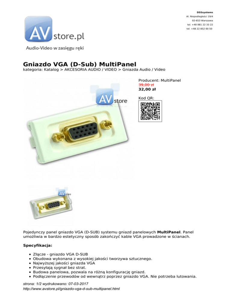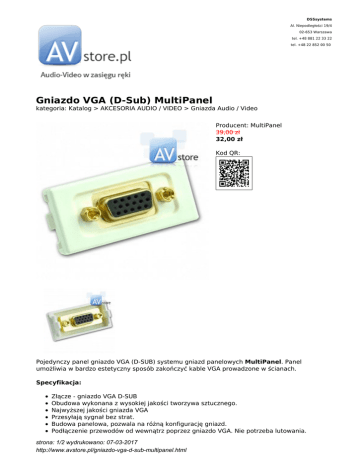 DSSsystems Al. Niepodległości 19/4 02-653 Warszawa tel. +48 881 22 33 22 tel. +48 22 852 00 50 Gniazdo VGA (D-Sub) MultiPanel kategoria: Katalog > AKCESORIA AUDIO / VIDEO > Gniazda Audio / Video Producent: MultiPanel 39,00 zł 32,00 zł Kod QR: Pojedynczy panel gniazdo VGA (D-SUB) systemu gniazd panelowych MultiPanel. Panel umożliwia w bardzo estetyczny sposób zakończyć kable VGA prowadzone w ścianach. Specyfikacja: Złącze - gniazdo VGA D-SUB Obudowa wykonana z wysokiej jakości tworzywa sztucznego. Najwyższej jakości gniazda VGA Przesyłają sygnał bez strat. Budowa panelowa, pozwala na różną konfigurację gniazd. Podłączenie przewodów od wewnątrz poprzez gniazdo VGA. Nie potrzeba lutowania. strona: 1/2 wydrukowano: 07-03-2017 http://www.avstore.pl/gniazdo-vga-d-sub-multipanel.html Kolor: biały Wymiary panelu: 22,5 x 45 mm Jest to oryginalny produkt MultiPanel, posiadający 24 miesiące gwarancji. System MultiPanel stworzony został dla wymajających klientów, chcących skonfigurować swoje gniazda montażowe w sposób indywidualny. Dzięki budowie panelowej, system pozwala na dowolną konfigurację gniazd Audio/Video, komputerowych oraz zasilających zachowując przy tym estetykę i przyjemny design. Dzięki gniazdom multimedialnym, mogą Państwo uniknąć wystających kabli ze ściany, eliminując w ten sposób brud i zbierający się kurz, a zyskując w ten sposób estetyczne wykończenie instalacji. Oszczędność miejsca System MultiPanel pozwala zaoszczędzić ok. 50% miejsca na ścianie w porównaniu z tradycyjnymi gniazdami naściennymi. np. Podłączenie 5 głośników w systemie tradycyjnym, wymaga instalacji 5 puszek podtynkowych, podczas gdy w systemie MultiPanel wystarczy montaż jednej puszki potrójnej(odpowiednik 3 puszek 60mm). Łatwy montaż Mocowanie na zatrzask zapewnia szybki montaż i łatwe dokonanie zmian w gnieździe, co znajduje zastosowanie w biurach, salach konferencyjnych i aulach wykładowych. W ofercie systemu MultiPanel posiadamy wiele innych rodzajów złącz, w tym: 1xRCA(chinch), 2xRCA(chinch), 2xBanan, VGA(D-sub), HDMI, RTV(męski+żeński antenowy), 2xF(łącze antenowe), RJ45 Cat 5e (UTP/FTP), RJ45 Cat 6(UTP/FTP), gniazda zasilające, gniazda zasilające z blokadą i inne. Panel VGA umożliwia budowę gniazda ściennego w systemie MultiPanel o dowolnej konfiguracji łącząc ze sobą inne panele z katalogu. Wszystkie podane ceny (zawierają podatek VAT 23%). Klientów zainteresowanych większymi zakupami lub współpracą prosimy o kontakt: (22) 852 00 50, lub [email protected] Wszystkie loga oraz znaki firmowe wykorzystane w opisach na stronie AVstore.pl . należą do ich prawnych właścicieli i mają wyłącznie charakter informacyjny strona: 2/2 wydrukowano: 07-03-2017 http://www.avstore.pl/gniazdo-vga-d-sub-multipanel.html