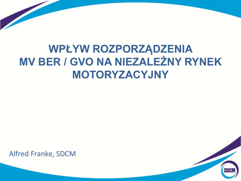 WPŁYW ROZPORZĄDZENIA MV BER / GVO NA NIEZALEŻNY RYNEK MOTORYZACYJNY Alfred Franke, SDCM Rozporządzenie 461/2010 oraz wytyczne sektorowe to zrównoważenie konkurencji na rynku Zgodnie z prawem producenci samochodów nie mogą uzależniać obowiązywania gwarancji od serwisowania i przeprowadzania przeglądów okresowych w Autoryzowanych Stacjach Obsługi. Stosowanie części zamiennych – usługi odpłatne w okresie gwarancji Części oryginalne z logo producenta samochodu Części porównywalnej jakości Niezależny warsztat Części oryginalne z logo producenta części Pozostałe części Przepisy sobie, a życie sobie… „W związku z niewykonaniem przeglądu serwisowego w autoryzowanym serwisie marki Peugeot nie możemy wykonać żadnych napraw w ramach gwarancji pojazdu…” Jak Europa walczy z naruszeniami MV BER Szwedzki Sąd Gospodarczy w 2012 r. nałożył kary na firmę KIA w wysokości 728 tys. euro. Hiszpański urząd ds. konkurencji ukarał Mazdę grzywną 182 tys. euro za ograniczanie niezależnym warsztatom możliwości oferowania swoich usług. We Francji zapisy ogólnych warunków sprzedaży i gwarancji oferowanych przez Toyota France zostały uznane za niezgodne z rozporządzeniem MV BER/GVO. Łotewska Rada ds. Konkurencji zadecydowała o ukaraniu grzywną w wysokości 134 tys. euro firmy KIA Auto oraz jej spółki matki za nakładanie na nabywców pojazdów restrykcyjnych wymogów dotyczących napraw gwarancyjnych. Czy KIA w Polsce działa zgodnie z prawem pomimo nieprzestrzegania MV BER ? Zgromadzony w sprawie materiał dowodowy nie dał podstaw do postawienia KIA Motors Polska Sp. z o.o. zarzutów naruszenia przepisów prawa ochrony konkurencji (…) Konsekwencje stanowiska UOKiK Zielone światło dla producentów samochodów dla nieposzanowania zapisów prawa; Brak ochrony konsumenta przed monopolistycznymi praktykami; Zniechęcanie konsumenta przed korzystaniem z konkurencyjnej oferty niezależnych operatorów w obawie przed utratą gwarancji; Wzrost cen na usługi w okresie gwarancji. Wniosek: Być może producenci samochodów wymagają wsparcia, ale z całą pewnością nie kosztem niezależnego rynku motoryzacyjnego, a w efekcie kierowców. DZIĘKUJĘ ZA UWAGĘ
