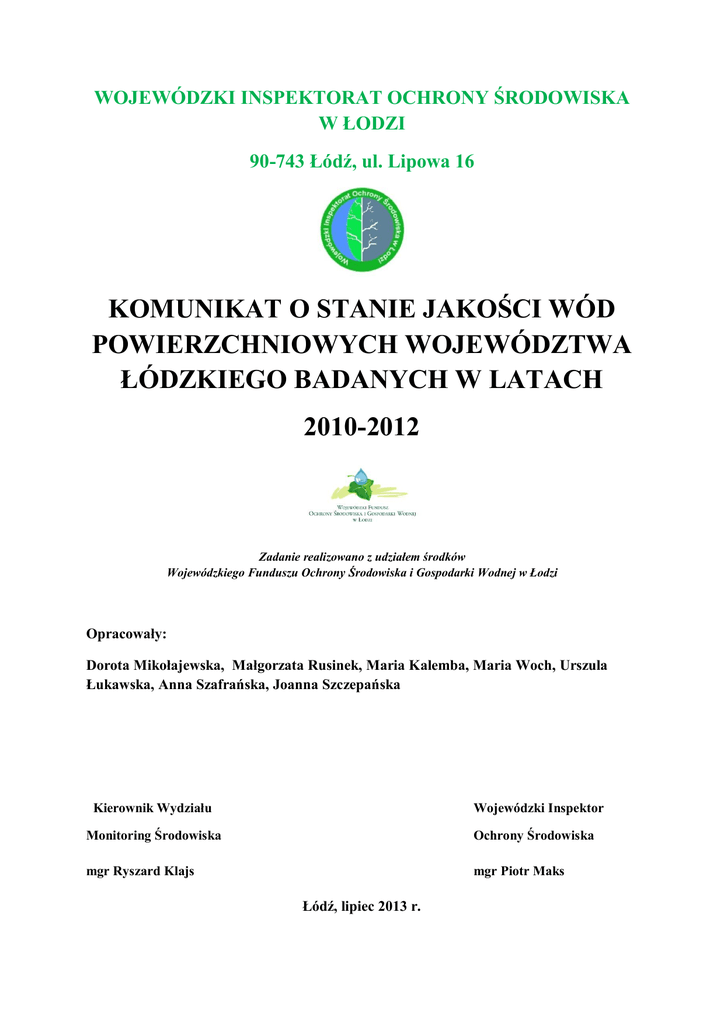 WOJEWÓDZKI INSPEKTORAT OCHRONY ŚRODOWISKA W ŁODZI 90-743 Łódź, ul. Lipowa 16 KOMUNIKAT O STANIE JAKOŚCI WÓD POWIERZCHNIOWYCH WOJEWÓDZTWA ŁÓDZKIEGO BADANYCH W LATACH 2010-2012 Zadanie realizowano z udziałem środków Wojewódzkiego Funduszu Ochrony Środowiska i Gospodarki Wodnej w Łodzi Opracowały: Dorota Mikołajewska, Małgorzata Rusinek, Maria Kalemba, Maria Woch, Urszula Łukawska, Anna Szafrańska, Joanna Szczepańska Kierownik Wydziału Wojewódzki Inspektor Monitoring Środowiska Ochrony Środowiska mgr Ryszard Klajs mgr Piotr Maks Łódź, lipiec 2013 r. Spis treści I. Wstęp 4 II. Podstawy prawne monitoringu wód powierzchniowych i ich oceny 4 III. Organizacja monitoringu oraz sposób oceny stanu wód powierzchniowych 5 III.1. Rodzaje sieci monitoringowych 5 III.2. Sposób oceny stanu wód 7 IV. Krótka charakterystyka województwa łódzkiego (budowa geologiczna, hydrografia, klimat) 11 V. Warunki meteorologiczne województwa łódzkiego w latach 2010-2012 13 VI. Informacja o rejonach wodnych objętych badaniami monitoringowymi 15 VI.1. Presje w rejonach wodnych 17 VII. Ocena stanu wód powierzchniowych 20 VII.1. Weryfikacja wyników pomiarów 20 VII.2. Ocena stanu wód w punktach pomiarowych 20 VII. 3 Ocena stanu jednolitych części wód 22 1 Spis tabel Tabela 1. Zestawienie danych do klasyfikacji stanu\ potencjału ekologicznego i chemicznego rzek w PPK objętych monitoringiem operacyjnym w województwie łódzkim – ocena za 2010 r. Tabela 2. Zestawienie danych do klasyfikacji stanu\potencjału ekologicznego i chemicznego rzek w PPK objętych monitoringiem badawczym w województwie łódzkim – ocena za 2010 r. Tabela 3. Zestawienie klasyfikacji stanu\potencjału ekologicznego i chemicznego rzek w PPK monitoringu obszarów chronionych w województwie łódzkim – ocena za 2010 r. Tabela 4. Zestawienie danych do klasyfikacji stanu\potencjału ekologicznego i chemicznego rzek w JCW objętych monitoringiem operacyjnym w województwie łódzkim– ocena za 2010 r. Tabela 5. Zestawienie danych do klasyfikacji stanu\potencjału ekologicznego i chemicznego rzek w JCW objętych monitoringiem badawczym w województwie łódzkim – ocena za 2010 r. Tabela 6. Zestawienie klasyfikacji stanu\potencjału ekologicznego i chemicznego rzek w JCW monitoringu obszarów chronionych w województwie łódzkim – ocena za 2010 r. Tabela 7. Zestawienie danych do klasyfikacji potencjału ekologicznego i stanu chemicznego zbiorników zaporowych objętych monitoringiem operacyjnym w województwie łódzkim – ocena za 2010 r. Tabela 8. Zestawienie danych do klasyfikacji potencjału ekologicznego i stanu chemicznego zbiorników zaporowych objętych monitoringiem badawczym w województwie łódzkim – ocena za 2010 r. Tabela 9. Zestawienie klasyfikacji potencjału ekologicznego i stanu chemicznego zbiorników zaporowych w monitoringu obszarów chronionych w województwie łódzkim – ocena za 2010 r. Tabela 10. Zestawienie danych do klasyfikacji stanu\ potencjału ekologicznego i chemicznego rzek w PPK objętych monitoringiem w województwie łódzkim – ocena za 2011 r. Tabela 11. Zestawienie klasyfikacji stanu\ potencjału ekologicznego i chemicznego rzek w PPK monitoringu obszarów chronionych w województwie łódzkim – ocena za 2011 r. Tabela 12. Zestawienie danych do klasyfikacji stanu\ potencjału ekologicznego i chemicznego rzek w JCW w województwie łódzkim – ocena za 2011 r. Tabela 13. Zestawienie klasyfikacji stanu\ potencjału ekologicznego i chemicznego rzek w JCW monitoringu obszarów chronionych w województwie łódzkim – ocena za 2011 r. Tabela 14. Zestawienie danych do klasyfikacji stanu\ potencjału ekologicznego i chemicznego rzek w PPK objętych monitoringiem w województwie łódzkim – ocena za 2012 r. Tabela 15. Zestawienie klasyfikacji stanu\ potencjału ekologicznego i chemicznego rzek w PPK monitoringu obszarów chronionych w województwie łódzkim – ocena za 2012 r. Tabela 16. Zestawienie danych do klasyfikacji stanu\ potencjału ekologicznego i chemicznego rzek w JCW w województwie łódzkim – ocena za 2012 r. Tabela 17. Zestawienie klasyfikacji stanu\ potencjału ekologicznego i chemicznego rzek w JCW monitoringu obszarów chronionych w województwie łódzkim – ocena za 2012 r. Tabela 18. Zestawienie klasyfikacji stanu/potencjału ekologicznego, stanu chemicznego i stanu jcw badanych w województwie łódzkim w latach 2010-2012 2 Spis rysunków Rysunek 1. Schemat klasyfikacji stanu ekologicznego jednolitych części wód powierzchniowych Rysunek 2. Przebieg średnich miesięcznych temperatur w latach 2010-2012 (stacja IMGW w Sulejowie) Rysunek 3. Przebieg rocznych sum opadów atmosferycznych uśrednionych w latach 2010-2012 (stacja IMGW w Sulejowie) Rysunek 4. Objaśnienia symbolizacji oceny w ppk i jcw Rysunek 5. Objaśnienia symbolizacji oceny spełnienia wymagań dla obszarów chronionych Rysunek 6. Objaśnienia symbolizacji oceny zbiorników zaporowych Spis map Mapa 1. Stan/potencjał ekologiczny jednolitych w latach 2010-2012 – dorzecze Odry części Mapa 2. Stan/potencjał ekologiczny jednolitych części wód badanych na terenie woj. łódzkiego latach 2010-2012 – dorzecze Wisły Mapa 3. Stan chemiczny jednolitych części wód badanych na terenie woj. łódzkiego w latach 2010-2012 - dorzecze Odry Mapa 4. Stan chemiczny jednolitych części wód badanych na terenie woj. łódzkiego w latach 2010-2012 - dorzecze Wisły Mapa 5. Stan jednolitych części wód badanych na terenie woj. łódzkiego w latach 2010-2012 - dorzecze Odry Mapa 6. Stan jednolitych części wód badanych na terenie woj. łódzkiego w latach 2010-2012 - dorzecze Wisły Mapa 7. Spełnienie wymagań obszarów chronionych przez jednolite części wód badane na terenie woj. łódzkiego w latach 2010-2012 - dorzecze Odry Mapa 8. Spełnienie wymagań obszarów chronionych przez jednolite części wód badane na terenie woj. łódzkiego w latach 2010-2012 -