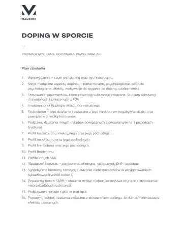 DOPING W SPORCIE _ PROWADZĄCY: KAMIL KOCZWARA, PAWEŁ PAWLAK Plan szkolenia 1. Wprowadzenie – czym jest doping oraz rys historyczny. 2. Socjo-medyczne aspekty dopingu - (determinanty psychologiczne, podłoże psychologiczne, efekty, motywacje do sięgania po doping, uzależnienie). 3. Stosowanie suplementów, które zawierają substancje zakazane. Studium substancji dozwolonych i zakazanych z FDA. 4. Anatomia oraz fizjologia układu hormonalnego. 5. Testosteron – jego działanie i związane z jego niedoborem negatywne skutki oraz powiązanie z resztą hormonów. 6. Podstawy działania innych układów powiązanych z omawianymi na 3 poziomach środkami. 7. Profil testosteronu iniekcyjnego oraz jego pochodnych. 8. Profil nandrolonu oraz jego pochodnych. 9. Profil trenbolonu oraz jego pochodnych. 10. Profil Boldenonu. 11. Profile innych SAA. 12. “Spalacze” tłuszczu – clenbuterol, efedryna, salbutamol, DNP i podobne. 13. Syntetyczne hormony tarczycy (ukazanie niebezpieczeństw w przygotowaniach sylwetkowych wśród kobiet). 14. Popularny temat: SARM – obalenie mitów, niebezpieczeństwa płynące z stosowania nieprzebadanych substancji. 15. Podstawowe, proste cykle w praktyce. 16. Poprawny odblok i badania związane z stosowaniem dopingu. Unikanie/minimalizacja efektów ubocznych.