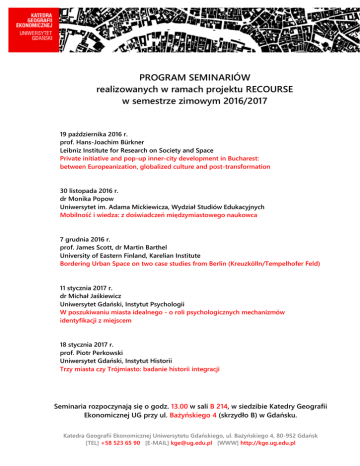 PROGRAM SEMINARIÓW realizowanych w ramach projektu RECOURSE w semestrze zimowym 2016/2017 19 października 2016 r. prof. Hans-Joachim Bürkner Leibniz Institute for Research on Society and Space Private initiative and pop-up inner-city development in Bucharest: between Europeanization, globalized culture and post-transformation 30 listopada 2016 r. dr Monika Popow Uniwersytet im. Adama Mickiewicza, Wydział Studiów Edukacyjnych Mobilność i wiedza: z doświadczeń międzymiastowego naukowca 7 grudnia 2016 r. prof. James Scott, dr Martin Barthel University of Eastern Finland, Karelian Institute Bordering Urban Space on two case studies from Berlin (Kreuzkölln/Tempelhofer Feld) 11 stycznia 2017 r. dr Michał Jaśkiewicz Uniwersytet Gdański, Instytut Psychologii W poszukiwaniu miasta idealnego - o roli psychologicznych mechanizmów identyfikacji z miejscem 18 stycznia 2017 r. prof. Piotr Perkowski Uniwersytet Gdański, Instytut Historii Trzy miasta czy Trójmiasto: badanie historii integracji Seminaria rozpoczynają się o godz. 13.00 w sali B 214, w siedzibie Katedry Geografii Ekonomicznej UG przy ul. Bażyńskiego 4 (skrzydło B) w Gdańsku. Katedra Geografii Ekonomicznej Uniwersytetu Gdańskiego, ul. Bażyńskiego 4, 80-952 Gdańsk [TEL] +58 523 65 90 [E-MAIL] [email protected] [WWW] http://kge.ug.edu.pl