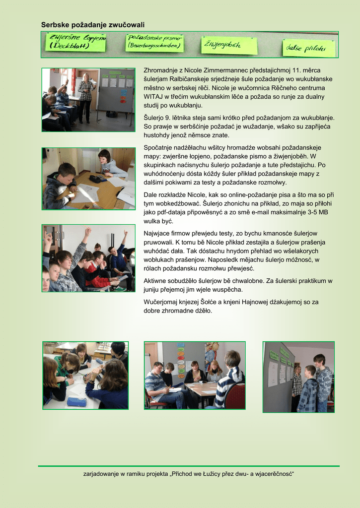 Serbske poţadanje zwučowali Zhromadnje z Nicole Zimmermannec předstajichmoj 11. měrca ńulerjam Ralbičanskeje srjedźneje ńule poņadanje wo wukubłanske městno w serbskej rěči. Nicole je wučomnica Rěčneho centruma WITAJ w třećim wukubłanskim lěće a poņada so runje za dualny studij po wukubłanju. Ńulerjo 9. lětnika steja sami krótko před poņadanjom za wukubłanje. So prawje w serbńćinje poņadać je wuņadanje, wńako su zapřijeća hustohdy jenoņ němsce znate. Spočatnje nadźěłachu wńitcy hromadźe wobsahi poņadanskeje mapy: zwjerńne łopjeno, poņadanske pismo a ņiwjenjoběh. W skupinkach naćisnychu ńulerjo poņadanje a tute předstajichu. Po wuhódnoćenju dósta kóņdy ńuler přikład poņadanskeje mapy z dalńimi pokiwami za testy a poņadanske rozmołwy. Dale rozkładźe Nicole, kak so online-poņadanje pisa a ńto ma so při tym wobkedźbować. Ńulerjo zhonichu na přikład, zo maja so přiłohi jako pdf-dataja připowěsnyć a zo smě e-mail maksimalnje 3-5 MB wulka być. Najwjace firmow přewjedu testy, zo bychu kmanosće ńulerjow pruwowali. K tomu bě Nicole přikład zestajiła a ńulerjow prańenja wuhódać dała. Tak dóstachu hnydom přehlad wo wńelakorych wobłukach prańenjow. Naposledk mějachu ńulerjo móņnosć, w rólach poņadansku rozmołwu přewjesć. Aktiwne sobudźěło ńulerjow bě chwalobne. Za ńulerski praktikum w juniju přejemoj jim wjele wuspěcha. Wučerjomaj knjezej Ńołće a knjeni Hajnowej dźakujemoj so za dobre zhromadne dźěło. zarjadowanje w ramiku projekta „Přichod we Łuņicy přez dwu- a wjacerěčnosć“ Bewerbungstraining in sorbischer Sprache Mit den SchülerInnen der 9. Klasse der Sorbischen Mittelschule Ralbitz führten wir am 11. März mit Nicole Zimmermann ein Bewerbungstraining in sorbischer Sprache durch. Eine Bewerbung in sorbischer Sprache stellt viele von uns vor eine Herausforderung. Nicole Zimmermann ist Auszubildende im 3. Lehrjahr beim WITAJ Sprachzentrum und bewirbt sich zur Zeit für ein duales Studium. Mit den SchülerInnen wurden die Inhalte einer Bewerbung im Allgemeinen erarbeitet. Sorbische Begrifflichkeiten wurden im Besonderen ergänzt. In kleinen Gruppen hatten die SchülerInnen jeweils die Aufgabe, ein Anschreiben, ein Deckblatt und einen Lebenslauf zu erstellen. Nach der gemeinsamen Auswertung erhielt jeder Schüler eine Bewerbungsmappe als Musterbeispiel, die im Vorfeld von uns erarbeitet wurde. Weitere Themen waren Online-Bewerbungen, Eignungstests und Vorstellungsgespräche. Die SchülerInnen lernten beispielsweise, dass Online-Bewerbungen bevorzugt mit pdf-Anhängen und einer maximalen Größe von 3-5 MB verschickt werden. Im von Nicole erarbeiteten Eignungstest, den die SchülerInnen selber lösen sollten, erkannten sie, dass dieser sehr umfangreich sein kann. Im Rollenspiel übten die SchülerInnen abschließend ein Bewerbungsgespräch. Die Mitarbeit der SchülerInnen war vorbildlich. Für ihr Schülerpraktikum im Juni wünschen wir ihnen viel Erfolg. Ein herzlicher Dank gilt den Lehrern Herrn Scholze und Frau Haine für die gute Zusammenarbeit. Veranstaltung im Rahmen des Projektes „Zukunft in der Oberlausitz durch Zwei- und Mehrsprachigkeit“ Poţadanje wo wukubłanske městno na … twój wobraz Sofija Přikładec Hórčanska 80 01920 Nowe Město telefon: 0123 4567891 e-mail: [email protected] Sofija Přikładec Hórčanska 80 01920 Nowe Město kroma nalěwo tel.: 0123 4567891 e-mail: [email protected] 2,5 cm linka 12 firma mjeno wjednicy/ wjednika adresa PLZ město/wjes Arial 11 10.03.2010 linka 20 Poţadanje wo wukubłanske městno na … Česćena knjeni / česćeny knjez …, z wulkim zajimom čitach/ słyńach Wań poskitk w .... a poņadam so wo wukubłanske městno jako .... Tuchwilu chodźu do Serbskeje srjedźneje ńule...., kotruņ w juliju ... z realnońulskim wotzamknjenjom/ wotzamknjenjom hłowneje ńule wopuńću. Přez rozmołwu z powołanskim poradźowarjom... / Za čas praktikuma pola ... mějach składnosć, nadawki a wobsahi powołanja zeznać. Přez to je so mój zajim na tutym powołanju zesylnił. Sym so wo nadawkach a dźěłowych wobłukach Wańeje firmy/ institucije ... na internetnej stronje.../ přez rozmołwu z .../ na Dnju wotewrjenych duri informowała. Tam zhonich wo... Za powołanje jako... mam dobre wuměnjenja. W ńuli zajimuju so wosebje za předmjety.... Tam mam teņ najlěpńe wukony. Sym swědomita, dokładna a dźěłam rady w teamje. Na wosobinsku rozmołwu so wjeselu. Z přećelnym postrowom podpismo z pjerom Přiłohi ņiwjenjoběh wuswědčenje 9. lětnika (abo 10. lětnika, 1. połlěto) posudk praktikuma wopismo kursa wopismo lěkarskeho přepytowanja (za młodostnych pod 18 lětami) poņadanje do lista DIN-A4 ze znamku za 1,45 € Sofija Přikładec Hórčanska 80 01920 Nowe Město tel.: 0123 4567891 e-mail: [email protected] Ţiwjenjoběh narodźena 01.01.1996 w Budyńinje swójbny staw njewudata statna přisłuńnosć němska starńej Jan Přikład, blidar Helena Přikładowa, wučerka Šulske kubłanje 2006 – 2011 Serbska srjedźna ńula “Michał Hórnik” Worklecy realnońulske wotzamknjenje: julij 2011 2002 – 2006 Serbska zakładna ńula “Michał Hórnik” Worklecy Praktikum 06/2010 prózdninske dźěło w pěstowarni w Myńecach, hdźeņ kubła so po modelu WITAJ Znajomosće MS Office jara dobre znajomosće Photoshop CS3 dobre znajomosće HTML zakładne znajomosće Rěče serbńćina maćerna rěč jendźelńćina ńulske znajomosće (5 lět) čěńćina ńulske znajomosće (3 lěta) Hobbyje kolesowanje, čitanje, kopańca Nowe Město, 10.03.2010 Badensko-Württembergska/Baden-Württemberg Bayerska/Bayern Berlin Braniborska/Brandenburg Bremen Hamburg Hessenska/Hessen Mecklenburgsko-Předpomorska/Mecklenburg-Vorpommern Delnja Sakska/Niedersachsen Sewjerorynsko-Westfalska/Nordrhein-Westfalen Porynsko-Pfalca/Rheinland-Pfalz Posaarska/Saarland Sakska/Sachsen Saksko-Anhaltska/Sachsen-Anhalt Schleswi