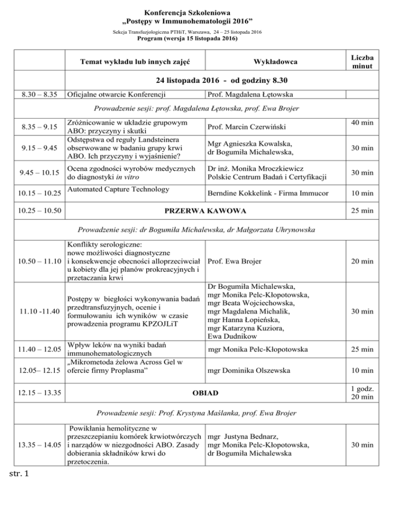 Konferencja Szkoleniowa „Postępy w Immunohematologii 2016” Sekcja Transfuzjologiczna PTHiT, Warszawa, 24 – 25 listopada 2016 Program (wersja 15 listopada 2016) Temat wykładu lub innych zajęć Wykładowca Liczba minut 24 listopada 2016 - od godziny 8.30 8.30 – 8.35 Prof. Magdalena Łętowska Oficjalne otwarcie Konferencji Prowadzenie sesji: prof. Magdalena Łętowska, prof. Ewa Brojer 8.35 – 9.15 9.15 – 9.45 Zróżnicowanie w układzie grupowym ABO: przyczyny i skutki Odstępstwa od reguły Landsteinera obserwowane w badaniu grupy krwi ABO. Ich przyczyny i wyjaśnienie? 9.45 – 10.15 Ocena zgodności wyrobów medycznych do diagnostyki in vitro 10.15 – 10.25 Automated Capture Technology 10.25 – 10.50 Prof. Marcin Czerwiński 40 min Mgr Agnieszka Kowalska, dr Bogumiła Michalewska, 30 min Dr inż. Monika Mroczkiewicz Polskie Centrum Badań i Certyfikacji 30 min Berndine Kokkelink - Firma Immucor 10 min PRZERWA KAWOWA 25 min Prowadzenie sesji: dr Bogumiła Michalewska, dr Małgorzata Uhrynowska Konflikty serologiczne: nowe możliwości diagnostyczne 10.50 – 11.10 i konsekwencje obecności alloprzeciwciał Prof. Ewa Brojer u kobiety dla jej planów prokreacyjnych i przetaczania krwi Dr Bogumiła Michalewska, mgr Monika Pelc-Kłopotowska, Postępy w biegłości wykonywania badań mgr Beata Wojciechowska, przedtransfuzyjnych, ocenie i 11.10 -11.40 mgr Magdalena Michalik, formułowaniu ich wyników w czasie mgr Hanna Łopieńska, prowadzenia programu KPZOJLiT mgr Katarzyna Kuziora, Ewa Dudnikow Wpływ leków na wyniki badań 11.40 – 12.05 mgr Monika Pelc-Kłopotowska immunohematologicznych „Mikrometoda żelowa Across Gel w 12.05– 12.15 ofercie firmy Proplasma” mgr Dominika Olszewska 12.15 – 13.35 OBIAD 20 min 30 min 25 min 10 min 1 godz. 20 min Prowadzenie sesji: Prof. Krystyna Maślanka, prof. Ewa Brojer Powikłania hemolityczne w przeszczepianiu komórek krwiotwórczych mgr Justyna Bednarz, 13.35 – 14.05 i narządów w niezgodności ABO. Zasady mgr Monika Pelc-Kłopotowska, dobierania składników krwi do dr Bogumiła Michalewska przetoczenia. str. 1 30 min Ocena funkcjonowania elektronicznego 14.05 – 14.20 sytemu przesyłania wyników sprawdzianów KPZOJ dla LIT on-line Dr Bogumiła Michalewska, mgr Wojciech Zabłocki, mgr Magdalena Michalik 15 min. 14.20 - 14. 50 TRALI – nowe aspekty kwalifikacji Dr Małgorzata Uhrynowska 30 min Porównanie wykrywalności przeciwciał HLA przy użyciu testów: 14.50 – 15.20 limfocytotoksyczności, enzymatycznego ELISA i LABScreen Mixed z wykorzystaniem technologii Luminex Prof. Krystyna Maślanka, mgr Partycja Łopacz 30 min 25 listopada 2016 - od godziny 8.30 Prowadzenie sesji: prof. Krystyna Maślanka, dr Bogumiła Michalewska Postępowanie z masywnym krwawieniem 8.30 – 9.00 w przypadku pacjentów z przeciwciałami Mgr Beata Wojciechowska do krwinek czerwonych Dr Erwin Scharberg Institute for Transfusion Medicine and Discrepancies between serology and 9.00 – 9.45 Immunohematology, Baden-Baden, genetic typing Niemcy Wykład na zaproszenie firmy DiaHem Dr Bogumiła Michalewska, Podsumowanie badania ankietowego mgr Justyna Bednarz, dotyczącego funkcjonowania laboratoriów 9.45 – 10.10 mgr Beata Wojciechowska, immunologii transfuzjologicznej w mgr Monika Pelc Kłopotowska, podmiotach leczniczych prof. Ewa Brojer „Elektroniczna dokumentacja transfuzji – 10.10 -10.20 Firma MARCEL od produkcji do przetoczenia” 10.20- 10.50 PRZERWA KAWOWA 30 min 45 minut 25 min 10 min 30 min Prowadzenie sesji: prof. Ewa Brojer, dr Małgorzata Uhrynowska Konflikt HPA1a i alloimmunologiczna małopłytkowość płodów i noworodków 10.50 – 11.20 - badania przeglądowe na świecie i w Polsce Dr Małgorzata Uhrynowska, dr Katarzyna Guz, dr Agnieszka Orzińska, mgr Agnieszka Gierszon, mgr Patrycja Łopacz, prof. Krystyna Maślanka, prof. Ewa Brojer Leczenie alloimmunologicznej Dr n. med. Marzena Dębska małopłytkowości płodów i noworodków Ilościowe badania przeciwciał antyHPA1a –jako czynnik predykcyjny 11.50 – 12.20 małopłytkowości u płodu/noworodka – na mgr Agnieszka Gierszon podstawie literatury i przypadków badanych w ramach PREVFNAIT 11. 20 – 11.50 12.20- 13.40 13.35 – 15.35 str. 2 OBIAD Obrady zamknięte dla Pracowni Immunologii Transfuzjologicznych CKiK 30 min 30 min 30 min. 1 godz. 20 min 2 godz