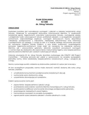PLAN DZIAŁANIA KZ 508 ds. Usług Tatuażu DATA: 2015-11-30 Wersja: 1 Projekt uzgodniony w KZ Strona 1 PLAN DZIAŁANIA KZ 508 ds. Usług Tatuażu STRESZCZENIE Zadaniem komitetu jest normalizacja wymagań i zaleceń w zakresie świadczenia usług tatuażu. Obejmuje to wymagania dotyczące informowania klientów, tj. uzyskiwania świadomej zgody, higienicznych warunków wykonywania tatuażu, wymaganej wiedzy i umiejętności osób wykonujących tatuaż, profilaktyki zakażeń, w szczególności szczepień ochronnych, odpowiedniego zaplecza, wymagań dotyczących mycia, dezynfekcji i sterylizacji, postępowania z odpadami, niezbędnej dokumentacji oraz informacji o postępowaniu po zabiegu. Z uwagi na fakt, iż w trakcie zabiegu tatuowania dochodzi do naruszenia ciągłości tkanek ludzkich, a przy braku znajomości i przestrzegania procedur higieniczno-sanitarnych może dojść do narażenia na zakażenie zarówno klientów, jak i pracowników gabinetu, zebranie wszystkich powyższych wymagań w normie staje się niezbędne dla zapewnienia maksymalnej higieny oraz bezpieczeństwa zdrowia zarówno klientom jak i osobom wykonującym tatuaż. Intencją utworzenia KZ ds. Usług Tatuażu (komitetu lustrzanego dla CEN/TC 435 Project Committee – Tattooing services) jest udział w opracowaniu na szczeblu europejskim jednolitej normy, która określałaby bezpieczeństwo świadczonych usług, i przyjęcie jej w kraju. Normy z prawnego punktu widzenia są dobrowolne, jednak ich wpływ jest znaczący. W tym szczególnym przypadku norma może stanowić wartość dodaną dla rynku usług tatuażu, poprzez: • umożliwienie konsumentom podejmowania świadomych decyzji, • wyrównanie szans dostawców usług, • uzupełnienie obowiązujących przepisów. Celem opracowania normy jest: • • • • • • zapewnienie bezpieczeństwa i jakości usługi, podniesienie zadowolenia i zaufania klientów korzystających z usług tatuażu, podnoszenie kwalifikacji i promowanie etycznego postępowania personelu, przestrzeganie niezbędnych zasad higieny, harmonizacja rozwiązań na szczeblu europejskim, ograniczenie ryzyka szerzenia zakażeń i chorób zakaźnych u ludzi. PLAN DZIAŁANIA KZ 508 ds. Usług Tatuażu DATA: 2015-11-30 Wersja: 1 Projekt uzgodniony w KZ Strona 2 1 ŚRODOWISKO BIZNESOWE KZ 1.1 Opis środowiska biznesowego Na działalność gospodarczą objętą zakresem KZ znaczący wpływ mają głównie uwarunkowania społeczne. W ostatnich latach odnotowano znaczący rozwój rynku usług tatuażu, moda na tatuaż przeniknęła już do wszystkich środowisk. Dziś tatuaże noszą nie tylko artyści i ludzie wolnych zawodów, ale także biznesmeni, pracownicy korporacji i politycy. Do dziś w niektórych zawodach wymaga się zasłaniania tatuaży w miejscach odsłoniętych podczas wykonywania pracy. Do grup tych należą m.in. policjanci, personel lotniczy, politycy. W Polsce profesjonalne salony tatuażu zaczęły pojawiać się w latach 90, a ich klientami byli głównie artyści czy sportowcy. Wcześniej tatuaże kojarzone były ze środowiskiem przestępczym i marginesowym. Wraz z upływem lat wzrasta akceptacja zjawiska tatuowania, a także wiedza na temat kultury i sztuki tatuażu. Rośnie również, choć bardzo powoli, świadomość osób chcących się tatuować w kwestii zasad higieny i bezpieczeństwa wykonywania usługi. W Polsce jest coraz więcej salonów tatuażu na wysokim poziomie, oferujących profesjonalne usługi oraz dobrze wyszkolony personel. Zapotrzebowanie na usługi tatuażu wciąż rośnie. 2 OCZEKIWANE KORZYŚCI Z REALIZACJI PRAC KZ Na polskim rynku będzie funkcjonować norma jednolita na szczeblu europejskim, zawierająca wymagania i zalecenia w zakresie usług tatuażu. Jednostki działające zgodnie z tą normą będą miały pewność, że spełniają wymagania tej samej Normy Europejskiej, stosowanej we wszystkich krajach europejskich. Dla klientów i wykonujących usługi opracowanie odpowiedniej normy oznacza: zdrowie konsumentów i personelu, świadome społeczeństwo wysoko wykwalifikowany i świadomy personel, wysoką jakość świadczonych usług, spełnianie wymogów w zakresie zapewnienia higienicznych warunków pracy i świadczonych usług, zadowolenie klienta, konkurencyjność dostawców. Stosowanie się do postanowień zawartych w normie może zminimalizować ryzyko związane z występowaniem zakażeń i chorób zakaźnych u ludzi. PLAN DZIAŁANIA KZ 508 ds. Usług Tatuażu DATA: 2015-11-30 Wersja: 1 Projekt uzgodniony w KZ Strona 3 3 CZŁONKOSTWO W KZ Każdy podmiot krajowy zainteresowany daną tematyką ma prawo zgłosić chęć uczestnictwa w KZ i po spełnieniu wymogów proceduralnych (procedura Z2-P3 w powiązaniu z Z2-P1) stać się członkiem KZ. Każdy członek KZ realizuje zadania KZ poprzez swoich reprezentantów. Aktualny skład KZ jest podany na stronie www.pkn.pl, w Wykazie OT. 4 CELE KZ I STRATEGIA ICH REALIZACJI 4.1 Cele KZ • • • • • • zapewnienie bezpieczeństwa i jakości usługi, podniesienie zadowolenia i zaufania klientów korzystających z usług tatuażu, podnoszenie kwalifikacji i promowanie etycznego postępowania personelu, przestrzeganie niezbędnych zasad higieny, harmonizacja rozwiązań na szczeblu europejskim, ograniczenie ryzyka szerzenia zakażeń i chorób zakaźnych u ludzi 4.2 Strategia ustalona do osiągnięcia celów KZ • aktywny udział w opracowaniu Normy Europejskiej, • szerokie konsultowanie projektu Normy Europejskiej w celu wypracowania reprezentatywnego stanowiska krajowego i uwzględnienia potrzeb krajowych, • poszukiwanie źródeł finansowania wersji polskiej. 4.3 Aspekty środowiskowe Komitet Zadaniowy rozpatrzy potrzeby uwzględnienia zagadnień środowiskowych, m.in. kwestii związanych z postępowaniem z odpadami pozabiegowymi. 5 CZYNNIKI WPŁYWAJĄCE NA REALIZACJĘ PROGRAMU PRAC KZ I WPROWADZANIE NOWYCH TN DO PROGRAMU PRAC Każdy zainteresowany ma możliwość zgłaszania tematów 