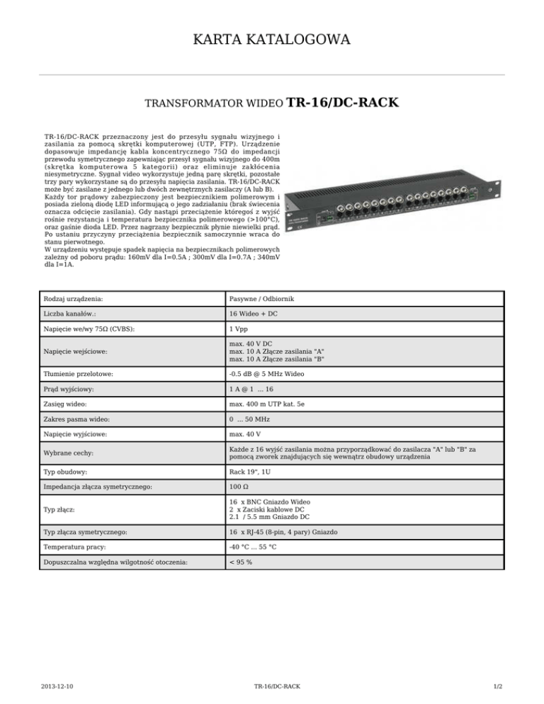 KARTA KATALOGOWA TRANSFORMATOR WIDEO TR-16/DC-RACK TR-16/DC-RACK przeznaczony jest do przesy u sygna u wizyjnego i zasilania za pomoc skr tki komputerowej (UTP, FTP). Urz dzenie dopasowuje impedancj kabla koncentrycznego 75 do impedancji przewodu symetrycznego zapewniaj c przesy sygna u wizyjnego do 400m (skr tka komputerowa 5 kategorii) oraz eliminuje zak ócenia niesymetryczne. Sygna video wykorzystuje jedn par skr tki, pozosta e trzy pary wykorzystane s do przesy u napi cia zasilania. TR-16/DC-RACK mo e by zasilane z jednego lub dwóch zewn trznych zasilaczy (A lub B). Ka dy tor pr dowy zabezpieczony jest bezpiecznikiem polimerowym i posiada zielon diod LED informuj c o jego zadzia aniu (brak wiecenia oznacza odci cie zasilania). Gdy nast pi przeci enie którego z wyj ro nie rezystancja i temperatura bezpiecznika polimerowego (>100°C), oraz ga nie dioda LED. Przez nagrzany bezpiecznik p ynie niewielki pr d. Po ustaniu przyczyny przeci enia bezpiecznik samoczynnie wraca do stanu pierwotnego. W urz dzeniu wyst puje spadek napi cia na bezpiecznikach polimerowych zale ny od poboru pr du: 160mV dla I=0.5A ; 300mV dla I=0.7A ; 340mV dla I=1A. Rodzaj urz dzenia: Pasywne / Odbiornik Liczba kana ów.: 16 Wideo + DC Napi cie we/wy 75 (CVBS): 1 Vpp Napi cie wej ciowe: max. 40 V DC max. 10 A Z cze zasilania "A" max. 10 A Z cze zasilania "B" T umienie przelotowe: -0.5 dB @ 5 MHz Wideo Pr d wyj ciowy: 1 A @ 1 ... 16 Zasi g wideo: max. 400 m UTP kat. 5e Zakres pasma wideo: 0 ... 50 MHz Napi cie wyj ciowe: max. 40 V Wybrane cechy: Ka de z 16 wyj zasilania mo na przyporz dkowa do zasilacza "A" lub "B" za pomoc zworek znajduj cych si wewn trz obudowy urz dzenia Typ obudowy: Rack 19", 1U Impedancja z cza symetrycznego: 100 Typ z cz: 16 x BNC Gniazdo Wideo 2 x Zaciski kablowe DC 2.1 / 5.5 mm Gniazdo DC Typ z cza symetrycznego: 16 x RJ-45 (8-pin, 4 pary) Gniazdo Temperatura pracy: -40 °C ... 55 °C Dopuszczalna wzgl dna wilgotno 2013-12-10 otoczenia: < 95 % TR-16/DC-RACK 1/2 KARTA KATALOGOWA Zasilanie 12V DC Zasi g transmisji zasilania: 353 m @ 50 mA 235 m @ 75 mA 176 m @ 100 mA 141 m @ 125 mA 117 m @ 150 mA 88 m @ 200 mA 70 m @ 250 mA 58 m @ 300 mA 50 m @ 350 mA 44 m @ 400 mA 39 m @ 450 mA 35 m @ 500 mA 29 m @ 600 mA 25 m @ 700 mA 22 m @ 800 mA 19 m @ 900 mA 17 m @ 1000 mA Waga: 1.250 kg Wymiary: 483 x 44 x 245 mm 2013-12-10 TR-16/DC-RACK 2/2
