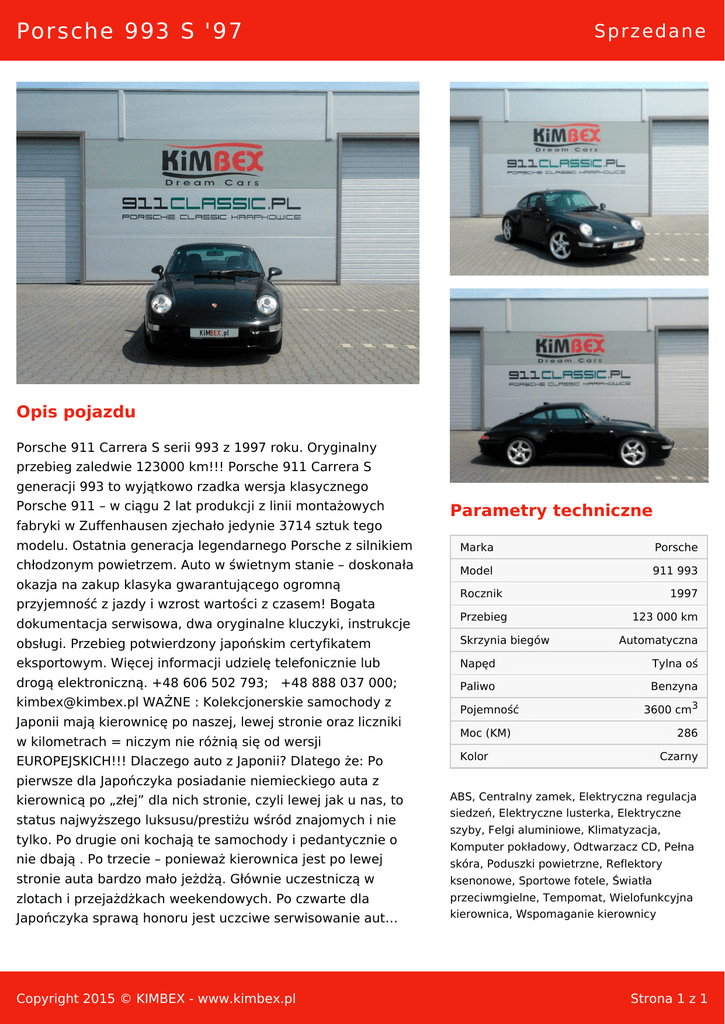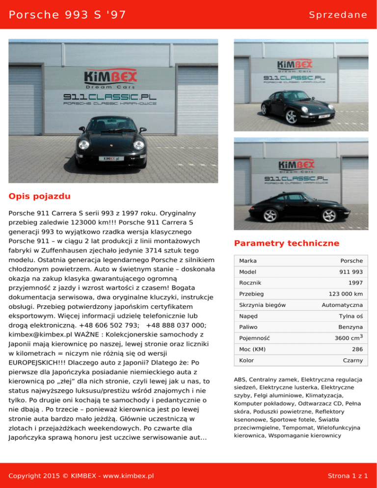 Porsche 993 S '97 Sprzedane Opis pojazdu Porsche 911 Carrera S serii 993 z 1997 roku. Oryginalny przebieg zaledwie 123000 km!!! Porsche 911 Carrera S generacji 993 to wyjątkowo rzadka wersja klasycznego Porsche 911 – w ciągu 2 lat produkcji z linii montażowych fabryki w Zuffenhausen zjechało jedynie 3714 sztuk tego Parametry techniczne modelu. Ostatnia generacja legendarnego Porsche z silnikiem Marka Porsche chłodzonym powietrzem. Auto w świetnym stanie – doskonała Model 911 993 okazja na zakup klasyka gwarantującego ogromną przyjemność z jazdy i wzrost wartości z czasem! Bogata dokumentacja serwisowa, dwa oryginalne kluczyki, instrukcje Rocznik Przebieg 1997 123 000 km obsługi. Przebieg potwierdzony japońskim certyfikatem Skrzynia biegów eksportowym. Więcej informacji udzielę telefonicznie lub Napęd Tylna oś drogą elektroniczną. +48 606 502 793; +48 888 037 000; Paliwo Benzyna [email protected] WAŻNE : Kolekcjonerskie samochody z Japonii mają kierownicę po naszej, lewej stronie oraz liczniki w kilometrach = niczym nie różnią się od wersji EUROPEJSKICH!!! Dlaczego auto z Japonii? Dlatego że: Po Pojemność Automatyczna 3600 cm3 Moc (KM) 286 Kolor Czarny pierwsze dla Japończyka posiadanie niemieckiego auta z kierownicą po „złej” dla nich stronie, czyli lewej jak u nas, to status najwyższego luksusu/prestiżu wśród znajomych i nie tylko. Po drugie oni kochają te samochody i pedantycznie o nie dbają . Po trzecie – ponieważ kierownica jest po lewej ABS, Centralny zamek, Elektryczna regulacja siedzeń, Elektryczne lusterka, Elektryczne szyby, Felgi aluminiowe, Klimatyzacja, Komputer pokładowy, Odtwarzacz CD, Pełna skóra, Poduszki powietrzne, Reflektory stronie auta bardzo mało jeżdżą. Głównie uczestniczą w ksenonowe, Sportowe fotele, Światła zlotach i przejażdżkach weekendowych. Po czwarte dla przeciwmgielne, Tempomat, Wielofunkcyjna Japończyka sprawą honoru jest uczciwe serwisowanie aut… kierownica, Wspomaganie kierownicy Copyright 2015 © KIMBEX - www.kimbex.pl Strona 1 z 1