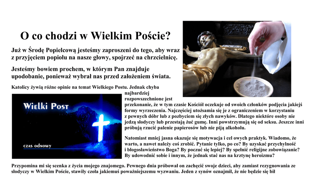 O co chodzi w Wielkim Poście? Już w Środę Popielcową jesteśmy zaproszeni do tego, aby wraz z przyjęciem popiołu na nasze głowy, spojrzeć na chrzcielnicę. Jesteśmy bowiem prochem, w którym Pan znajduje upodobanie, ponieważ wybrał nas przed założeniem świata. Katolicy żywią różne opinie na temat Wielkiego Postu. Jednak chyba najbardziej rozpowszechnione jest przekonanie, że w tym czasie Kościół oczekuje od swoich członków podjęcia jakiejś formy wyrzeczenia. Najczęściej utożsamia się je z ograniczeniem w korzystaniu z pewnych dóbr lub z pozbyciem się złych nawyków. Dlatego niektóre osoby nie jedzą słodyczy lub przestają żuć gumę. Inni powstrzymują się od seksu. Jeszcze inni próbują rzucić palenie papierosów lub nie piją alkoholu. Natomiast mniej jasna okazuje się motywacja i cel owych praktyk. Wiadomo, że warto, a nawet należy coś zrobić. Pytanie tylko, po co? By uzyskać przychylność i błogosławieństwo Boga? By poczuć się lepiej? By spełnić religijne zobowiązanie? By udowodnić sobie i innym, że jednak stać nas na krztynę heroizmu? Przypomina mi się scenka z życia mojego znajomego. Pewnego dnia próbował on zachęcić swoje dzieci, aby zamiast rezygnowania ze słodyczy w Wielkim Poście, stawiły czoła jakiemuś poważniejszemu wyzwaniu. Jeden z synów oznajmił, że nie będzie się bił z rodzeństwem. W połowie Postu tata zapytał go, jak sobie radzi z wypełnieniem przyrzeczenia. „Idzie mi nieźle – odpowiedział chłopiec, „ale wiesz co, nie mogę się już doczekać Wielkanocy”. Ta anegdota wskazuje na jeszcze inne nieporozumienie związane z naszymi wielkopostnymi wysiłkami. Obok nieprzyjemnej konieczności odmówienia sobie tego, co lubimy, z góry zakładamy, że to tylko tymczasowe zabiegi. Napinamy muskuły i chodzimy jak kot z pęcherzem, byle do Wielkanocy. Rozmaicie nam to wychodzi. Jeśli walecznie trwamy, zwalczając zakusy, czujemy się dumni i zadowoleni z siebie. Ale jeśli pomimo „silnej woli” ulegamy „pokusie” zjedzenia ulubionego ciastka, zrazu pojawia się frustracja i zwątpienie. Może jednak nie jestem takim Herkulesem, jak mi się wydawało? (Istotnie, nie byłem nim ani przed ani po zjedzeniu ciastka). I tak cała ta huśtawka uczuć kołysze się pomiędzy jednym a drugim końcem własnego ja. A Wielki Post leci. Zamiast pokrzepienia i ukojenia obiecanego nam przez Chrystusa, chrześcijaństwo zaczyna się nam jawić jako kolejne jarzmo. Nie mam nic przeciwko wyrzeczeniom. Nie chciałbym wylewać dziecka z kąpielą, twierdząc, że w naszym nowoczesnym świecie nie potrzebujemy już tego rodzaju praktyk. Przeciwnie, potrzebujemy ich bardziej niż kiedykolwiek. Ponadto, słusznie wyczuwamy, że w Wielkim Poście należałoby coś przedsięwziąć, wprowadzić pewne ulepszenia czy zrewidować sposób myślenia. To szlachetne pragnienie może pochodzić od Boga. Problem w tym, że często próbujemy je realizować na własną rękę, dyskretnie omijając prawdziwe źródło naszej przemiany. Po części jest to spuścizna przedsoborowej wizji Wielkiego Postu. Przez wieki przygotowanie do świąt paschalnych polegało na „wydłużonym” rozważaniu Męki Chrystusa. Warto wspomnieć, że w pierwotnym Kościele okres przed Wielkanocą poświęcony był przygotowaniu kandydatów do chrztu, którzy przyjmowali ten sakrament w Wigilię Zmartwychwstania. Stopniowo doszedł do tego nowy aspekt. Ponieważ wzrastała liczba tych, którzy odchodzili od wiary, popełniając ciężkie wykroczenia, zaoferowano im możliwość publicznej pokuty i pojednania. Znacznie później, w okresie średniowiecza i baroku, z uwagi na fakt, iż większość Europejczyków była już ochrzczona, i zniesiono publiczną pokutę, miejsce chrztu, rozumianego wówczas jako jednorazowy akt udzielający „przepustki” do nieba, zajęło rozpamiętywanie Pasji Chrystusa i prywatne akty pokutne. Szczególny nacisk kładziono jednak na kontemplację fizycznego cierpienia Zbawiciela, czego pozostałością są chociażby polskie „Gorzkie Żale”. Nic w tym złego. Tyle tylko, że doszło do przeakcentowania zewnętrznych praktyk pokutnych i opłakiwania umęczonego Jezusa, przy równoczesnym przeoczeniu ich głębszego wymiaru. Wspomnienie chrztu Sobór Watykański II powrócił do starożytnej tradycji przeżywania Wielkiego Postu, nie pomniejszając bynajmniej wagi pokuty, postu, czy kontemplacji Męki Pańskiej. W Konstytucji o Liturgii Świętej (nr 109-110) Kościół wyjaśnia, na czym ów powrót ma polegać. W myśl powyższego dokumentu, Wielki Post powinien opierać się na dwóch filarach: przygotowaniu do chrztu (w przypadku kandydatów) oraz przypomnieniu chrztu i pokucie dla ochrzczonych. Ta kolejność nie jest przypadkowa. Podkreśla bowiem pierwszeństwo Bożej miłości, a nie grzechu, także w ciągłym nawracaniu się. Czterdzieści dni przygotowania zmierza do tego, aby ochrzczeni mogli w Wigilię Paschalną przy zapalonych świecach uroczyście odnowić przyrzeczenia chrzcielne, czyli kolejny raz świadomie i konsekwentnie opowiedzieć się za Chrystusem, potwierdzając gotowość Jego naśladowania w codziennym życiu. Wbrew pozorom, to nie Procesja Rezurekcyjna w niedzielny poranek jest szczytem wielkanocnego świętowania, lecz Wigilia Paschalna celebrowana w sobotę wieczorem. W Wielkim Poście nie chodzi więc ani o chwilowe zmiany, ani o nagłą rewolucję, lecz o odnowę, która powinna rozlewać się na kolejny rok naszej pielgrzymki wiary. Chrzcielny wymiar Wielkiego Postu wprowadza w ów okres znamienny paradoks. Już w Środę Popielcową jesteśmy zaproszeni do tego, aby wraz z przyjęciem popiołu na nasze głowy, spojrzeć na chrzcielnicę. Jesteśmy bowiem prochem, któremu Pan odpuszcza wszystkie winy, leczy wszystkie niemoce, wybawia od zguby, obdarza litością i zmiłowaniem (Por. Ps. 103, 3-4.14), gdyż nieprzerwanie żyjemy w orbicie łaski. Jesteśmy w drodze 