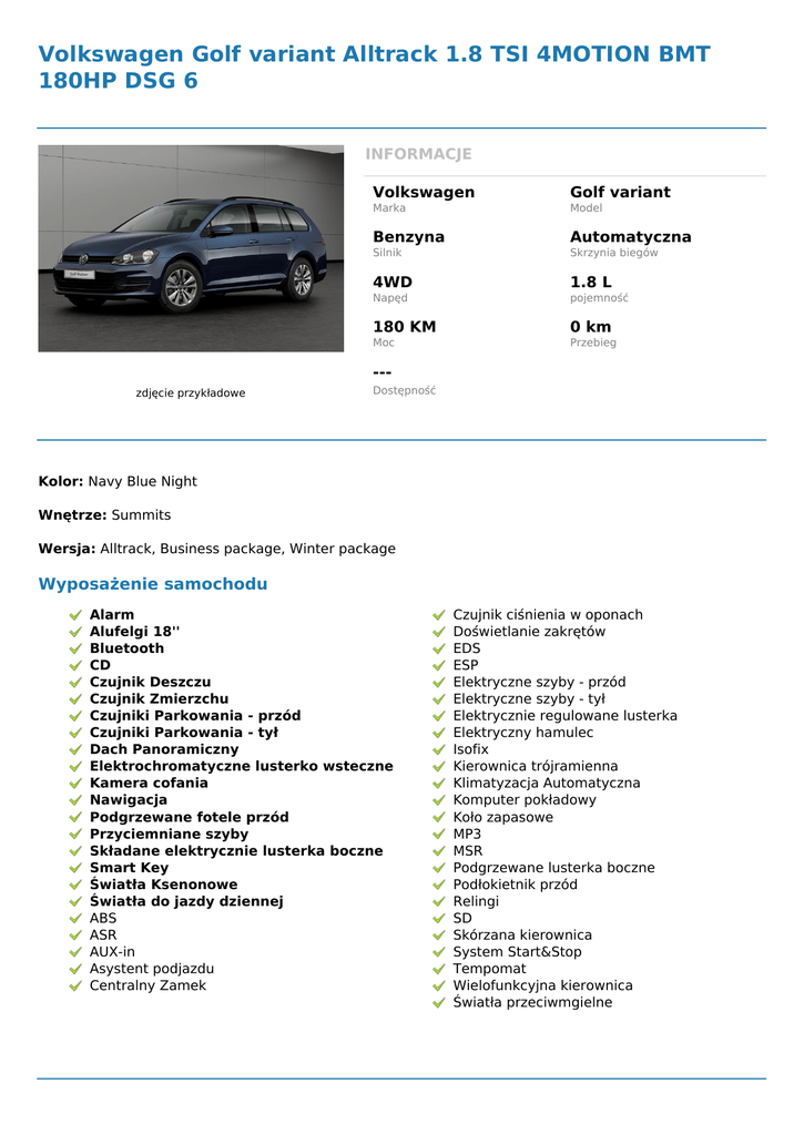Volkswagen Golf variant Alltrack 1.8 TSI 4MOTION BMT 180HP DSG 6 INFORMACJE Volkswagen Golf variant Marka Model Benzyna Automatyczna Silnik Skrzynia biegów 4WD 1.8 L Napęd pojemność 180 KM 0 km Moc Przebieg --zdjęcie przykładowe Dostępność Kolor: Navy Blue Night Wnętrze: Summits Wersja: Alltrack, Business package, Winter package Wyposażenie samochodu Alarm Alufelgi 18'' Bluetooth CD Czujnik Deszczu Czujnik Zmierzchu Czujniki Parkowania - przód Czujniki Parkowania - tył Dach Panoramiczny Elektrochromatyczne lusterko wsteczne Kamera cofania Nawigacja Podgrzewane fotele przód Przyciemniane szyby Składane elektrycznie lusterka boczne Smart Key Światła Ksenonowe Światła do jazdy dziennej ABS ASR AUX-in Asystent podjazdu Centralny Zamek Czujnik ciśnienia w oponach Doświetlanie zakrętów EDS ESP Elektryczne szyby - przód Elektryczne szyby - tył Elektrycznie regulowane lusterka Elektryczny hamulec Isofix Kierownica trójramienna Klimatyzacja Automatyczna Komputer pokładowy Koło zapasowe MP3 MSR Podgrzewane lusterka boczne Podłokietnik przód Relingi SD Skórzana kierownica System Start&Stop Tempomat Wielofunkcyjna kierownica Światła przeciwmgielne id: 5854 Powered by TCPDF (www.tcpdf.org)