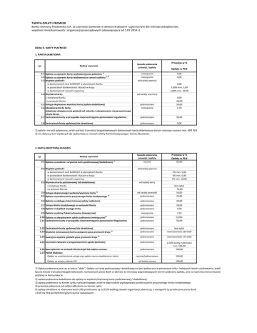 TARYFA OPŁAT I PROWIZJI Banku Ochrony Środowiska S.A. za czynności bankowe w obrocie krajowym i zgranicznym dla mikroprzedsiębiorstw, wspólnot mieszkaniowych i organizacji pozarządowych (obowiązujaca od 1.07.2014 r) DZIAŁ II. KARTY PŁATNICZE 1. KARTA DEBETOWA Lp. Sposób pobierania prowizji / opłaty Rodzaj czynności 1.1 Opłata za używanie karty wydawanej poza pakietem 1) 1.2 Opłata za używanie karty wydawanej w ramach pakietu 1) 2) 1.3 Wypłata gotówki: w bankomatach sieci EURONET w placówkach Banku w pozostałych bankomatach i kasach w kraju w bankomatach i kasach za granicą 1.4 Wymiana karty: z inicjatywy Banku na wniosek klienta 1.5 Usługa ekspresowa wymiany karty (opłata dodatkowa) 1.6 Ubezpieczenie do karty (obejmuje ubezpieczenie gotówki od rabunku i ubezpieczenie nieuprawnionego użycia karty) 1.7 Zastrzeżenie karty w przypadku nieprzestrzegania postanowień regulaminu 1.8 Zastrzeżenie karty zgubionej lub skradzionej miesięcznie miesięcznie od każdej operacji Prowizja w % Opłaty w PLN 5,00 4,00 0,00 3,00% min. 5,00 3,00% min. 10,00 od każdej wymiany jednarozowo miesięcznie 0,00 50,00 50,00 1,70 jednarazowo 50,00 jednarazowo 0,00 1) opłata nie jest pobierana, jeżeli wartość transakcji bezgotówkowych dokonanych kartą debetową w danym miesiącu wynosi min. 400 PLN. 2) nie dotyczy kart wydanych do rachunków w ramach oferty Konta Elastycznego i Konta Ekostarter. 2. KARTA KREDYTOWA BUSINESS Lp. Rodzaj czynności 2.1 Opłata za wadanie i używanie karty podstawowej/dodatkowej 1) 2.2 Wypłata gotówki: w bankomatach sieci EURONET w placówkach Banku w pozostałych bankomatach i kasach w kraju w bankomatach i kasach za granicą 2.3 Wymiana karty podstawowej lub dodatkowej: z inicjatywy Banku na wniosek Klienta 2.4 Usługa ekspresowego wydania/wymiany karty 2) 2.5 Opłata za przekroczenie przyznanego limitu kredytowego 3) Sposób pobierania prowizji / opłaty Prowizja w % Opłaty w PLN rocznie 95,00 od każdej operacji 3% min. 5,00 4% min. 5,00 4% min. 10,00 od każdej karty od każdej przesyłki jednarozowo bez opłat 70,00 50,00 20,00 2.6 Opłata za obsługę nieterminowej spłaty zadłużenia jednarozowo 40,00 2.7 Zmiana limitu kredytowego na wniosek Klienta 2.8 Opłata za duplikat wyciągu karty jednarozowo jednarozowo 20,00 5,00 miesięcznie 7,20 2.10 Opłata za ubezpieczenie spłaty zadłużenia (miesięcznie) 2.11 Zastrzeżenie karty w przypadku nieprzestrzegania postanowień Regulaminu jednarozowo jednarozowo 0,30% 50,00 2.12 Zastrzeżenie karty zgubionej lub skradzionej 2.13 Wydanie tymczasowej karty zastępczej poza granicami kraju 5) jednarozowo jednarozowo bez opłat równowartość 250 USD 2.14 Awaryjna wypłata gotówki poza granicami kraju 5) jednarozowo równowartość 175 USD 2.15 Czynności związane z przygotowaniem ugody bankowej jednarozowo 2.16 Sporządzenie na wniosek klienta kopii lub odpisu umowy 2.17 Pakiet klubowy: Opłata za uruchomienie usługi oraz opłata roczna (pobierana z dołu) jednarozowo 1,50% kwoty należności min. 100,00 100,00 rocznie/jednorazowo 100,00 od każdej wizyty 100,00 2.9 Opłata za płatny Pakiet ochronny (miesięcznie) 4) Opłata za wizytę salonie VIP 1) Opłata pobierana jest raz w roku z "dołu". Opłata za kartę podstawową i dodatkową nie jest pobierana w pierwszym roku i kolejnych latach użytkowania, jeżeli łączna kwota transakcji bezgotówkowych, rozliczonych przez Bank w okresie 12 miesięcy poprzedzających termin pobrania opłaty, jest co najmniej równa kwocie podanej w Komunikacie. 2) opłata pobierana dodatkowo do opłaty za wydanie/wymianę karty podstawowej / dodatkowej 3) opłata pobierana na koniec cyklu rozliczeniowego, jeżeli w jego trakcie występowało przekroczenie przyznanego limitu kredytowego 4) prowizja pobierana od salda zadłużenia na koniec cyklu 5) opłaty określone w równowartości USD przeliczane są na EUR według stawek organizacji płatniczej, a następnie są przeliczone przez Bank z EUR na PLN po Referencyjnym kursie walutowym