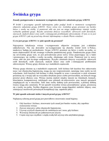 Świńska grypa Zasady postępowania w momencie wystąpienia objawów zakażenia grypą A/H1N1 W krótki i przystępny sposób informujemy jakie podjąć kroki w momencie wystąpienia objawów zakażenia grypą A/H1N1. Nowy wirus tzw. świńskiej grypy przenosi się bardzo łatwo z osoby na osobę. A ponieważ nikt nie jest na niego uodporniony istnieje ryzyko wybuchu epidemii grypy. Ryzyko zarażenia dotyczy wszystkich: zdrowych osób dorosłych, starszych, małych dzieci oraz osób z istniejącymi problemami zdrowotnymi. O tym co to jest grypa A/H1N1 i jak się przed nią chronić informujemy w dziale Warto wiedzieć. Co to jest grypa A/H1N1 i w jaki sposób się przenosi? Najczęstsza lokalizacja wirusa i występowanie objawów związane jest z układem oddechowym. Nie ma dowodów na występowanie tej choroby wśród świń w Polsce, naukowcy badają jej pochodzenie. Grypa A/H1N1 przenosi się łatwo z osoby na osobę, co może doprowadzić do tak zwanego wybuchu pandemicznej grypy. Pandemiczna grypa różni się od zwykłej grypy tym, że jest powodowana przez nowy wirus pojawiający się u ludzi i przenoszący się szybko z osoby na osobę, obejmując cały świat. Ponieważ jest to nowy wirus, nikt nie jest na niego uodporniony. Ryzyko zarażenia dotyczy wszystkich: zdrowych osób dorosłych, osób starszych, małych dzieci oraz osób z istniejącymi problemami zdrowotnymi. Wirusy grypy złożone są z maleńkich cząsteczek. Wirusy grypy złożone są z maleńkich cząsteczek. Jeśli kichasz lub kaszlesz bez zakrywania nosa i ust chusteczką higieniczną, mogą się one rozprzestrzenić, narażając inne osoby na ich wdychanie. Jeśli kaszlesz lub kichasz w dłoń, kropelki te wraz z zawartymi w nich wirusami przeniosą się z twojej ręki na wszystkie dotykane przez ciebie powierzchnie, na których mogą przeżyć przez dłuższy czas. Wirusy można znaleźć między innymi na: klamkach, kranach, klawiaturze komputerowej, telefonach oraz pilotach do telewizorów oraz innych sprzętach znajdujących się w otoczeniu. Jeśli inne osoby dotkną tych powierzchni, a później dotkną twarzy mogą ulec zarażeniu. W ten sposób wszystkie wirusy przeziębienia i grypy, przenoszą się z osoby na osobę. Szybka diagnoza oraz leczenie mogą złagodzić niektóre objawy oraz zmniejszyć możliwość poważnych komplikacji (np. zapalenie płuc). W jaki sposób ochronić siebie i innych przed grypą A/H1N1? Najlepszą ochroną przed grypą jest prawidłowe stosowanie zasad higieny. 1. Gdy kaszlesz i kichasz, stosowanie tych zasad jest bardzo ważne, aby zapobiec roznoszeniu wirusa: 2. Zawsze miej przy sobie chusteczki higieniczne. 3. Używaj czystych chusteczek do zasłonięcia ust i nosa, gdy kichasz. 4. Wyrzucaj chusteczki po jednorazowym użyciu. 5. Często myj ręce mydłem i ciepłą wodą lub używaj żelu antybakteryjnego. Zasady postępowania w momencie wystąpienia objawów zakażenia grypą A/H1N1 Jeśli masz jeden lub więcej objawów z podanych poniżej gorączka, trudności w oddychaniu, kaszel, ból gardła, katar z płynną wydzieliną lub zatkanym nosem, bóle mięśniowe i stawowe, ból głowy, dreszcze, mogą występować wymioty i biegunka. Ogranicz bliskie kontakty z innymi osobami. Unikaj większych skupisk ludzkich. Zasłaniaj usta i nos podczas kaszlu i kichania, myj często ręce. Skontaktuj się ze swoim lekarzem podstawowej opieki zdrowotnej. Po zebraniu wywiadu i zbadaniu pacjenta lekarz, jeżeli podejrzewa zakażenie wirusem A/H1N1 podejmuje decyzję o leczeniu w warunkach domowych lub hospitalizacji, biorąc pod uwagę stan kliniczny pacjenta. Transport osoby, u której wystąpią objawy grypowe nie powinien odbywać się środkami transportu zbiorowego. Zadbaj o siebie i swoją rodzinę Informacja dla lekarzy, organów założycielskich i dyrektorów zakładów opieki zdrowotnej w sprawie podstawowych zasad postępowania w związku z przypadkami grypy A/H1N1 Zalecamy, co następuje: Osoby, u której wystąpiły objawy infekcji górnych dróg oddechowych (gorączka, katar, kaszel, bóle mięśniowe, ból gardła, itd.) winny zgłosić się do swoich lekarzy podstawowej opieki zdrowotnej. Lekarz POZ po ustaleniu dodatniego wywiadu epidemiologicznego ( objawy grypy w ciągu 10 dni od możliwego kontaktu - pobytu na terenach występowania ognisk grypy świń lub kontaktu z osobą chora na grypę świń) kieruje pacjenta do najbliższego oddziału zakaźnego, powiadamiając o tym właściwą stację sanitarnoepidemiologiczną. Lekarz chorób zakaźnych hospitalizuje chorego w przypadku klinicznego podejrzenia grypy. Wdraża się proces diagnostyczny celem ustalenia patogenu. W przypadkach ciężkich przy braku przeciwwskazań zaleca się podawanie leków antywirusowych pod kontrolą lekarzy chorób zakaźnych. Komunikaty Głównego Inspektoratu Sanitarnego, aktualizowane codzienne o godzinie 12, dostępne są na stronie internetowej www.pis.gov.pl. Komunikaty zawierać będą między innymi informacje nt. aktualnej sytuacji epidemiologicznej oraz aktualne zalecenia. Warszawa, 28.04.2009, godz. 10.00 Ulotka Rządowego Centrum Bezpieczeństwa: Kliknij Komunikaty Wojewódzkiego Inspektoratu Sanitarnego Kliknij poniższy link http://www.wsse.bialystok.pl/ Wykaz szpitali województwa podlaskiego (wg Konsultanta krajowego) do hospitalizacji chorób niebezpiecznych na terenie województwa podlaskiego: http://www.wsse.bialystok.pl/index.php?option=com_content&view=article&id=219:wy znaczone-szpitale-wg-konsultanta-krajowego&catid=69:grypa-ah1n1&Itemid=94