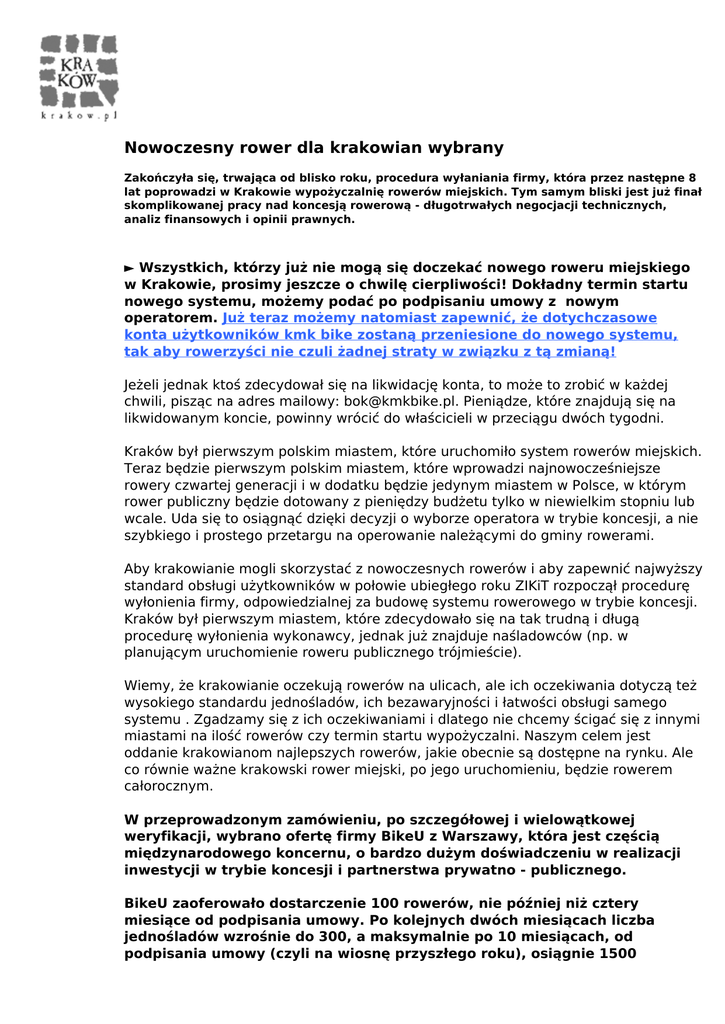 Nowoczesny rower dla krakowian wybrany Zakończyła się, trwająca od blisko roku, procedura wyłaniania firmy, która przez następne 8 lat poprowadzi w Krakowie wypożyczalnię rowerów miejskich. Tym samym bliski jest już finał skomplikowanej pracy nad koncesją rowerową - długotrwałych negocjacji technicznych, analiz finansowych i opinii prawnych. ► Wszystkich, którzy już nie mogą się doczekać nowego roweru miejskiego w Krakowie, prosimy jeszcze o chwilę cierpliwości! Dokładny termin startu nowego systemu, możemy podać po podpisaniu umowy z nowym operatorem. Już teraz możemy natomiast zapewnić, że dotychczasowe konta użytkowników kmk bike zostaną przeniesione do nowego systemu, tak aby rowerzyści nie czuli żadnej straty w związku z tą zmianą! Jeżeli jednak ktoś zdecydował się na likwidację konta, to może to zrobić w każdej chwili, pisząc na adres mailowy: [email protected]. Pieniądze, które znajdują się na likwidowanym koncie, powinny wrócić do właścicieli w przeciągu dwóch tygodni. Kraków był pierwszym polskim miastem, które uruchomiło system rowerów miejskich. Teraz będzie pierwszym polskim miastem, które wprowadzi najnowocześniejsze rowery czwartej generacji i w dodatku będzie jedynym miastem w Polsce, w którym rower publiczny będzie dotowany z pieniędzy budżetu tylko w niewielkim stopniu lub wcale. Uda się to osiągnąć dzięki decyzji o wyborze operatora w trybie koncesji, a nie szybkiego i prostego przetargu na operowanie należącymi do gminy rowerami. Aby krakowianie mogli skorzystać z nowoczesnych rowerów i aby zapewnić najwyższy standard obsługi użytkowników w połowie ubiegłego roku ZIKiT rozpoczął procedurę wyłonienia firmy, odpowiedzialnej za budowę systemu rowerowego w trybie koncesji. Kraków był pierwszym miastem, które zdecydowało się na tak trudną i długą procedurę wyłonienia wykonawcy, jednak już znajduje naśladowców (np. w planującym uruchomienie roweru publicznego trójmieście). Wiemy, że krakowianie oczekują rowerów na ulicach, ale ich oczekiwania dotyczą też wysokiego standardu jednośladów, ich bezawaryjności i łatwości obsługi samego systemu . Zgadzamy się z ich oczekiwaniami i dlatego nie chcemy ścigać się z innymi miastami na ilość rowerów czy termin startu wypożyczalni. Naszym celem jest oddanie krakowianom najlepszych rowerów, jakie obecnie są dostępne na rynku. Ale co równie ważne krakowski rower miejski, po jego uruchomieniu, będzie rowerem całorocznym. W przeprowadzonym zamówieniu, po szczegółowej i wielowątkowej weryfikacji, wybrano ofertę firmy BikeU z Warszawy, która jest częścią międzynarodowego koncernu, o bardzo dużym doświadczeniu w realizacji inwestycji w trybie koncesji i partnerstwa prywatno - publicznego. BikeU zaoferowało dostarczenie 100 rowerów, nie później niż cztery miesiące od podpisania umowy. Po kolejnych dwóch miesiącach liczba jednośladów wzrośnie do 300, a maksymalnie po 10 miesiącach, od podpisania umowy (czyli na wiosnę przyszłego roku), osiągnie 1500 rowerów. Firma jest przekonana, że będzie w stanie utrzymać i rozwijać system tylko w oparciu o odpłatne wypożyczenia. W swojej ofercie oczekuje od Miasta Kraków miesięcznej dopłaty, w wysokości 1zł za rower (co oznacza dla gminy kilkanaście milionów oszczędności). Co więcej dochody ze znajdującej się na rowerach powierzchni reklamowej będą w całości przekazywane do miejskiego budżetu. Same rowery, które posłużą mieszkańcom Krakowa przez najbliższe 8 lat, są bardzo nowoczesne. Charakteryzują się dużą wytrzymałością i wygodną, wyprostowaną pozycją podczas jazdy. Fabrycznie wyposażone są w wał cardana zastępujący łańcuch, a zatem już nigdy użytkownicy nie pobrudzą sobie nogawek. Dodatkowe wyposażenie to m.in. koszyk stalowy, komputer pokładowy, aktywny gps i oświetlenie LED. Podpisanie umowy z firmą BikeU będzie możliwe po upływie 10 dni od ogłoszenia wyników postępowania. Powered by TCPDF (www.tcpdf.org)