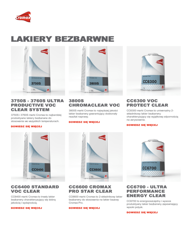 LAKIERY BEZBARWNE 3750S - 3760S ULTRA 3800S PRODUCTIVE VOC CHROMACLEAR VOC CLEAR SYSTEM 3800S marki Cromax to najwyższej jakości 3750S i 3760S marki Cromax to najbardziej produktywne lakiery bezbarwne do stosowania we wszystkich temperaturach. lakier bezbarwny gwarantujący doskonały rezultat naprawy. CC6300 VOC PROTECT CLEAR CC6300 marki Cromax to uniwersalny 2składnikowy lakier bezbarwny charakteryzujący się wyjątkową odpornością na zarysowania. DOWIEDZ SIĘ WIĘCEJ DOWIEDZ SIĘ WIĘCEJ DOWIEDZ SIĘ WIĘCEJ CC6400 STANDARD VOC CLEAR CC6600 CROMAX PRO STAR CLEAR CC6400 marki Cromax to trwały lakier bezbarwny charakteryzujący się dobrą jakością i wydajnością. CC6600 marki Cromax to 2-składnikowy lakier bezbarwny do stosowania na lakier bazowy Cromax Pro. DOWIEDZ SIĘ WIĘCEJ DOWIEDZ SIĘ WIĘCEJ CC6700 - ULTRA PERFORMANCE ENERGY CLEAR CC6700 to energooszczędny i wysoce produktywny lakier bezbarwny zapewniający wysoki połysk. DOWIEDZ SIĘ WIĘCEJ VR-1120 VALUECLEAR VOC 1200S UNIVERSAL CLEAR 3050S CHROMACLEAR VR-1120 marki Cromax to 2-składnikowy lakier bezbarwny do uniwersalnych zastosowań w przystępnej cenie. 1200S marki Cromax to łatwy w użyciu, 2składnikowy lakier bezbarwny do uniwersalnych zastosowań.1200S is a userfriendly 2K clearcoat that can be applied universally. 3050S marki Cromac to lakier bezbarwny zapewniający doskonały wygląd powłoki. DOWIEDZ SIĘ WIĘCEJ DOWIEDZ SIĘ WIĘCEJ DOWIEDZ SIĘ WIĘCEJ DOWIEDZ SIĘ WIĘCEJ http://www.axaltacoatingsystems.com/content/cromax_pl/pl_PL/products/product-types/clearcoats.html Follow Share