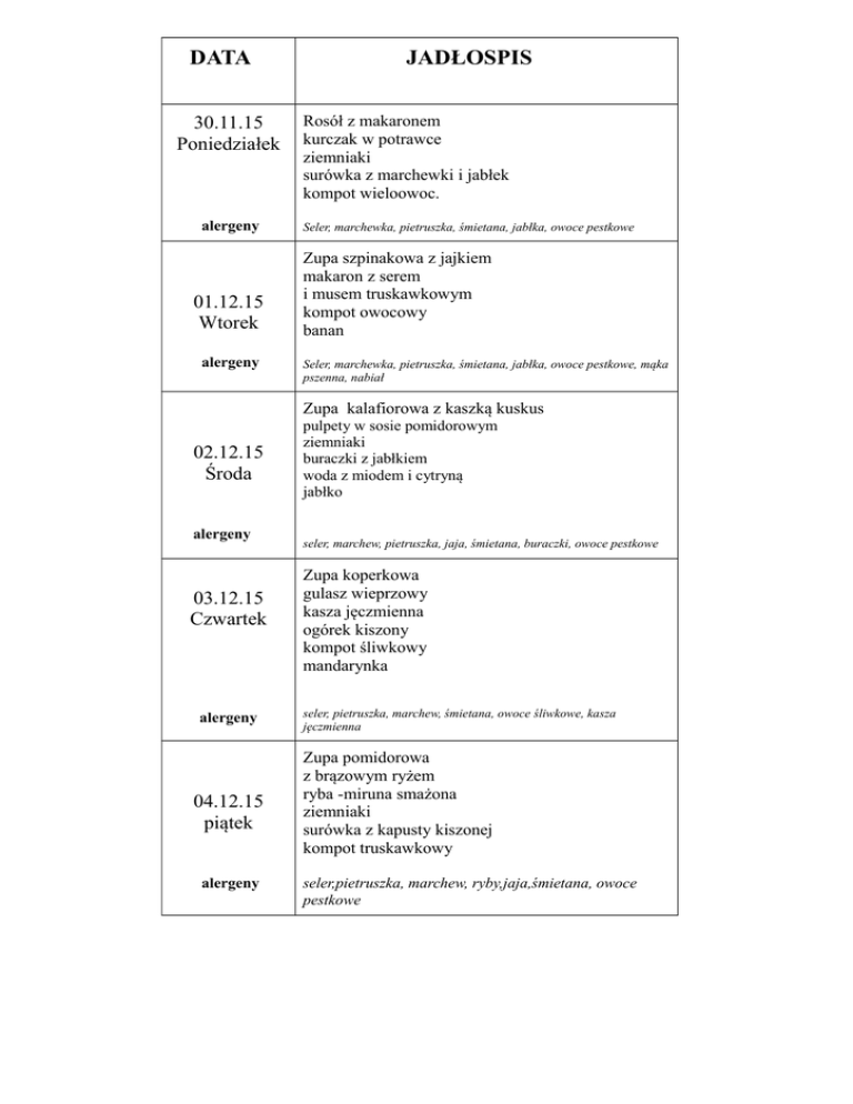 DATA 30.11.15 Poniedziałek alergeny 01.12.15 Wtorek alergeny JADŁOSPIS Rosół z makaronem kurczak w potrawce ziemniaki surówka z marchewki i jabłek kompot wieloowoc. Seler, marchewka, pietruszka, śmietana, jabłka, owoce pestkowe Zupa szpinakowa z jajkiem makaron z serem i musem truskawkowym kompot owocowy banan Seler, marchewka, pietruszka, śmietana, jabłka, owoce pestkowe, mąka pszenna, nabiał Zupa kalafiorowa z kaszką kuskus 02.12.15 Środa alergeny 03.12.15 Czwartek alergeny 04.12.15 piątek alergeny pulpety w sosie pomidorowym ziemniaki buraczki z jabłkiem woda z miodem i cytryną jabłko seler, marchew, pietruszka, jaja, śmietana, buraczki, owoce pestkowe Zupa koperkowa gulasz wieprzowy kasza jęczmienna ogórek kiszony kompot śliwkowy mandarynka seler, pietruszka, marchew, śmietana, owoce śliwkowe, kasza jęczmienna Zupa pomidorowa z brązowym ryżem ryba -miruna smażona ziemniaki surówka z kapusty kiszonej kompot truskawkowy seler,pietruszka, marchew, ryby,jaja,śmietana, owoce pestkowe DATA ŚNIADANIE OBIAD PODWIECZOREK sok jabłkowy Poniedziałek 29.11.15 Zupa mleczna płatki zbożowe kajzerka z masłem Rosół z makaronem kurczak w potrawce ziemniaki surówka z marchewki i jabłek kompot wieloowoc. Bułka grahamka z masłem twarożek z warzywami pomidory kawa zbożowa z mlekiem jabłko alergeny mleko,zboża,mąka pszenna Seler,marchewka, pietruszka, śmietana, jabłka, owoce pestkowe zboża,mleko, mąka pszenna, żytnia, jęczmień Woda mineralna z sokiem Wtorek 01.12.15 alergeny Środa 02.12.15 alergeny Czwartek 03.12.15 Chleb ziarnisty z masłem sałata zie. polędwica drobiowa pomidory herbata z miodem i cytryną mandarynka zboża,mleko, owoce pestowe, mąki pszenna, żytnia Bułka kanapkowa z masłem twarożek śmiet. pomidory rzodkiewka Herbata z miodem i cytryną banan zboża ,mleko, mąka pszenna, cytryna, miód Rogalik z masłem miód pszczeli dżem malinowy kakao banan alergeny zboża,mleko, owoce pestkowe, miód, kakao, mąka pszenna Zupa szpinakowa z jajkiem makaron z serem i musem truskawkowym kompot śliwkowy seler, marchewka, pietruszka, jajka,śmietana, owoce pestkowe, mąka pszenna, mleko Sok marchewkowy Zupa kalafiorowa z kaszką kuskus pulpety w sosie pomidorowym ziemniaki buraczki z jabłkiem woda z miodem i cytryną seler,marchew, pietruszka, jaja,śmietana, buraczki, owoce pestkowe Sok pomarańczowy Zupa koperkowa gulasz wieprzowy kasza jęczmienna ogórek kiszony kompot śliwkowy seler,pietruszka, marchew, śmietana, owoce śliwkowe, kasza jęczmienna Zapiekanki z bułki szynki i żółtego sera ketchup herbata malinowa zboża,mleko, mąka pszenna, owoce pestkowe Jogurt naturalny z musem owocowym herbatniki pełnoziarniste banan woda mineralna mleko,zboża, owoce pestkowe, mąki żytnia i pszenna Serek waniliowy grahamka z masłem herbata z miodem i cytryną mleko,zboża, mąki pszenna, żytnia, miód , cytryna Sok jabłkowy Piątek 04.12.15 Chleb z masłem pasta jajeczna ze szczypiorkiem herbata z miodem i cytryną 4 gruszka alergeny zboża,jaja,mleko, mąka pszenna, miód, owoce pestkowe, Zupa pomidorowa z brązowym ryżem ryba -miruna smażona ziemniaki surówka z kapusty kiszonej kompot truskawkowy Ciasto drożdżowe z jabłkami kawa zbożowa z mlekiem zboża,jaja, jęczmień, owoce pestkowe seler,pietruszka, marchew, ryby,jaja,śmietana, owoce pestkowe