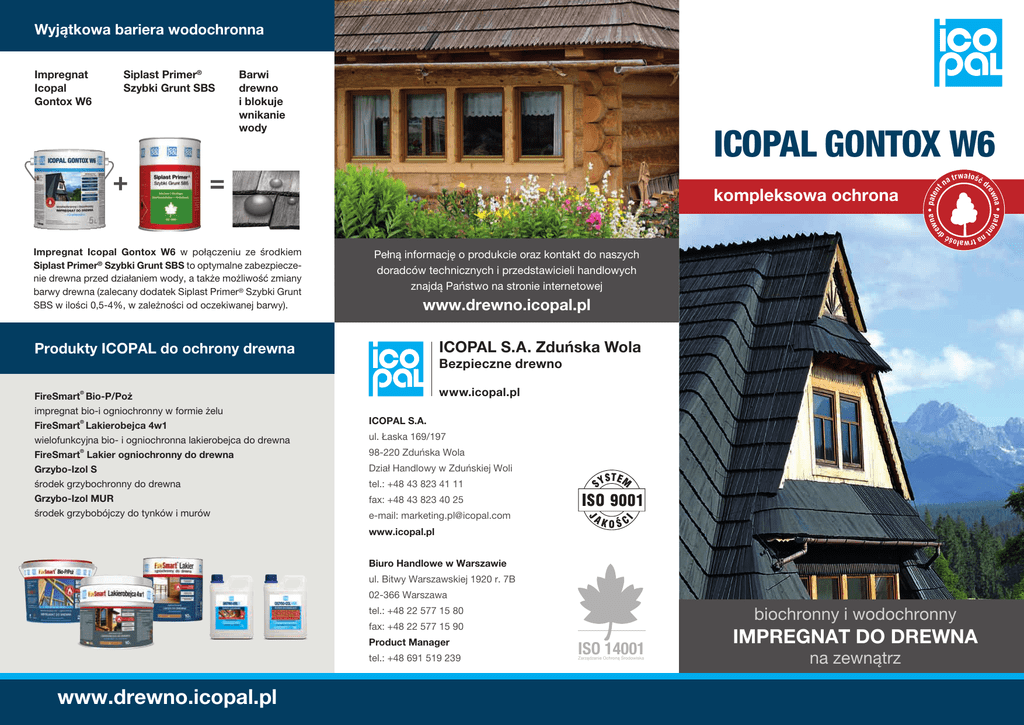 Wyjątkowa bariera wodochronna Barwi drewno i blokuje wnikanie wody ICOPAL GONTOX W6 na t r wa ł o ś ć d re w na • pat e wa ł o ś ć d www.drewno.icopal.pl ICOPAL S.A. Zduńska Wola Produkty ICOPAL do ochrony drewna Bezpieczne drewno www.icopal.pl ® FireSmart Bio-P/Poż impregnat bio-i ogniochronny w formie żelu ® FireSmart Lakierobejca 4w1 wielofunkcyjna bio- i ogniochronna lakierobejca do drewna ® FireSmart Lakier ogniochronny do drewna Grzybo-Izol S środek grzybochronny do drewna Grzybo-Izol MUR środek grzybobójczy do tynków i murów a tr Pełną informację o produkcie oraz kontakt do naszych doradców technicznych i przedstawicieli handlowych znajdą Państwo na stronie internetowej ICOPAL S.A. ul. Łaska 169/197 98-220 Zduńska Wola Dział Handlowy w Zduńskiej Woli tel.: +48 43 823 41 11 fax: +48 43 823 40 25 e-mail: [email protected] www.icopal.pl Biuro Handlowe w Warszawie ul. Bitwy Warszawskiej 1920 r. 7B 02-366 Warszawa biochronny i wodochronny tel.: +48 22 577 15 80 fax: +48 22 577 15 90 Product Manager tel.: +48 691 519 239 www.drewno.icopal.pl ISO 14001 Zarządzanie Ochroną Środowiska impregnat do drewna na zewnątrz tn Impregnat Icopal Gontox W6 w połączeniu ze środkiem Siplast Primer® Szybki Grunt SBS to optymalne zabezpieczenie drewna przed działaniem wody, a także możliwość zmiany barwy drewna (zalecany dodatek Siplast Primer® Szybki Grunt SBS w ilości 0,5-4%, w zależności od oczekiwanej barwy). n re w na kompleksowa ochrona nt Siplast Primer® Szybki Grunt SBS • pat e Impregnat Icopal Gontox W6 ICOPAL GONTOX W6 Doskonały efekt: SZCZEGÓLNIE ZALECANY DO: • nadaje drewnu cieplejszą barwę, • ochrony drewna w klimacie górskim, • podkreśla naturalny rysunek drewna, • drewna iglastego, trudno nasycalnego, • blokuje wnikanie wody, •drewnianych elementów pokrycia dachowego (gontów drewnianych), • nie tworzy powłoki lakierowej, • konserwuje stare drewno, • ogranicza pękanie i paczenie się drewna, • spowalnia naturalny proces starzenia drewna, d n tn re w na • pat e a tr wa ł o ś ć d ¸ • drewnianych elementów konstrukcyjnych parkanów (słupki, żerdzie, sztachety). • nie wymaga dodatkowego zabezpieczenia powierzchni środkiem powłokotwórczym, w na • pat e n wa ł o ś ć a tr re nt • zapewnia wieloletnią trwałość drewna, • deskowań zewnętrznych w budownictwie (okładziny elewacyjne, rusztowania, pomosty), • doskonale wnika w drewno i szybko schnie, Środek rozpuszczalnikowy typu oleistego do ochrony, konserwacji i renowacji drewna. • po wyschnięciu nie podnosi palności drewna. Kompleksowa ochrona: rzed korozją biologiczną: p grzybami domowymi, pleśniami, glonami, bakteriami i owadami SPOSÓB STOSOWANIA: ¸ przed działaniem wody ¸ przed promieniami UV ¸ zterokrotnie zmniejsza c nasiąkliwość drewna Nanosić na suche drewno metodą 2- lub 3-krotnego smarowania lub natryskiem, w odstępach czasu około 4 h lub metodą kąpieli całych elementów przez około 30 min. ZALECANE ZUŻYCIE: Łącznie 0,28 do 0,33 litra wyrobu na 1 m² powierzchni (przy 2-3-krotnej aplikacji) lub 22 do 26 litrów wyrobu na 1 m³ drewna (przy nasycaniu wgłębnym). www.bezpiecznedrewno.pl