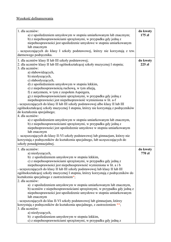 Wysokość dofinansowania 1. dla uczniów: a) z upośledzeniem umysłowym w stopniu umiarkowanym lub znacznym; b) z niepełnosprawnościami sprzężonymi, w przypadku gdy jedną z niepełnosprawności jest upośledzenie umysłowe w stopniu umiarkowanym lub znacznym - uczęszczających do klasy I szkoły podstawowej, którzy nie korzystają z tzw. darmowego podręcznika. do kwoty 175 zł 1. dla uczniów klasy II lub III szkoły podstawowej; 2. dla uczniów klasy II lub III ogólnokształcącej szkoły muzycznej I stopnia; 3. dla uczniów: a) słabowidzących, b) niesłyszących, c) słabosłyszących, d) z upośledzeniem umysłowym w stopniu lekkim, e) z niepełnosprawnością ruchową, w tym afazją, f) z autyzmem, w tym z zespołem Aspergera, g) z niepełnosprawnościami sprzężonymi, w przypadku gdy jedną z niepełnoprawności jest niepełnoprawność wymieniona w lit. a-f - uczęszczających do klasy II lub III szkoły podstawowej albo klasy II lub III ogólnokształcącej szkoły muzycznej I stopnia, którzy nie korzystają z podręczników do kształcenia specjalnego; 4. dla uczniów: a) z upośledzeniem umysłowym w stopniu umiarkowanym lub znacznym, b) z niepełnosprawnościami sprzężonymi, w przypadku gdy jedną z niepełnoprawności jest upośledzenie umysłowe w stopniu umiarkowanym lub znacznym - uczęszczających do klasy II-VI szkoły podstawowej lub gimnazjum, którzy nie korzystają z podręczników do kształcenia specjalnego, lub uczęszczających do szkoły ponadgimnazjalnej. do kwoty 225 zł 1. dla uczniów: a) niesłyszących, b) z upośledzeniem umysłowym w stopniu lekkim, c) z niepełnosprawnościami sprzężonymi, w przypadku gdy jedną z niepełnosprawności jest niepełnosprawność wymieniona w lit. a i b - uczęszczających do klasy II lub III szkoły podstawowej lub klasy II lub III ogólnokształcącej szkoły muzycznej I stopnia, którzy korzystają z podręczników do kształcenia specjalnego z zastrzeżeniem*; 2. dla uczniów: a) z upośledzeniem umysłowym w stopniu umiarkowanym lub znacznym, b) uczniów z niepełnosprawnościami sprzężonymi, w przypadku gdy jedną z niepełnosprawności jest upośledzenie umysłowe w stopniu umiarkowanym lub znacznym - uczęszczających do klas II-VI szkoły podstawowej lub gimnazjum, którzy korzystają z podręczników do kształcenia specjalnego, z zastrzeżeniem **; 3. dla uczniów: a) niesłyszących, b) z upośledzeniem umysłowym w stopniu lekkim, c) z niepełnosprawnościami sprzężonymi, w przypadku gdy jedną z do kwoty 770 zł niepełnosprawności jest niepełnosprawność wymieniona w lit. a i b - uczęszczających do klas IV-VI szkoły podstawowej, klas IV-VI ogólnokształcącej szkoły muzycznej I stopnia lub klas I-III ogólnokształcącej szkoły baletowej, którzy korzystają z podręczników do kształcenia specjalnego, z zastrzeżeniem ***. 1. dla uczniów klasy VI szkoły podstawowej; 2. dla uczniów klasy VI ogólnokształcącej szkoły muzycznej I stopnia; 3. dla uczniów klasy III ogólnokształcącej szkoły baletowej, 4. dla uczniów: a) słabowidzących, b) niesłyszących, c) słabosłyszących, d) z upośledzeniem umysłowym w stopniu lekkim, e) z niepełnosprawnością ruchową, w tym afazją, f) z autyzmem, w tym z zespołem Aspergera, g) z niepełnosprawnościami sprzężonymi, w przypadku gdy jedną z niepełnoprawności jest niepełnoprawność wymieniona w lit. a-f - uczęszczających do klas IV-VI szkoły podstawowej, klas IV-VI ogólnokształcącej szkoły muzycznej I stopnia lub klas I-III ogólnokształcącej szkoły baletowej, którzy nie korzystają z podręczników do kształcenia specjalnego. do kwoty 325 zł 1. dla uczniów: a) słabowidzących, b) niesłyszących, c) słabosłyszących, d) z upośledzeniem umysłowym w stopniu lekkim, e) z niepełnosprawnością ruchową, w tym afazją, f) z autyzmem, w tym z zespołem Aspergera, g) z niepełnosprawnościami sprzężonymi, w przypadku gdy jedną z niepełnoprawności jest niepełnoprawność wymieniona w lit. a-f - uczęszczających do gimnazjum, klas I-III ogólnokształcącej szkoły muzycznej II stopnia, klas I-III ogólnokształcącej szkoły sztuk pięknych lub klas IV-VI ogólnokształcącej szkoły baletowej, którzy nie korzystają z podręczników do kształcenia specjalnego. do kwoty 350 zł 1. dla uczniów: a) niesłyszących, b) z upośledzeniem umysłowym w stopniu lekkim, c) z niepełnosprawnościami sprzężonymi, w przypadku gdy jedną z niepełnosprawności jest niepełnosprawność wymieniona w lit. a i b - uczęszczających do gimnazjum, klas I-III ogólnokształcącej szkoły muzycznej II stopnia, klas I-III ogólnokształcącej szkoły sztuk pięknych lub klas IV-VI ogólnokształcącej szkoły baletowej, którzy korzystają z podręczników do kształcenia specjalnego, z zastrzeżeniem ****. do kwoty 607 zł 1. dla uczniów klasy III zasadniczej szkoły zawodowej; 2. dla uczniów: a) słabowidzących, b) niesłyszących, c) słabosłyszących, d) z upośledzeniem umysłowym w stopniu lekkim, e) z niepełnosprawnością ruchową, w tym afazją, f) z autyzmem, w tym z zespołem Aspergera, g) z niepełnosprawnościami sprzężonymi, w przypadku gdy jedną z do kwoty 390 zł niepełnoprawności jest niepełnoprawność wymieniona w lit. a-f - uczęszczających do klasy zasadniczej szkoły zawodowej. 1. dla uczniów klasy III liceum ogólnokształcącego i technikum; 2. dla uczniów klasy VI ogólnokształcącej szkoły muzycznej II stopnia; 3. dla uczniów klasy VI ogólnokształcącej szkoły sztuk pięknych; 4. dla uczniów klasy III liceum plastycznego; 5. dla uczniów klasy IX ogólnokształcącej szkoły baletowej; 6. dla uczniów: a) słabowidzących, b) niesłyszących, c) słabosłyszących, d) z upośledzeniem umysłowym w stopniu lekkim, e) z niepełnosprawnością ruchową, w tym afazją, f) z autyzmem, w tym z zespołem Aspergera, g) z niepełnosprawnościami sprzężonymi, w przypadku gdy